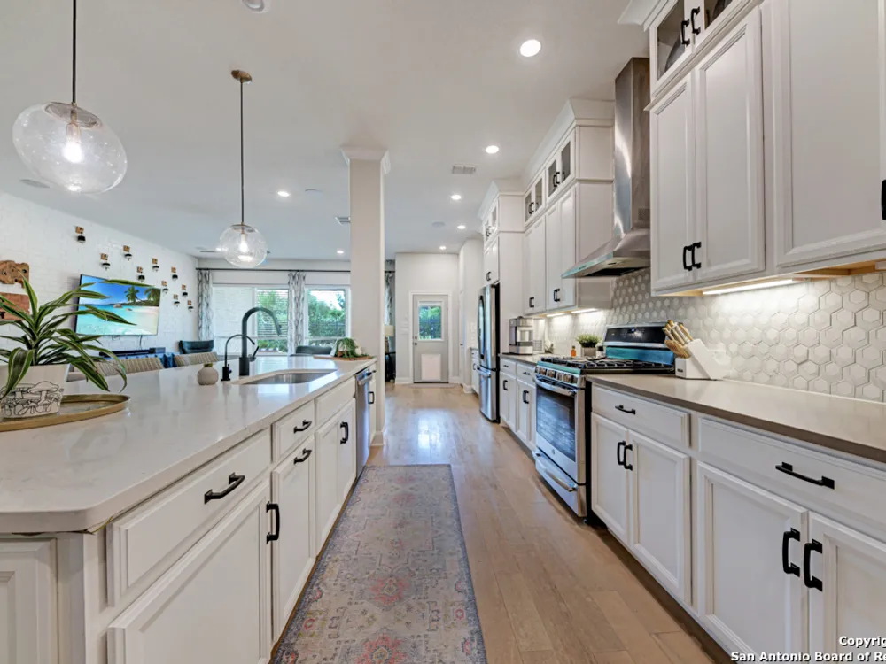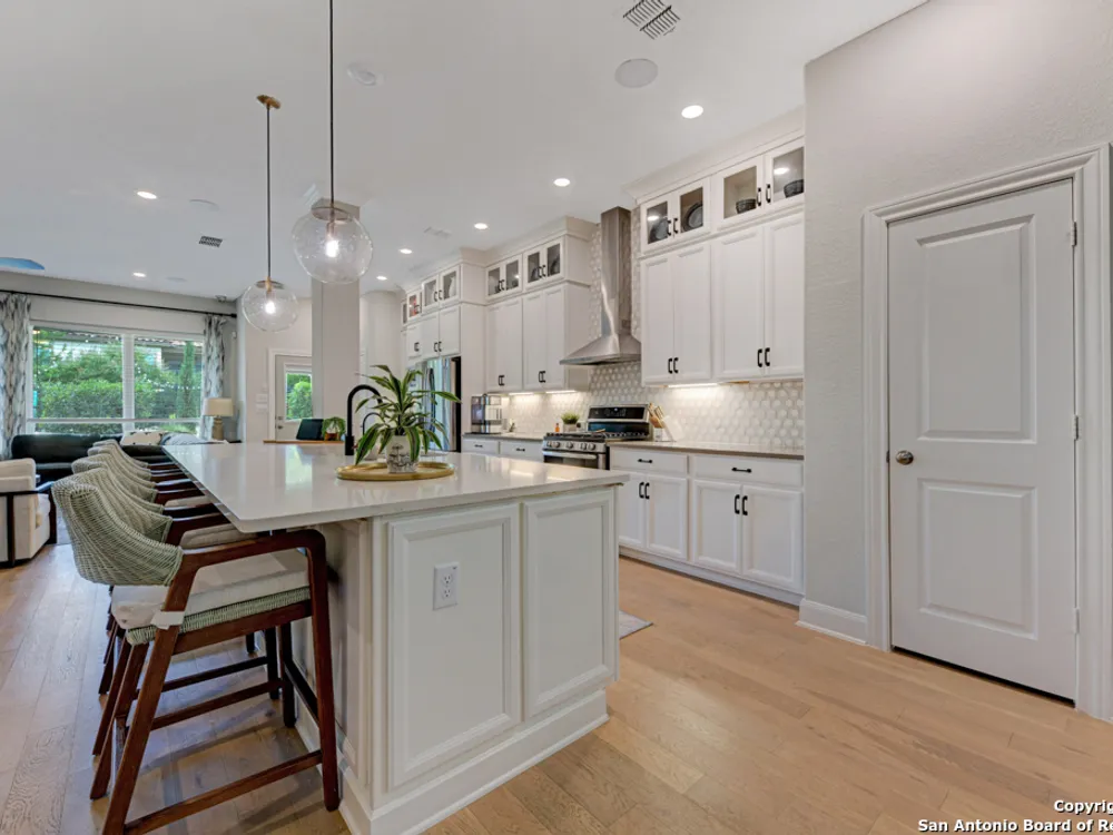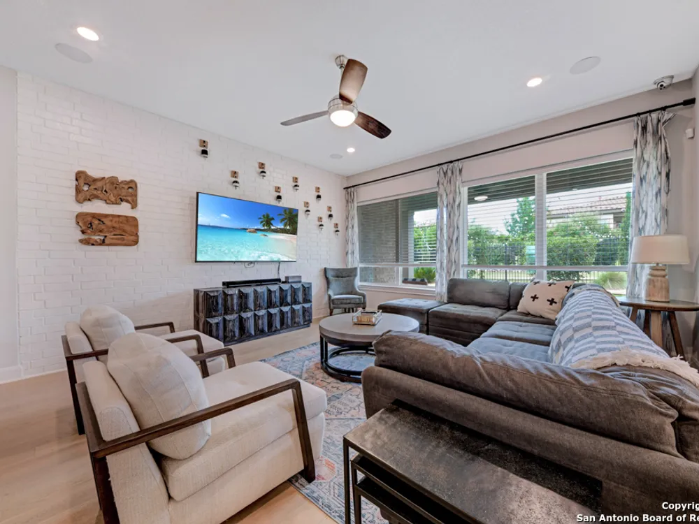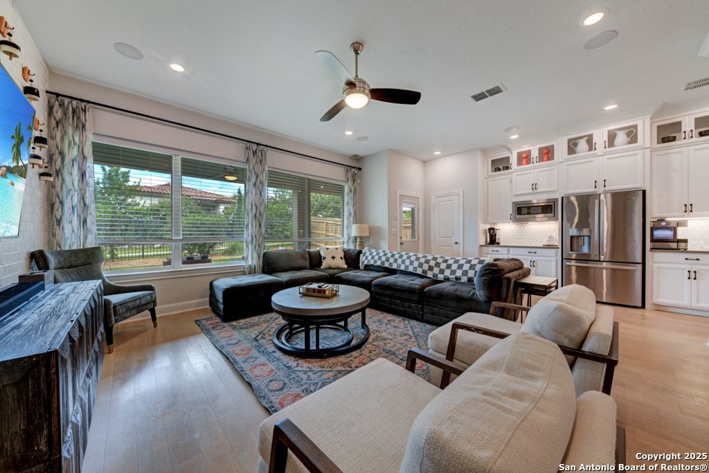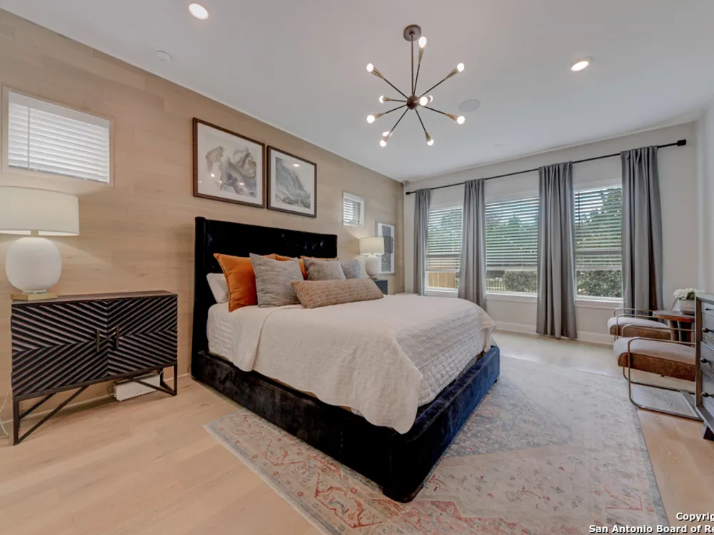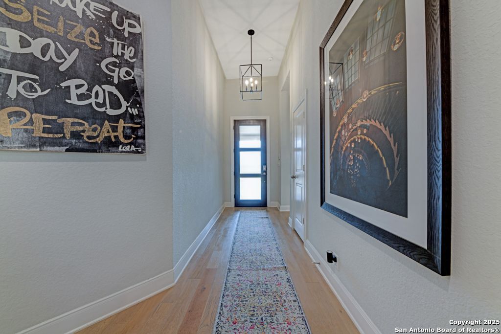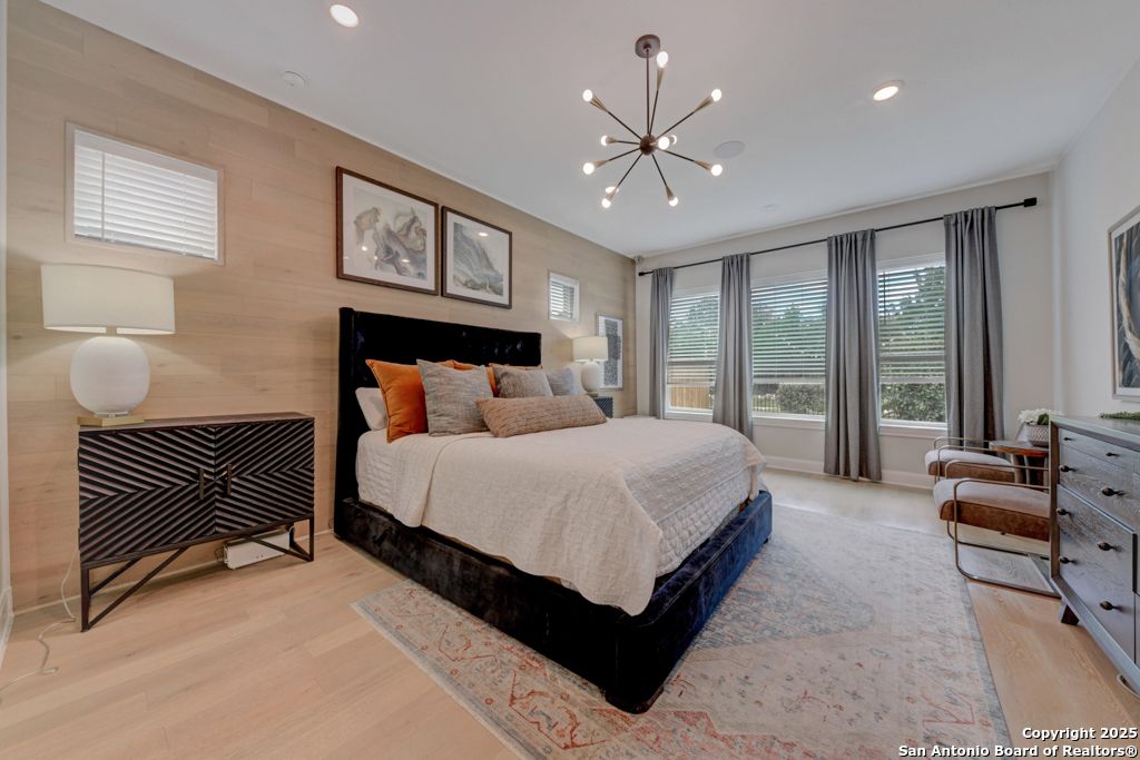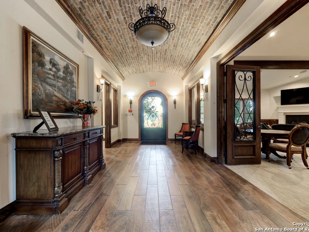 From the moment you step inside this former model home, it's clear-this is something special. Located in the prestigious, gated Campanas at Cibolo Canyons, this 2020-built gem offers a perfect blend of luxury design and everyday comfort. The open-concept layout welcomes you with gorgeous light wood flooring, wainscoting, accent walls, and a striking white brick feature in the living area. Natural light pours in through tall windows, highlighting soaring ceilings and creating an airy, inviting space. The luxury kitchen is a showstopper with quartz countertops, custom white cabinetry, a butler's area, two pantries, and stainless steel appliances. Whether you're enjoying casual meals in the breakfast nook or hosting in the formal dining room, the flow is seamless. All bedrooms are on the main floor in a smart split layout. The primary suite offers a peaceful retreat with a wood accent wall, large walk-in shower, double vanities, and a spacious closet with direct laundry access. Upstairs, a versatile bonus room with half bath is perfect for a media space, playroom, or home gym. Outside, the all-brick and stone exterior adds timeless curb appeal, while nearby walking trails invite daily strolls. As part of Campanas at Cibolo Canyons, enjoy access to resort-style pools, tennis courts, a clubhouse, fitness center, and playgrounds. Ideally located in North San Antonio's 78261, just 11 miles from JBSA-Randolph, with top-tier shopping nearby (HEB, Costco, Sprouts), and greenway expansions planned through 2026-this home offers more than comfort, it offers lifestyle. Every room in this home has something special. Come experience it for yourself.