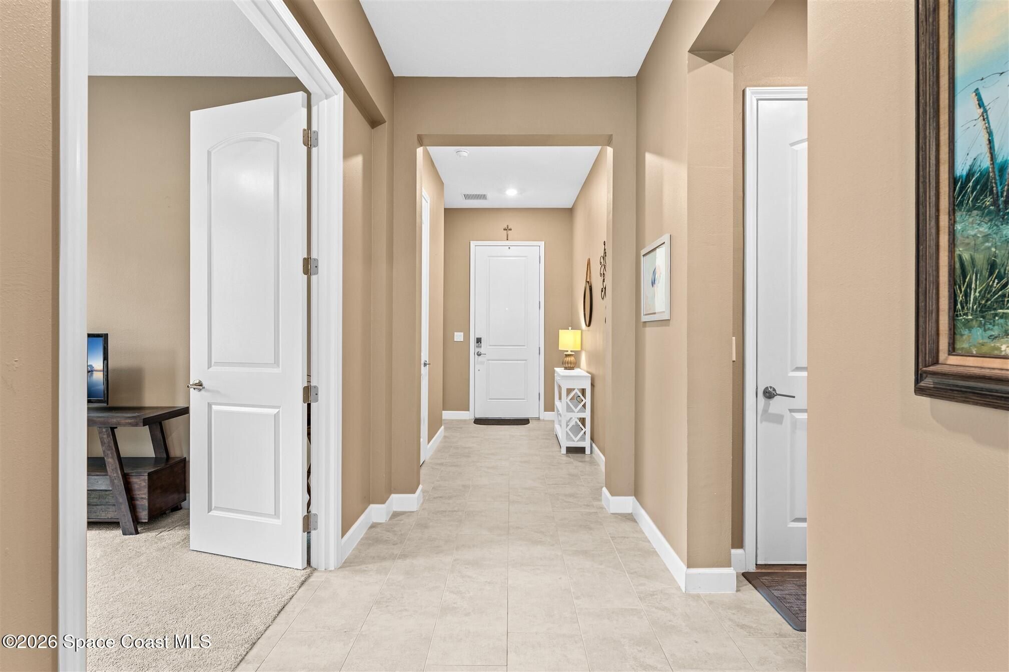 Immaculate 3 bedroom plus study, 3 1/2 bath, waterfront home in Bridgewater, Viera's popular gated 55+ resort style community. All three bedrooms are en-suites, making the Key Largo the most popular floorplan! This barely lived in home has plank tile floors in the main living areas, ceiling fans, and 8' doors. Great room has triple sliders to the screened in porch and additional paver patio and lake beyond! Exterior landscaped beds are bordered with designer curbing and stone. And all windows and the sliders have accordion shutters for added peace of mind! Delightful kitchen with espresso kitchen cabinets with tile backsplash and an island with stunning pendant lights! Dream laundry room with W/D, cabinets and a sink! Oversized primary bedroom and primary bath with a huge walk-in closet with custom built-ins! Unbelievable clubhouse w/ heated pool and spa, movie theater, fitness center, coffee lounge, tennis, pickleball! Close to shopping, restaurants, ocean beaches, cruise port!
