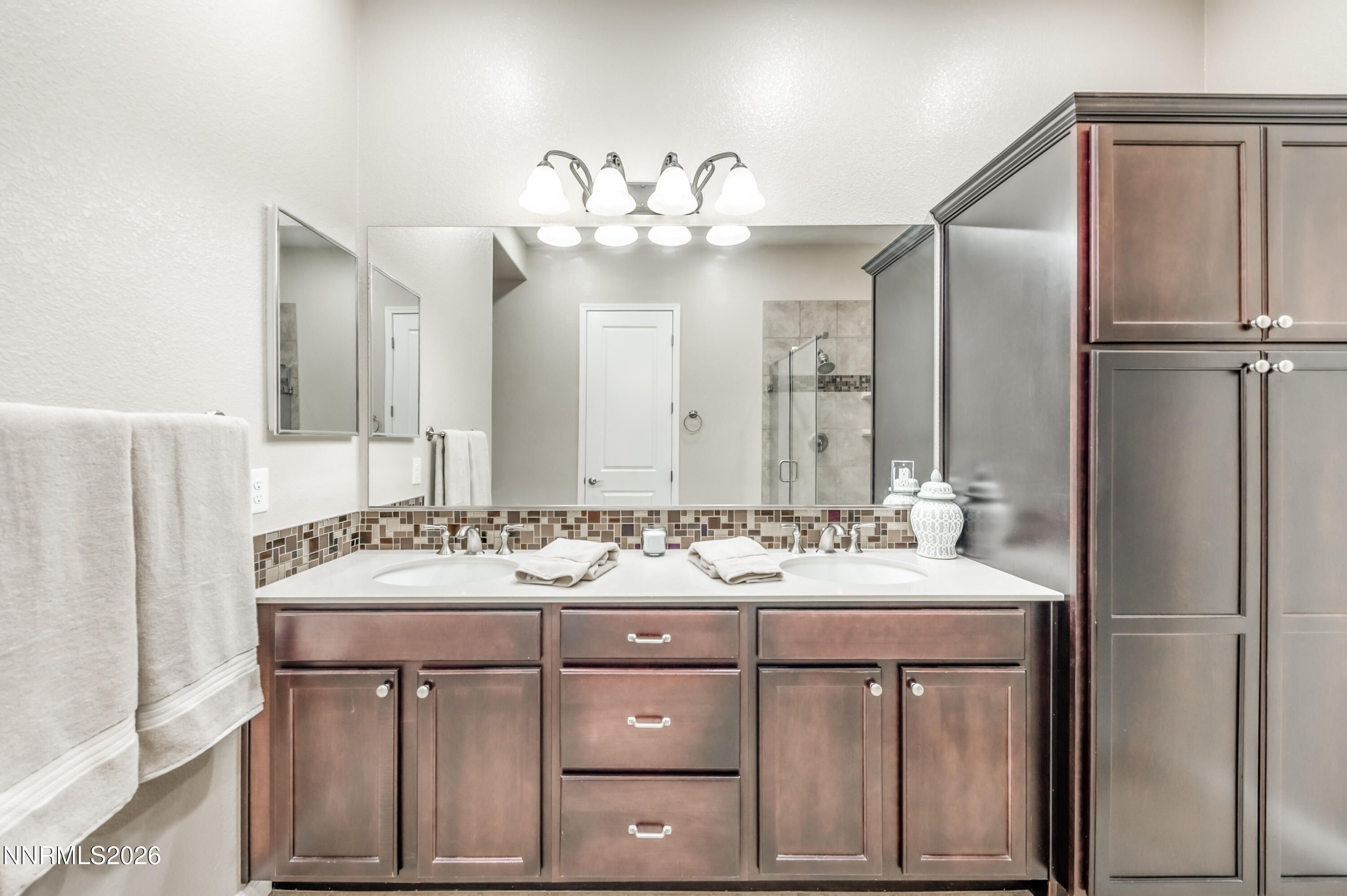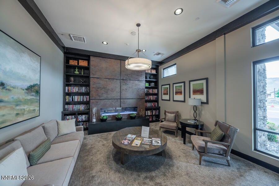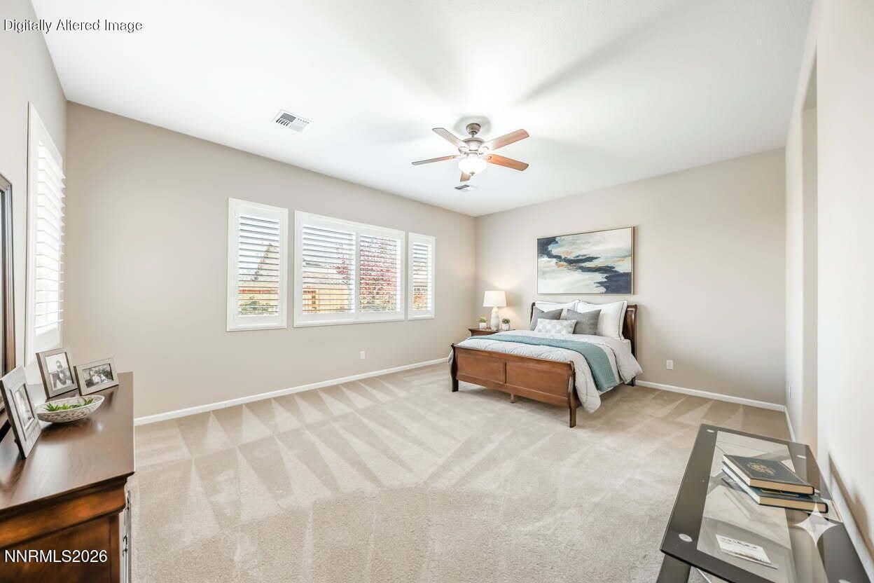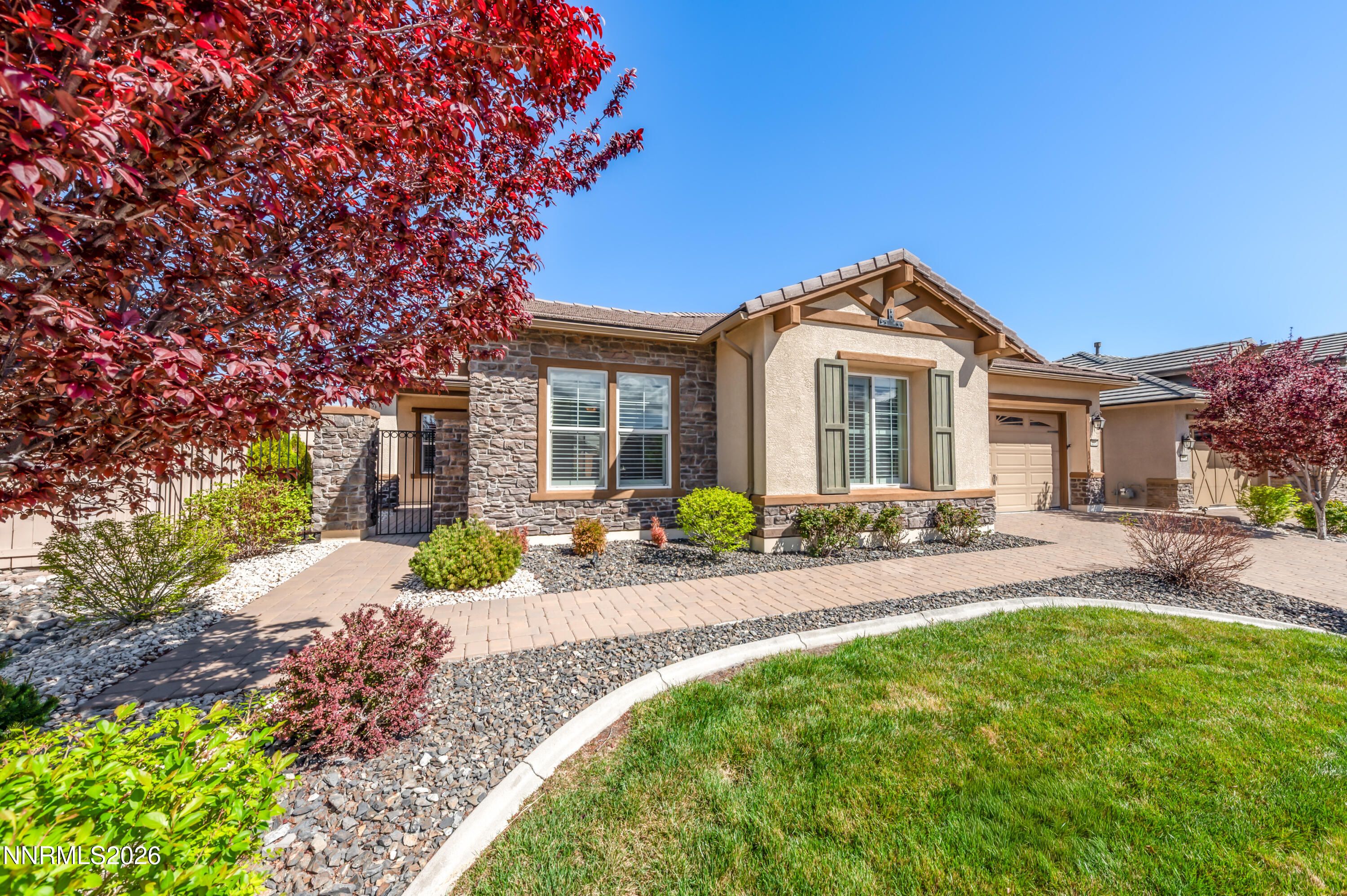 Enjoy luxury, low-maintenance living in this lovely single-story home located in the highly sought-after gated Regency at Damonte Ranch 55+ community. With limited resale inventory, this move-in ready home offers an exceptional opportunity to enjoy one of Reno's premier active adult neighborhoods. The thoughtfully designed open floorplan features a welcoming foyer with high ceilings, leading into a spacious great room that flows seamlessly into the kitchen and dining area. The kitchen offers a large island with breakfast bar, pantry, and abundant cabinetry, ideal for both everyday living and entertaining. Designed for indoor-outdoor living, a large sliding glass door opens to a covered patio and low-maintenance backyard with automatic irrigation, creating a comfortable space to relax or host guests. The primary suite is conveniently located on the main level and features dual sinks, walk-in closet, and walk-in shower, while the secondary en suite bedroom provide flexibility for guests. A separate office/den adds additional functional space. Additional features include high ceilings throughout, ceiling fans, smart thermostat, laundry room with cabinets and sink, and an attached garage. Residents enjoy access to over 17,000 square feet of resort-style amenities, including an indoor pool and spa, fitness center, game room, and social spaces, along with pickleball, tennis, bocce courts, and walking trails. A full-time lifestyle director coordinates community events and activities. When you purchase in this community, you also have access to the 2nd clubhouse and outdoor pool/spa and gym. Located within the master-planned Damonte Ranch community, there is convenient access to parks, trails, shopping, and dining, and approximately 15 minutes to Reno-Tahoe International Airport, 25 minutes to Lake Tahoe and world-class skiing.