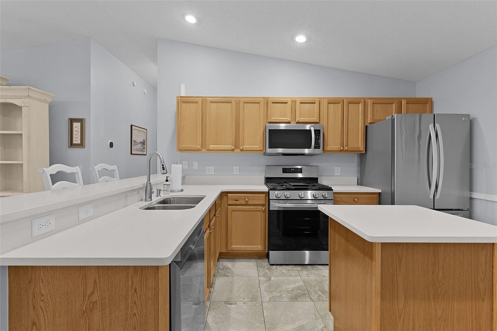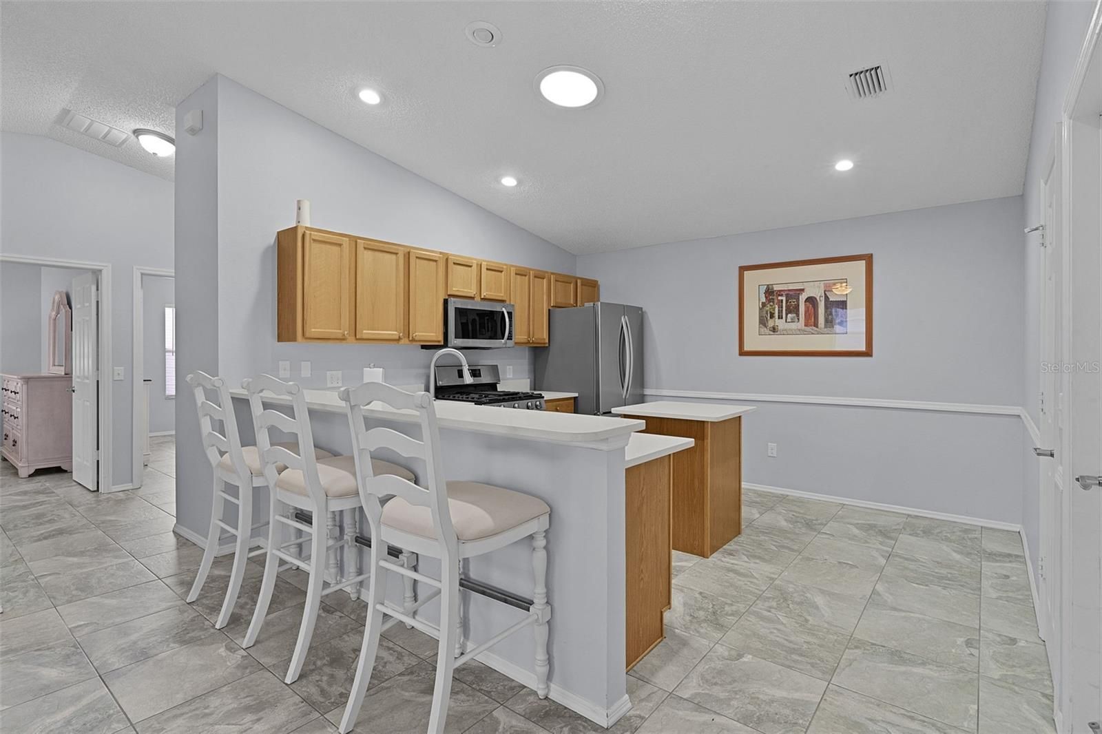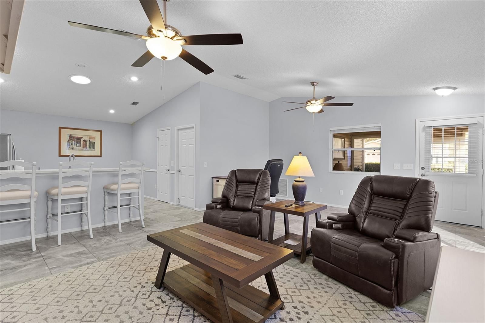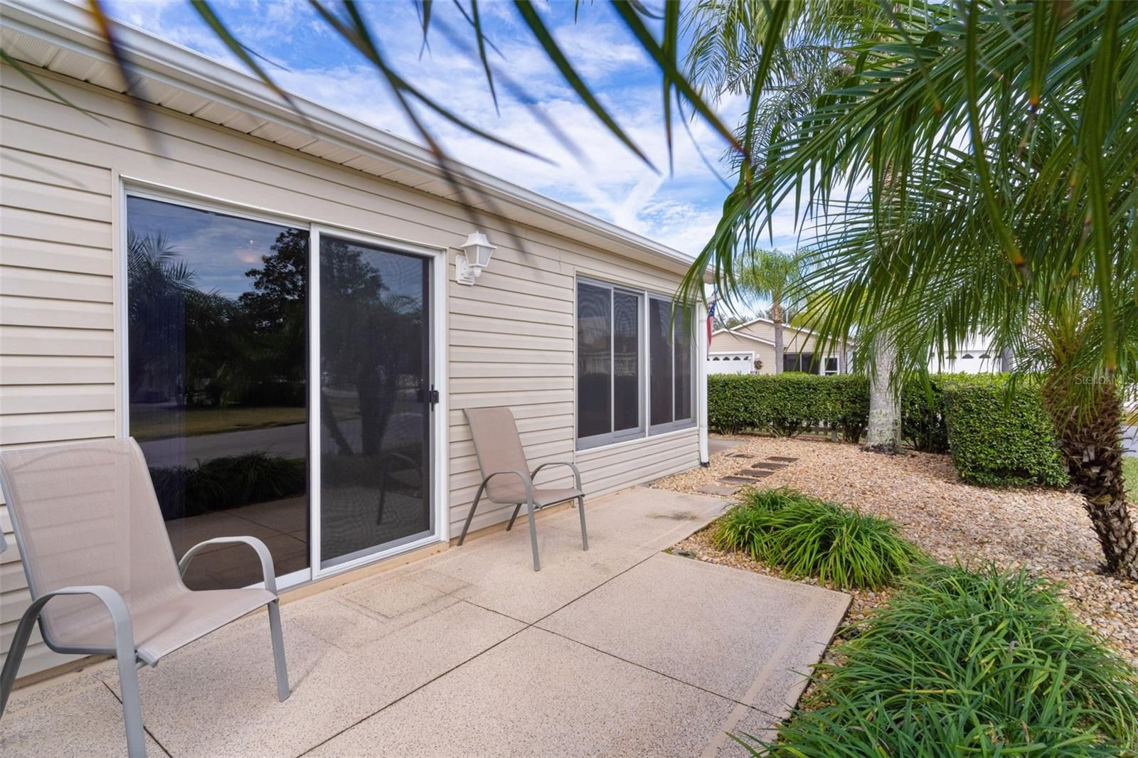 ~~CORNER LOT, UNOBSTRUCTED LANAI VIEW~~2021 ROOF~~2017 HWH~~CERAMIC TILE FLOOR THRU-OUT/NO CARPET Wow! Super clean, nicely upgraded, well maintained Colony model patio villa in Oak Bend Villas, Village of Tall Trees. Perfectly positioned on a corner lot with mature landscaping that adds both privacy and curb appeal. Step inside to discover vaulted ceilings and ceramic tile flooring, creating a bright, open feel. The living room features ceiling fan and blinds, flowing seamlessly into the dining area, which has its own ceiling fan and sliding doors leading to the patio—ideal for indoor/outdoor living. The kitchen sparkles with quartz countertops, stainless steel appliances, functional peninsula with chair rail, and closet pantry, making it as stylish as it is practical. The primary suite offers vaulted ceilings, walk-in closet, and private ensuite bath featuring upgraded tiled shower with bench and quartz countertops. The guest bedroom boasts vaulted ceilings and built-in closet. Guest bath includes a tub/shower surround, quartz counters, upgraded lighting, and convenient linen closet in the hall. Enjoy year-round relaxation in the lanai with acrylic telescoping sliders, concrete floors plus the north-facing orientation with no direct sun, keeping the space cool and comfortable. The garage includes epoxy flooring, laundry hook-up with sink and shelving. This is a killer location so close to EVERYTHING: 6 executive golf courses, Arnold Palmer Legends Championship Golf Course; Laurel Manor & Tall Trees Rec Centers; restaurants (coffee, ice cream, ethnic, sports/casual, upscale dining); various grocery & health food stores, golf shop, banking and any other type of retail you desire along 466.