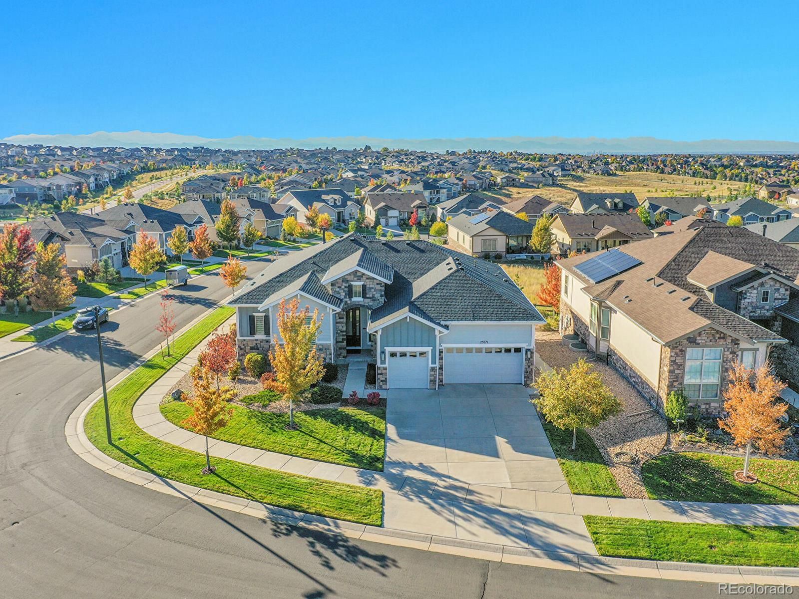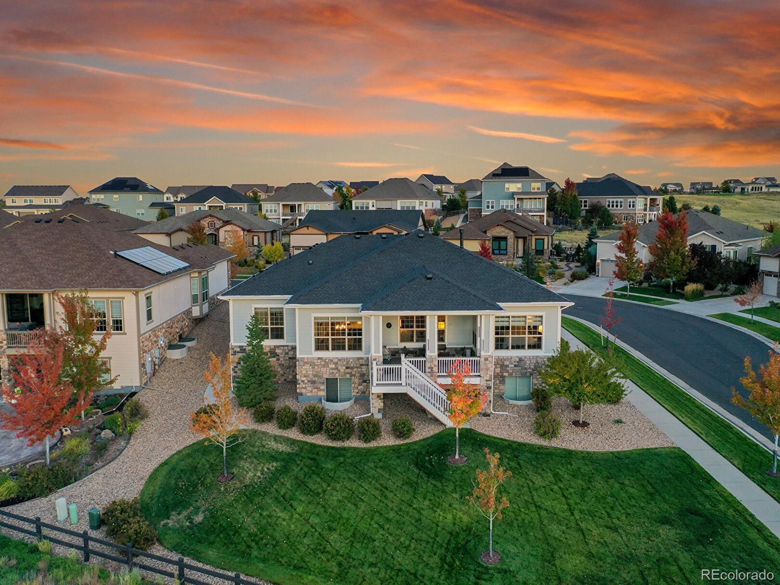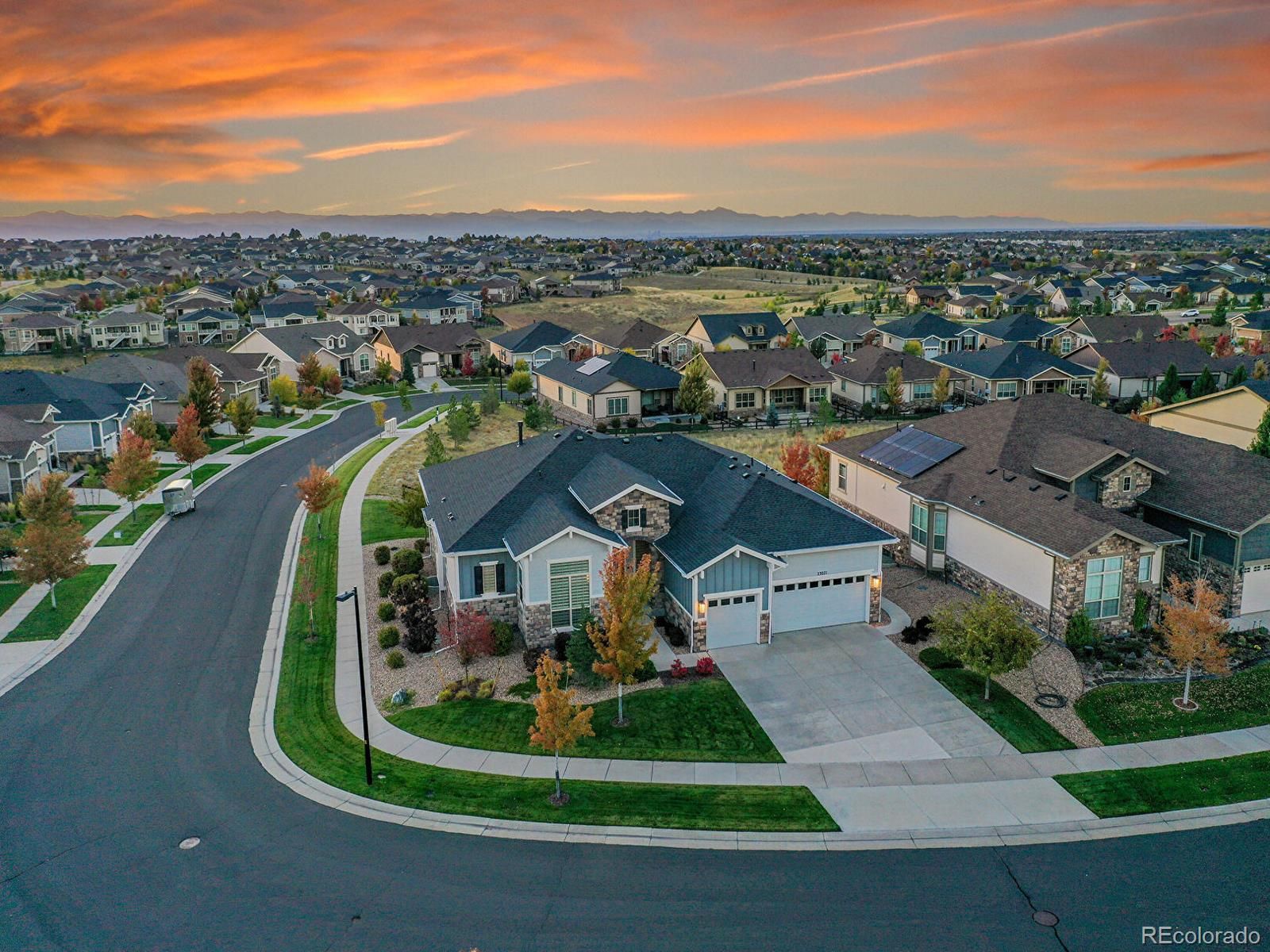 Experience approachable luxury and main-level living in this 2-bed, 3-bath ranch boasting a layout primed for entertaining, a sprawling .27-acre corner lot, and mountain and open-space views! Built in 2016, this showcase-worthy residence embodies the spirit of Inspiration, set within the vibrant 55+ portion of this active lifestyle community. Soaring ceilings and sunlit spaces welcome you home. Host unforgettable gatherings in the formal dining room, connected to the chef’s kitchen by a custom wine bar. Granite countertops, stainless steel appliances, double ovens, and a high-end gas range make this a showstopping space for culinary creation. Sip morning coffee in the sunlit breakfast nook, where wraparound views lead to a generous covered deck. The living room boasts a cozy brick-surround fireplace and sprawling windows, creating an inviting space for relaxation. A private office with custom built-ins, nearby half-bath, extended laundry, and mudroom maximize everyday ease. Retreat to a primary suite, a five-star escape complete with a sitting area, spa-inspired 5-piece bath, and oversized custom walk-in closet. Across the main level, a generous second primary provides privacy with an en suite and walk-in closet. Downstairs, the unfinished basement offers endless potential, featuring a workshop, cedar-lined closet, and expansive storage space. Unwind on the covered deck, where ceiling fans keep summer evenings comfortable, framed by open space, mountain views, and a lush green lawn. The Inspiration community offers resort-style amenities for an elevated lifestyle, featuring an all-ages and a 55+ clubhouse. Enjoy pickleball, tennis, pools, a yoga studio, coffee bar, dog park, miles of trails, lively community events, and even a charming beer garden. With Southlands Mall, Parker Main Street, Aurora Reservoir, and Heritage Eagle Bend Golf Club just minutes away, enjoy the best of Colorado living at your fingertips.
