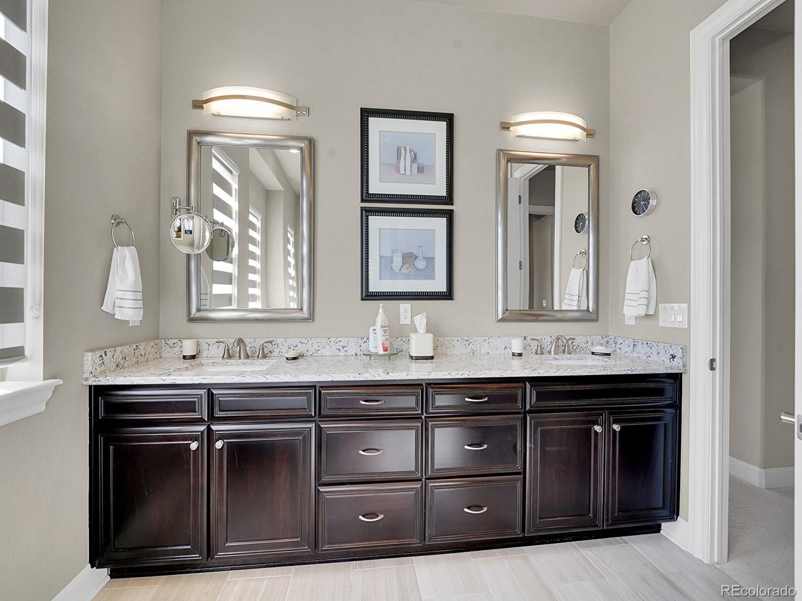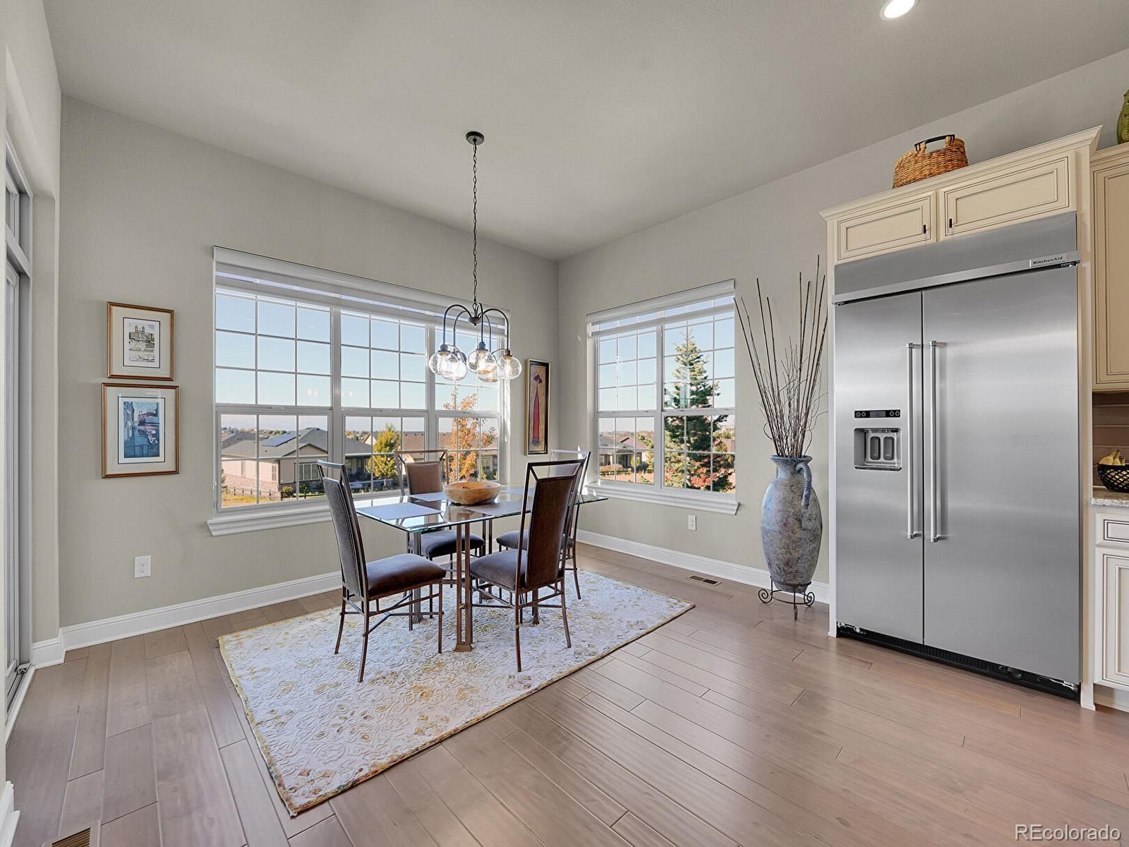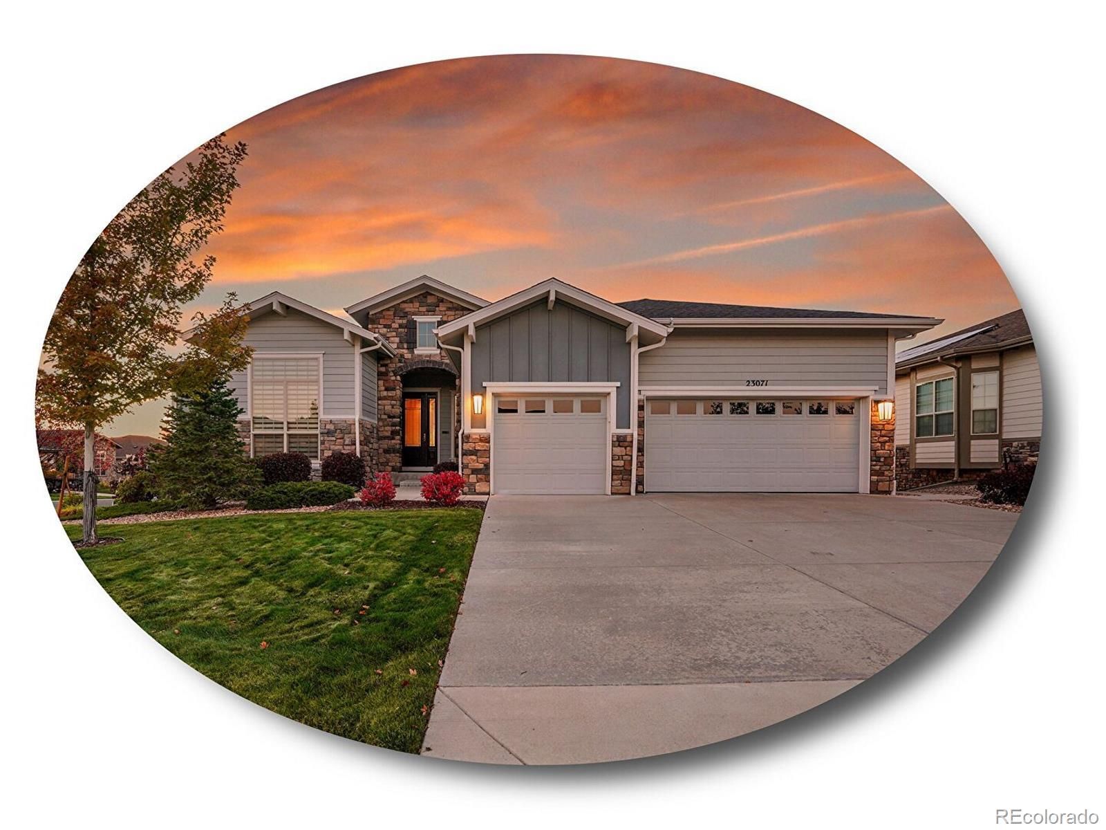 Experience approachable luxury and main-level living in this 2-bed, 3-bath ranch boasting a layout primed for entertaining, a sprawling .27-acre corner lot, and mountain and open-space views! Built in 2016, this showcase-worthy residence embodies the spirit of Inspiration, set within the vibrant 55+ portion of this active lifestyle community. Soaring ceilings and sunlit spaces welcome you home. Host unforgettable gatherings in the formal dining room, connected to the chef’s kitchen by a custom wine bar. Granite countertops, stainless steel appliances, double ovens, and a high-end gas range make this a showstopping space for culinary creation. Sip morning coffee in the sunlit breakfast nook, where wraparound views lead to a generous covered deck. The living room boasts a cozy brick-surround fireplace and sprawling windows, creating an inviting space for relaxation. A private office with custom built-ins, nearby half-bath, extended laundry, and mudroom maximize everyday ease. Retreat to a primary suite, a five-star escape complete with a sitting area, spa-inspired 5-piece bath, and oversized custom walk-in closet. Across the main level, a generous second primary provides privacy with an en suite and walk-in closet. Downstairs, the unfinished basement offers endless potential, featuring a workshop, cedar-lined closet, and expansive storage space. Unwind on the covered deck, where ceiling fans keep summer evenings comfortable, framed by open space, mountain views, and a lush green lawn. The Inspiration community offers resort-style amenities for an elevated lifestyle, featuring an all-ages and a 55+ clubhouse. Enjoy pickleball, tennis, pools, a yoga studio, coffee bar, dog park, miles of trails, lively community events, and even a charming beer garden. With Southlands Mall, Parker Main Street, Aurora Reservoir, and Heritage Eagle Bend Golf Club just minutes away, enjoy the best of Colorado living at your fingertips.