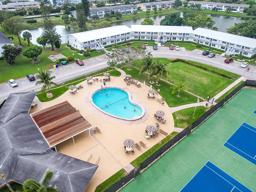 Updated 1-bed, 1-bath second-floor condo in Century Village! This charming unit faces north toward the serene preserve and features impact front windows and door, (2) newer A/C window units, and an enclosed rear covered balcony. Enjoy the private community courtyard patio and sitting area with chairs and BBQ grill. Just under the stairs is the common laundry & storage rooms. Convenience is key with an assigned parking space right in front and a short walk to the Dorchester community pool.Located in the sought-after Century Village 55+ gated community with 24-hour security, residents enjoy a wealth of amenities, activities, and convenient bus transportation to local shopping, dining, and medical facilities. Experience an active and vibrant lifestyle in this fantastic community!