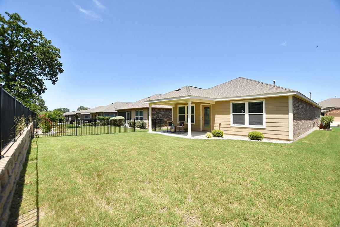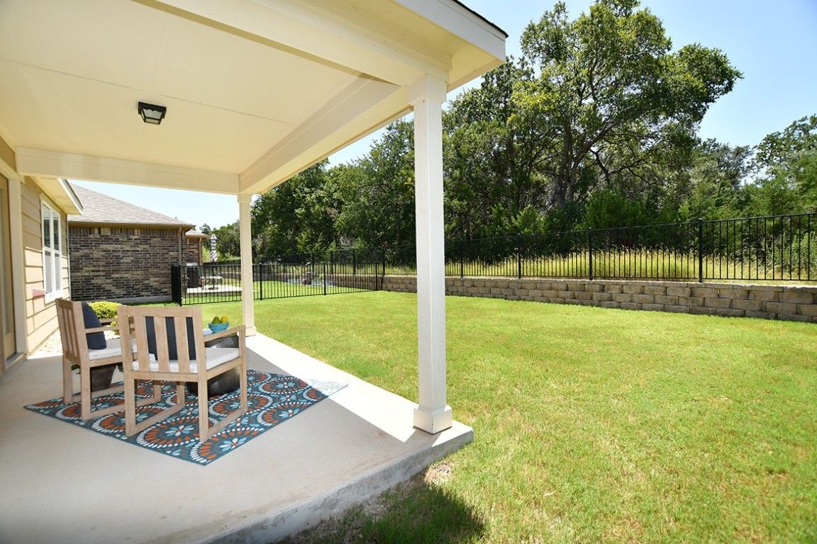 Backing to wood views of large parcel property across back fence line, this popular Steel Creek plan features open-concept, easy living space with kitchen, dining and living areas opening one to the other. Diagonally-laid floor tile greets you at the front door and is found throughout this home except for a carpeted guest bedroom, while a trayed ceiling in the living/dining area lends a spacious feel. Stainless appliances, granite counter tops and pendant lights enhance the kitchen experience. Outside, low maintenance brick cladding on three sides of the home along with stone-edged planting beds, front satellite courtyard and driveway extensions provide a warm, friendly curb appeal. The back yard is partially fenced and almost ready for that pampered pooch! Refrigerator/washer/dryer may convey. Clean, tidy & ready to go! Come live your best life in Sun City Texas!