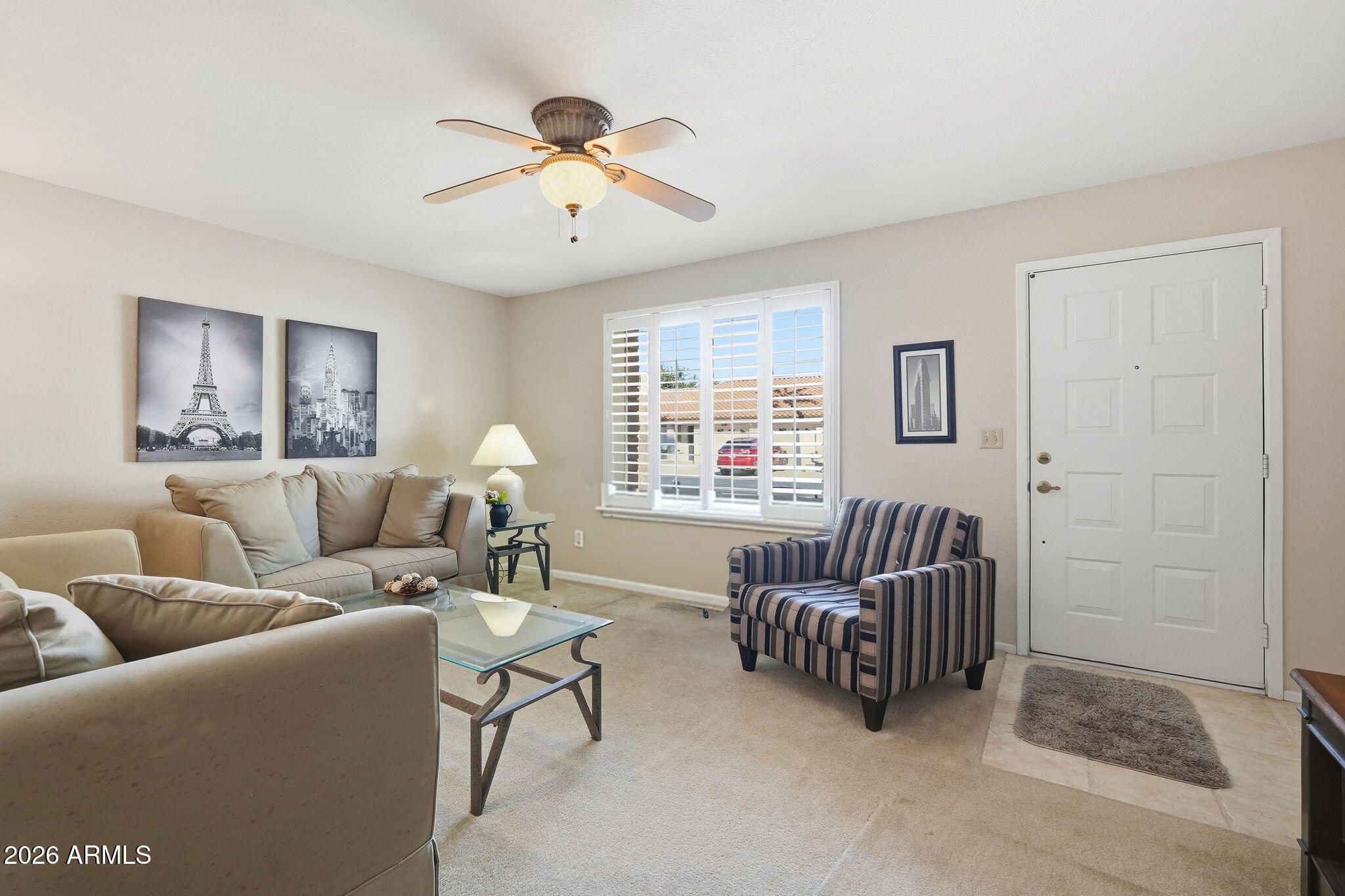 Enjoy effortless living with golf course views in this well-maintained, furnished 2-bedroom, 2-bath condo located right in the middle of the community. The flexible floor plan features a second bedroom currently used as an expanded family room, easily able to convert to a true bedroom with existing dual closets. A north-facing front patio offers the perfect spot for morning coffee, people watching, and greeting neighbors. From the patio, enter into a neutral-toned living room with a north-facing window and plantation shutters, creating a bright and welcoming space. The kitchen provides ample cabinet and counter space, an eat-in dining area, pantry closet, and a small built-in desk ideal for checking emails. Convenient interior laundry is located just off the kitchen with direct access to the garage. The primary suite features a south-facing window with beautiful golf course views, a private bathroom with shower, and a walk-in closet. Step out to the back patio to unwind while watching golfers on a Par 4, or enjoy stunning sunset viewsone of the best vantage points in this condo section. Low-maintenance living in a sought-after community allowing you to fully embrace the SVE way of life.