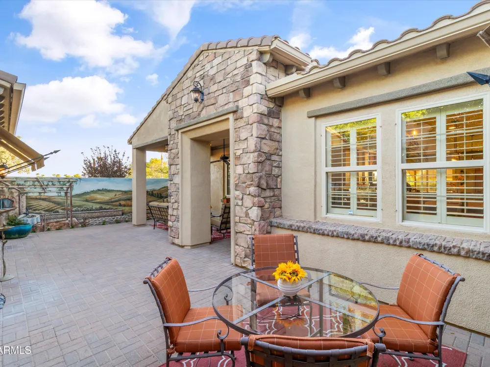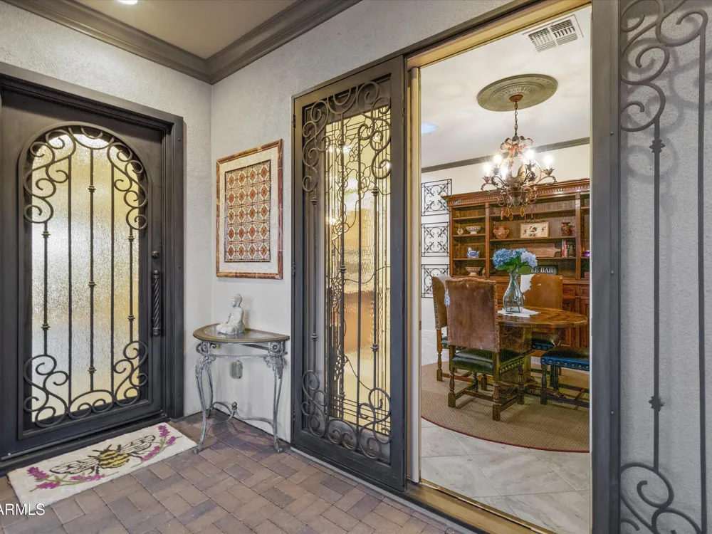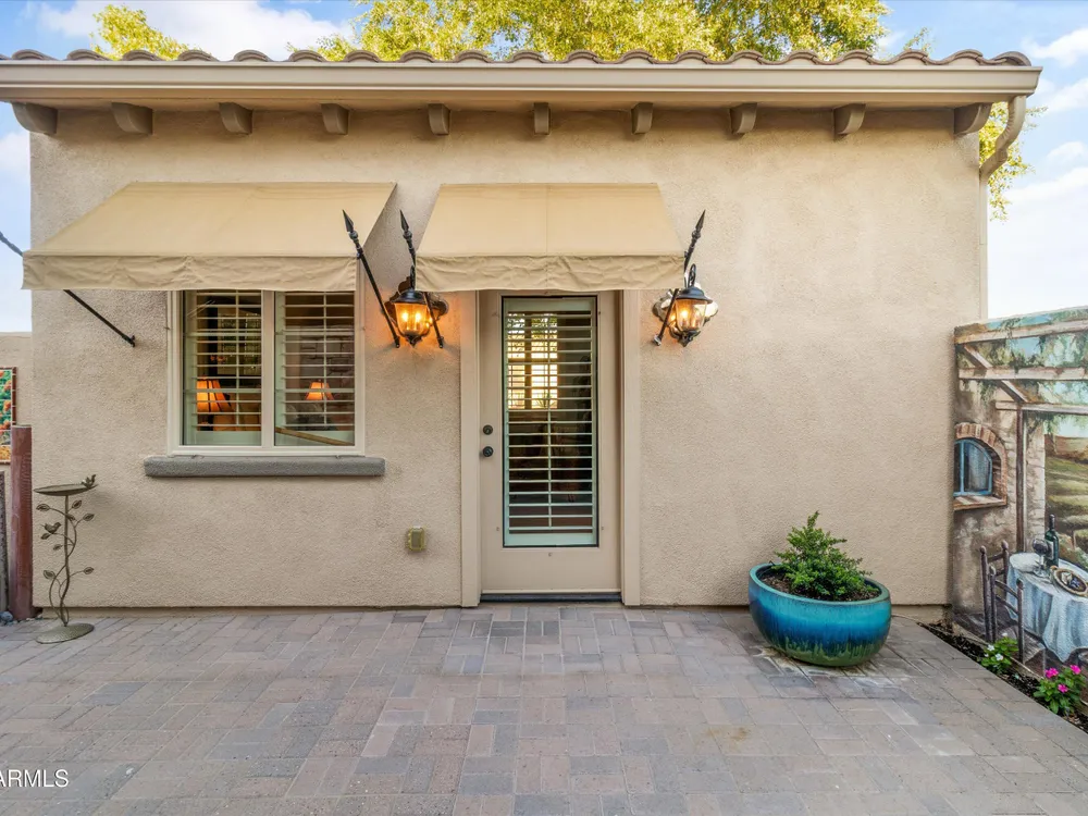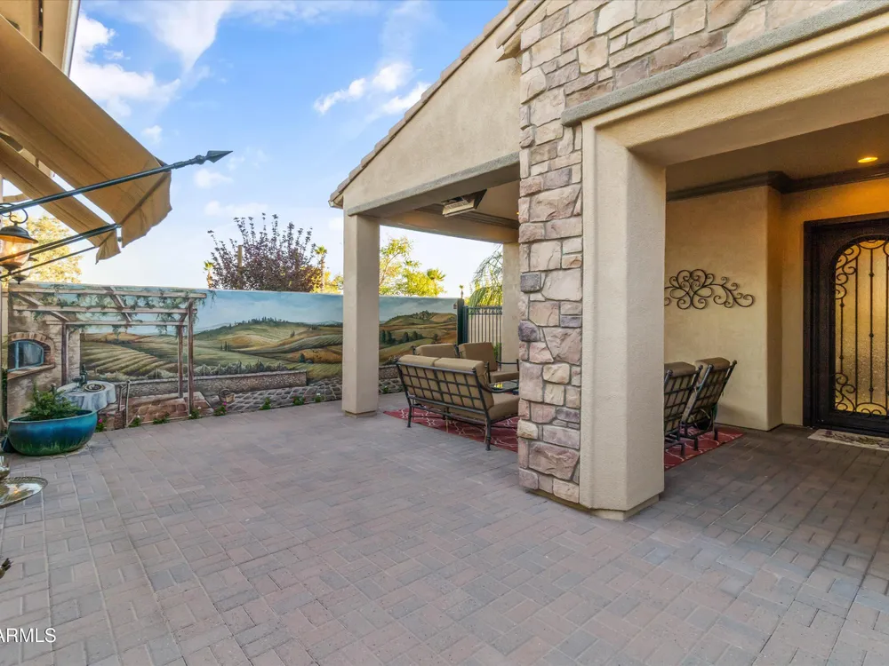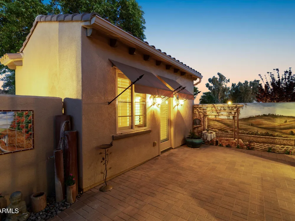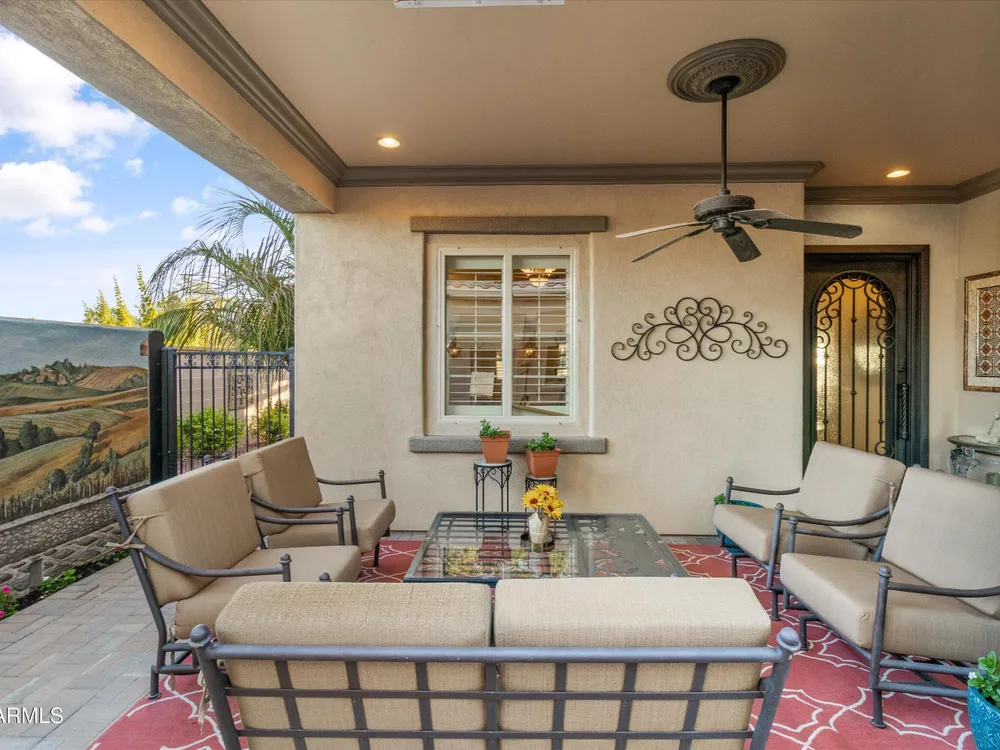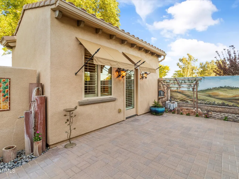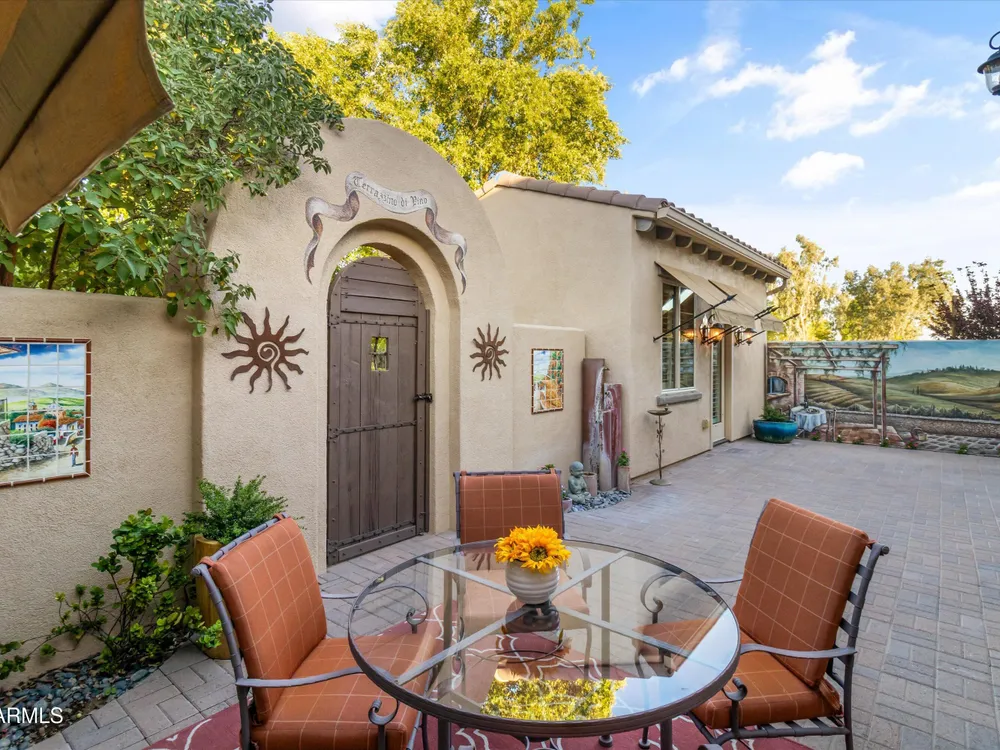A Front-Row Seat to the 12th Fairway — Golf, Water, and Mountain Views in Every Direction. Step into timeless sophistication with this exquisitely reimagined Encanto Model residence. Complemented by a private 247-square-foot detached Casita. Offering a total of four bedrooms and three baths across 2,390 square feet, this exceptional property is perfectly positioned along the iconic 12th fairway of the Corte Bella Country Club where panoramic golf course, mountain, and waterfront vistas steal the show. Every inch of this home was meticulously renovated between 2018-2020 with high-end finishes, thoughtful upgrades, and an emphasis on modern elegance. As you enter through the stylish gated courtyard, you're greeted by a custom hand-painted wall mural, intricate mosaic tile artwork, tailored awnings, a soothing water feature, and elegant French doors that open directly from the kitchen. The grand entry sets the tone with a striking wrought iron glass door, statement chandelier, and crown molding that continues from the home's interior out to the courtyard and the expansive back patio. New tile flooring (2019) spans the great room, kitchen, dining area, laundry space, and guest bathroom, while Godfrey Hirst carpet lends warmth and sophistication to the primary and secondary bedrooms. The gourmet kitchen has been fully redesigned with a massive American Cherry butcher block island, glass tile backsplash, rain glass cabinetry, and a sleek Adorne Collection lighting and power system. Custom plumbing, designer fixtures, and premium appliances make this space as functional as it is stunning. The primary suite is a luxurious sanctuary, boasting a redesigned bathroom complete with a spacious tiled walk-in shower, freestanding soaking tub, upgraded lighting and plumbing, custom cabinetry with pull-out shelving, and a walk-in closet finished with Couristan patterned carpet. The guest bathroom has also been elegantly updated with a tiled shower, glass doors, upgraded fixtures, and a chic vanity and mirror. The Casita bath mirrors the same refined upgrades. Out back, enjoy your own private resort: A premium lot with an extended pergola, built-in BBQ with bar seating, electric heater, recessed lighting, retractable awning with new canvas, and a sparkling poolall designed to maximize comfort and take in the show stopping views. Additional upgrades include: Epoxy flooring in garage (2025) New HVAC systems (2019). High-capacity hot water heater (2020). Professional landscaping, upgraded irrigation systems, and landscape lighting. Pool drained, cleaned, and updated in 2025 Every feature of this home has been curated for both style and substance. Now available, this is a rare opportunity to own a one-of-a-kind residence in the exclusive, guard-gated community of Corte Bella Country Club.
