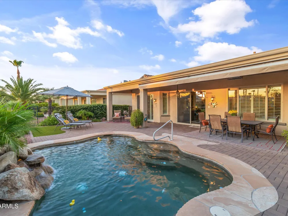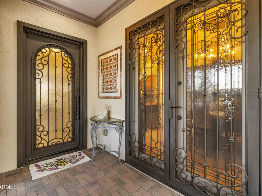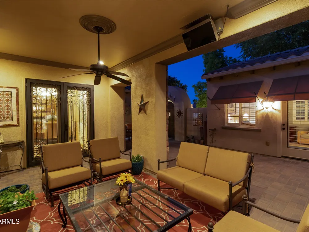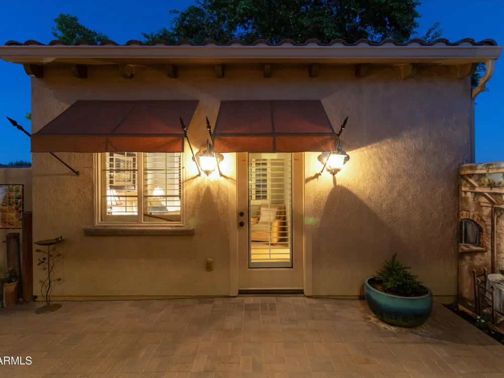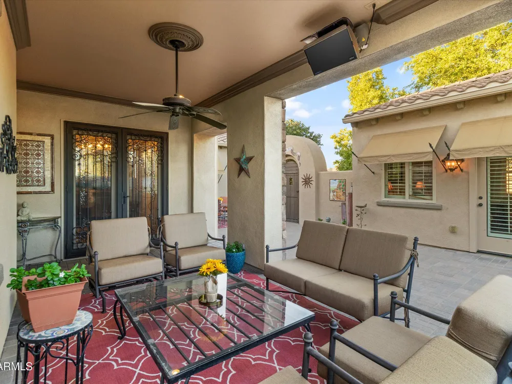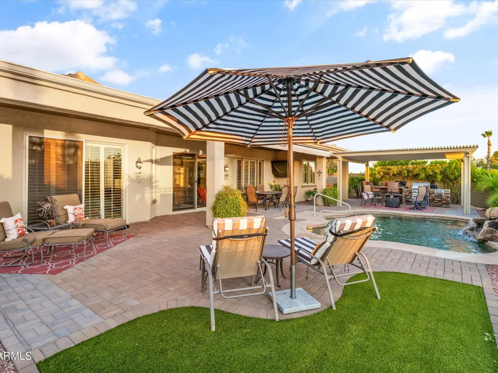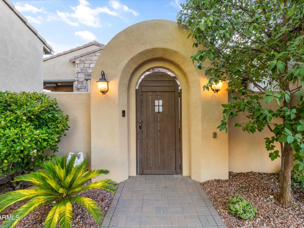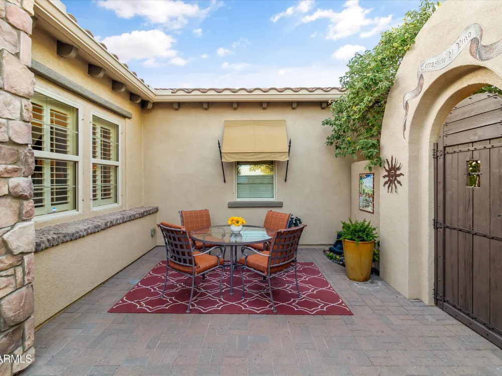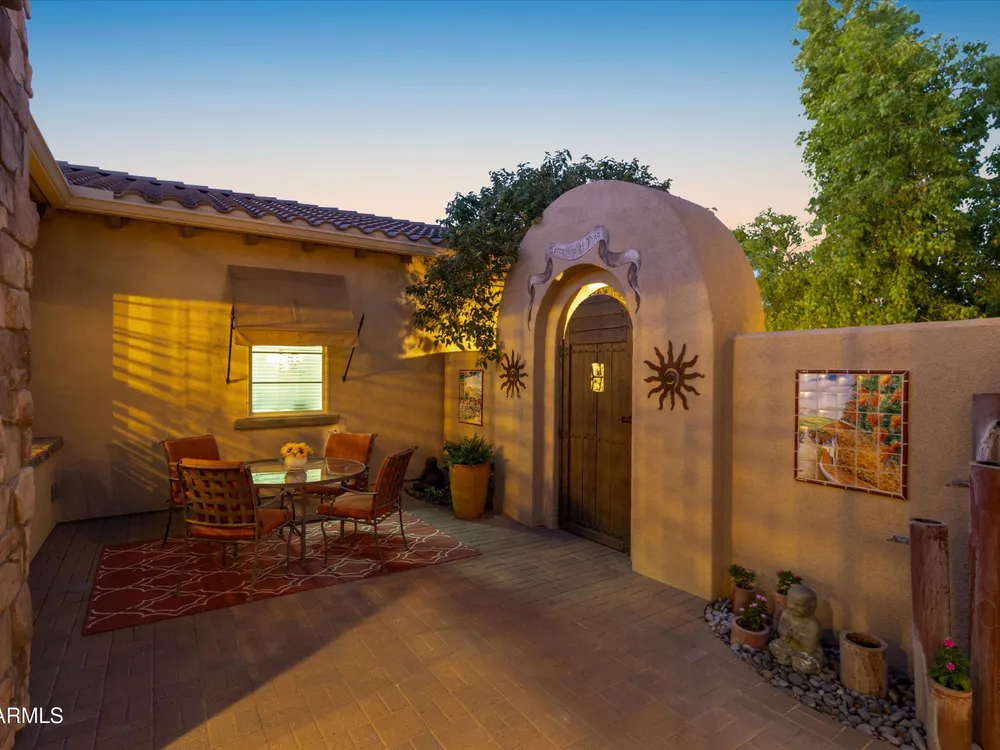 A Front-Row Seat to the 12th Fairway — Golf, Water, and Mountain Views in Every Direction. Step into timeless sophistication with this exquisitely reimagined Encanto Model residence. Complemented by a private 247-square-foot detached Casita. Offering a total of four bedrooms and three baths across 2,390 square feet, this exceptional property is perfectly positioned along the iconic 12th fairway of the Corte Bella Country Club where panoramic golf course, mountain, and waterfront vistas steal the show. Every inch of this home was meticulously renovated between 2018-2020 with high-end finishes, thoughtful upgrades, and an emphasis on modern elegance. As you enter through the stylish gated courtyard, you're greeted by a custom hand-painted wall mural, intricate mosaic tile artwork, tailored awnings, a soothing water feature, and elegant French doors that open directly from the kitchen. The grand entry sets the tone with a striking wrought iron glass door, statement chandelier, and crown molding that continues from the home's interior out to the courtyard and the expansive back patio. New tile flooring (2019) spans the great room, kitchen, dining area, laundry space, and guest bathroom, while Godfrey Hirst carpet lends warmth and sophistication to the primary and secondary bedrooms. The gourmet kitchen has been fully redesigned with a massive American Cherry butcher block island, glass tile backsplash, rain glass cabinetry, and a sleek Adorne Collection lighting and power system. Custom plumbing, designer fixtures, and premium appliances make this space as functional as it is stunning. The primary suite is a luxurious sanctuary, boasting a redesigned bathroom complete with a spacious tiled walk-in shower, freestanding soaking tub, upgraded lighting and plumbing, custom cabinetry with pull-out shelving, and a walk-in closet finished with Couristan patterned carpet. The guest bathroom has also been elegantly updated with a tiled shower, glass doors, upgraded fixtures, and a chic vanity and mirror. The Casita bath mirrors the same refined upgrades. Out back, enjoy your own private resort: A premium lot with an extended pergola, built-in BBQ with bar seating, electric heater, recessed lighting, retractable awning with new canvas, and a sparkling poolall designed to maximize comfort and take in the show stopping views. Additional upgrades include: Epoxy flooring in garage (2025) New HVAC systems (2019). High-capacity hot water heater (2020). Professional landscaping, upgraded irrigation systems, and landscape lighting. Pool drained, cleaned, and updated in 2025 Every feature of this home has been curated for both style and substance. Now available, this is a rare opportunity to own a one-of-a-kind residence in the exclusive, guard-gated community of Corte Bella Country Club.