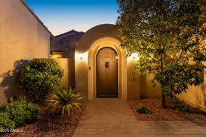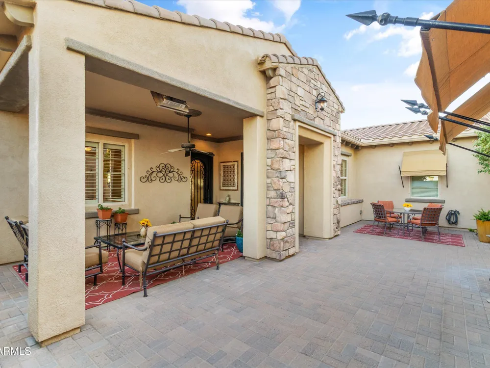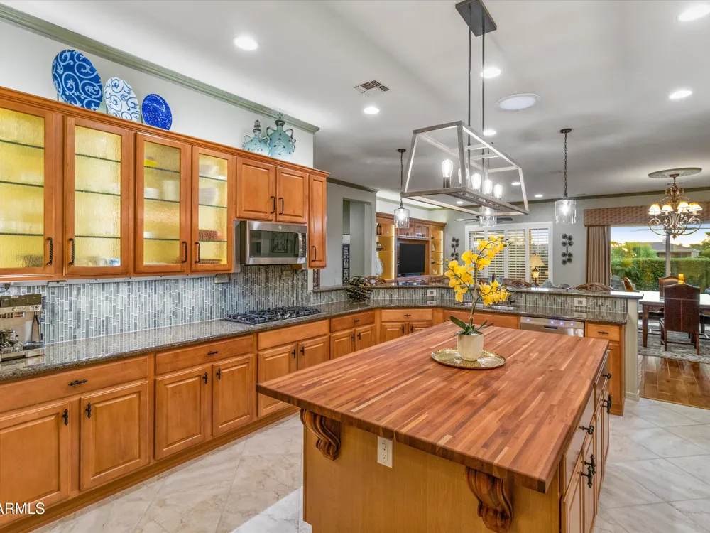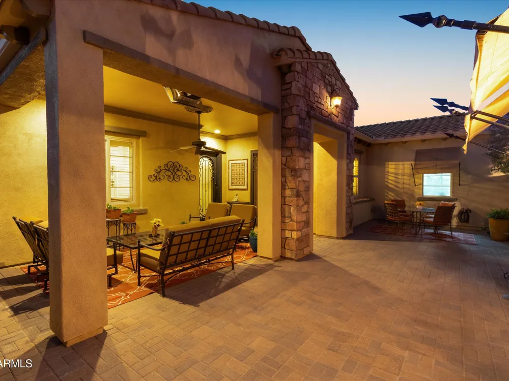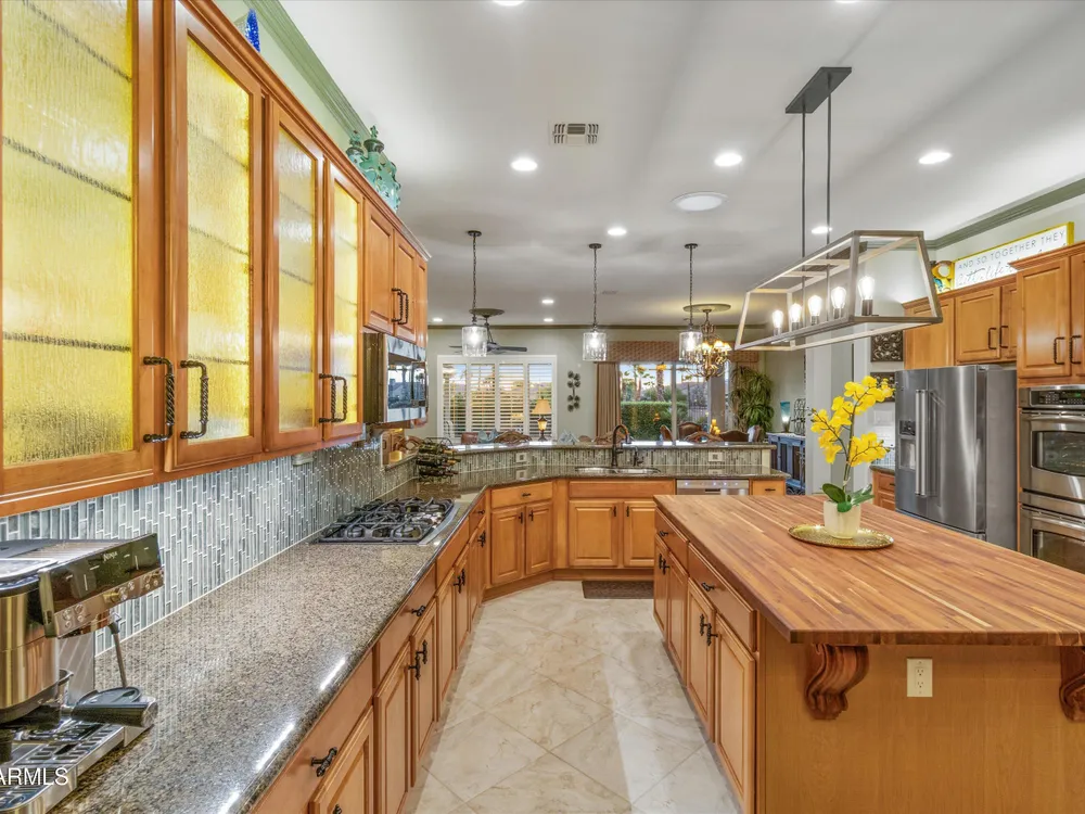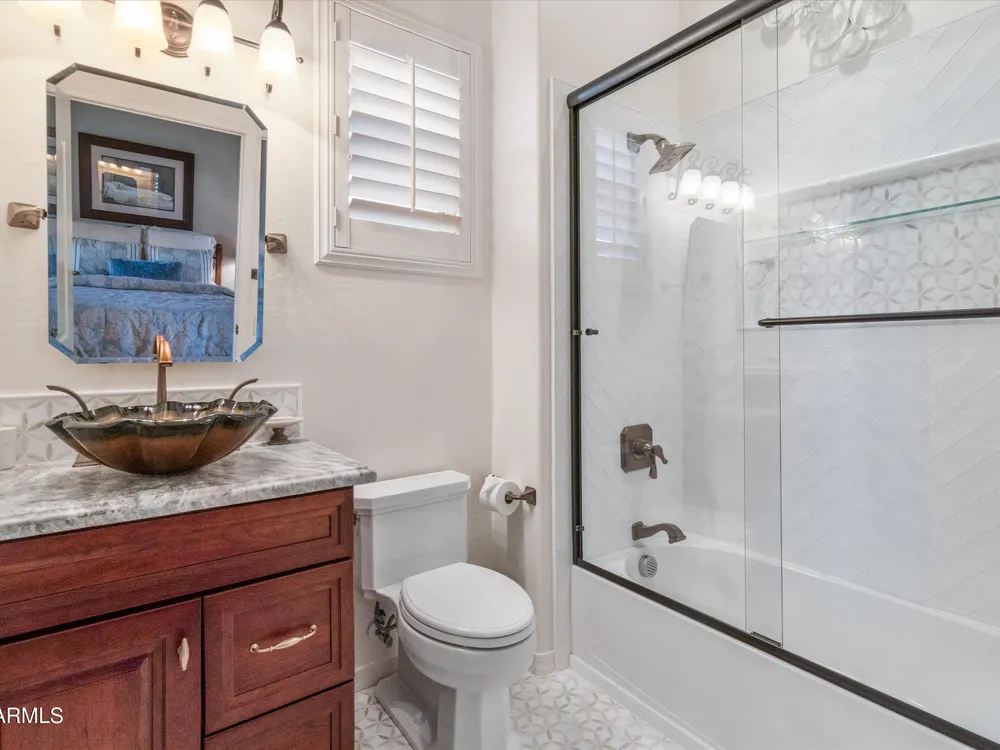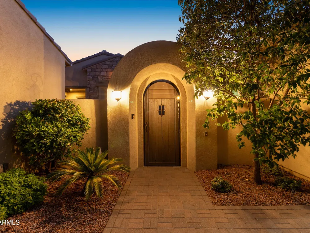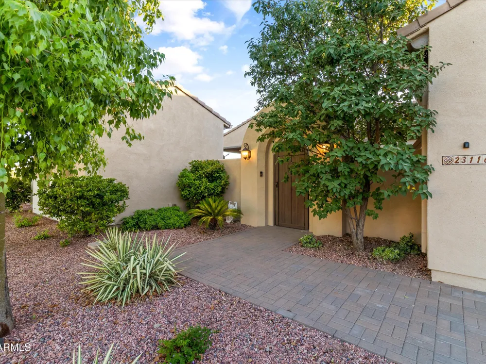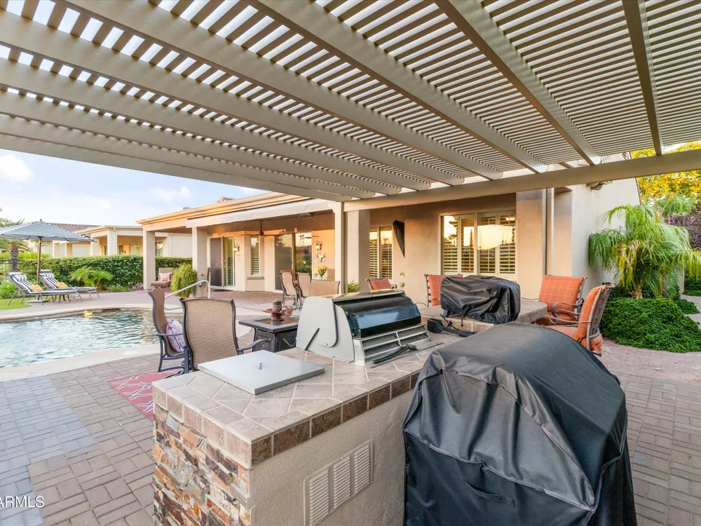 A Front-Row Seat to the 12th Fairway — Golf, Water, and Mountain Views in Every Direction. Step into timeless sophistication with this exquisitely reimagined Encanto Model residence. Complemented by a private 247-square-foot detached Casita. Offering a total of four bedrooms and three baths across 2,390 square feet, this exceptional property is perfectly positioned along the iconic 12th fairway of the Corte Bella Country Club where panoramic golf course, mountain, and waterfront vistas steal the show. Every inch of this home was meticulously renovated between 2018-2020 with high-end finishes, thoughtful upgrades, and an emphasis on modern elegance. As you enter through the stylish gated courtyard, you're greeted by a custom hand-painted wall mural, intricate mosaic tile artwork, tailored awnings, a soothing water feature, and elegant French doors that open directly from the kitchen. The grand entry sets the tone with a striking wrought iron glass door, statement chandelier, and crown molding that continues from the home's interior out to the courtyard and the expansive back patio. New tile flooring (2019) spans the great room, kitchen, dining area, laundry space, and guest bathroom, while Godfrey Hirst carpet lends warmth and sophistication to the primary and secondary bedrooms. The gourmet kitchen has been fully redesigned with a massive American Cherry butcher block island, glass tile backsplash, rain glass cabinetry, and a sleek Adorne Collection lighting and power system. Custom plumbing, designer fixtures, and premium appliances make this space as functional as it is stunning. The primary suite is a luxurious sanctuary, boasting a redesigned bathroom complete with a spacious tiled walk-in shower, freestanding soaking tub, upgraded lighting and plumbing, custom cabinetry with pull-out shelving, and a walk-in closet finished with Couristan patterned carpet. The guest bathroom has also been elegantly updated with a tiled shower, glass doors, upgraded fixtures, and a chic vanity and mirror. The Casita bath mirrors the same refined upgrades. Out back, enjoy your own private resort: A premium lot with an extended pergola, built-in BBQ with bar seating, electric heater, recessed lighting, retractable awning with new canvas, and a sparkling poolall designed to maximize comfort and take in the show stopping views. Additional upgrades include: Epoxy flooring in garage (2025) New HVAC systems (2019). High-capacity hot water heater (2020). Professional landscaping, upgraded irrigation systems, and landscape lighting. Pool drained, cleaned, and updated in 2025 Every feature of this home has been curated for both style and substance. Now available, this is a rare opportunity to own a one-of-a-kind residence in the exclusive, guard-gated community of Corte Bella Country Club.