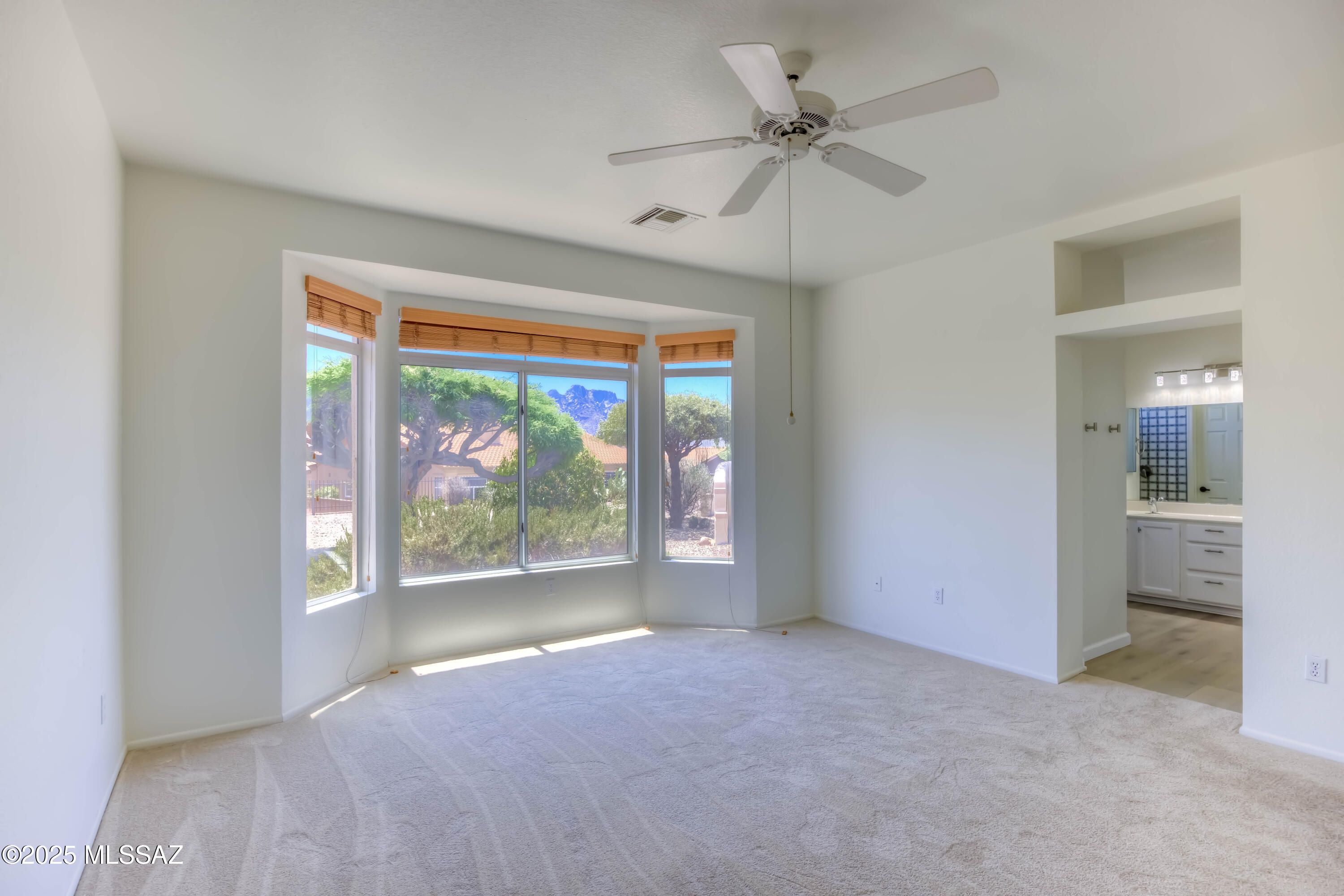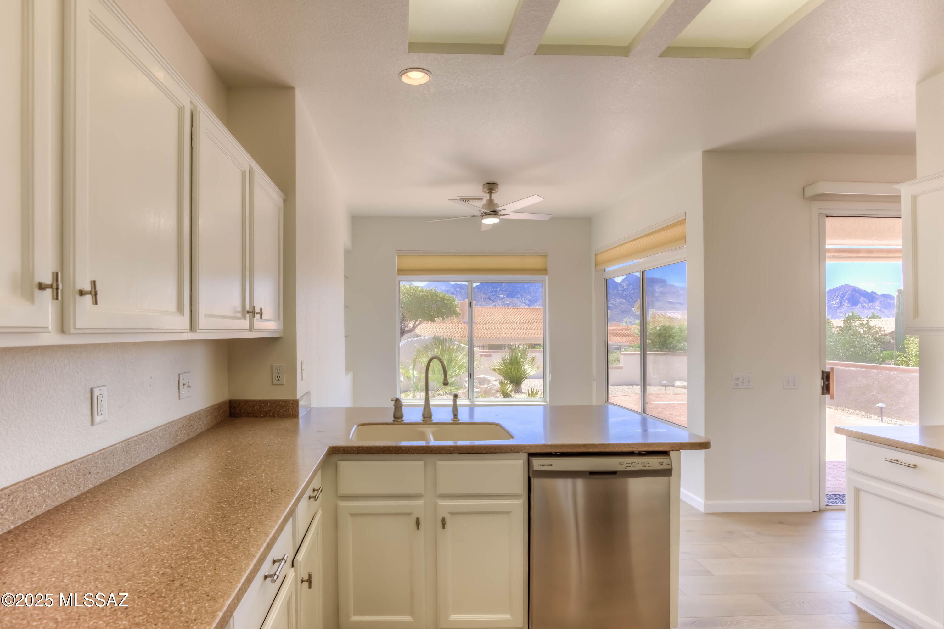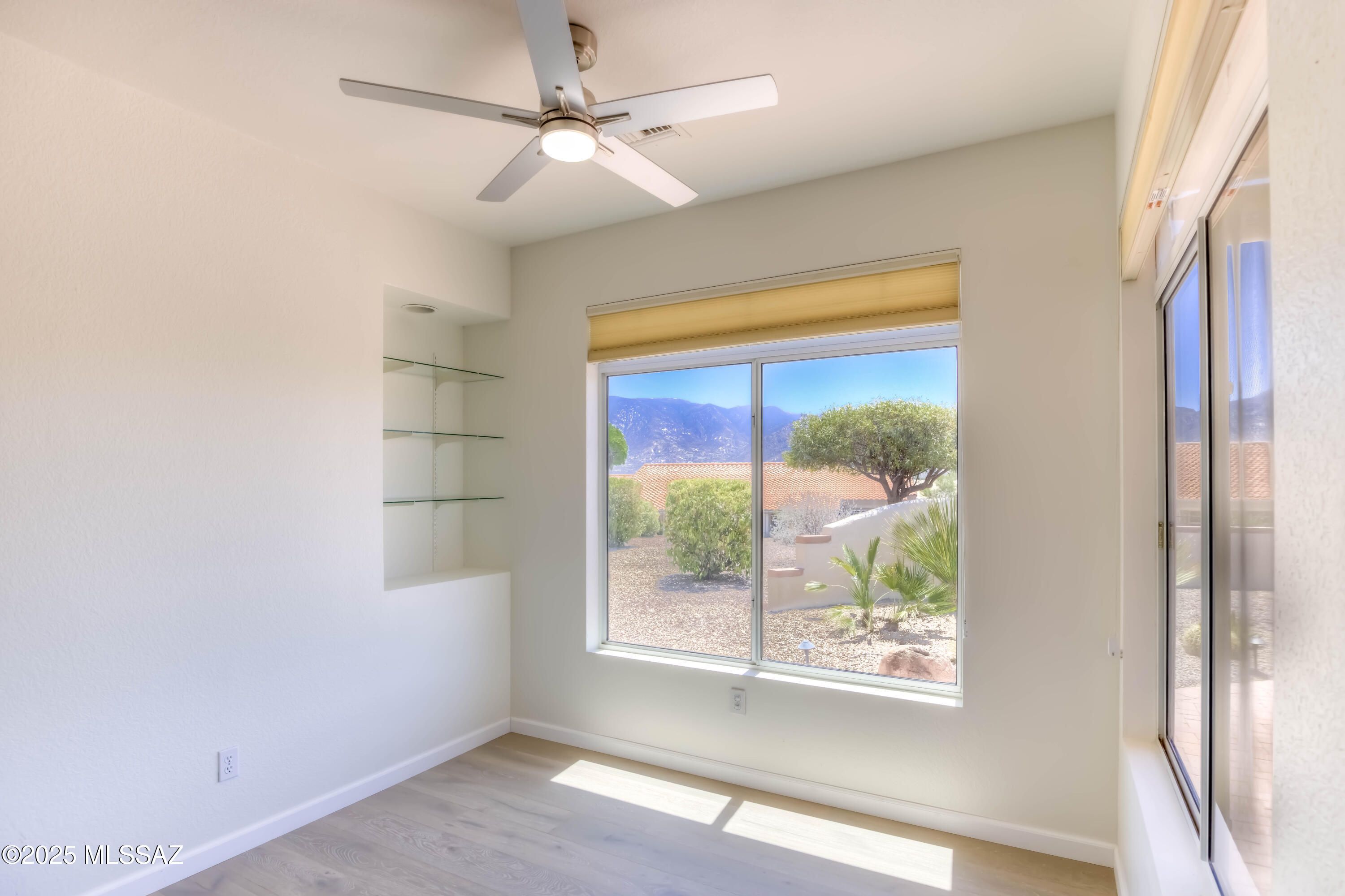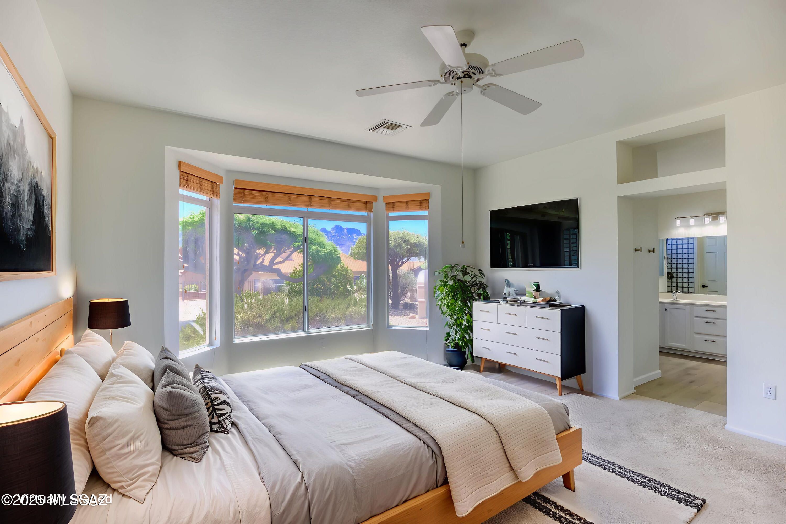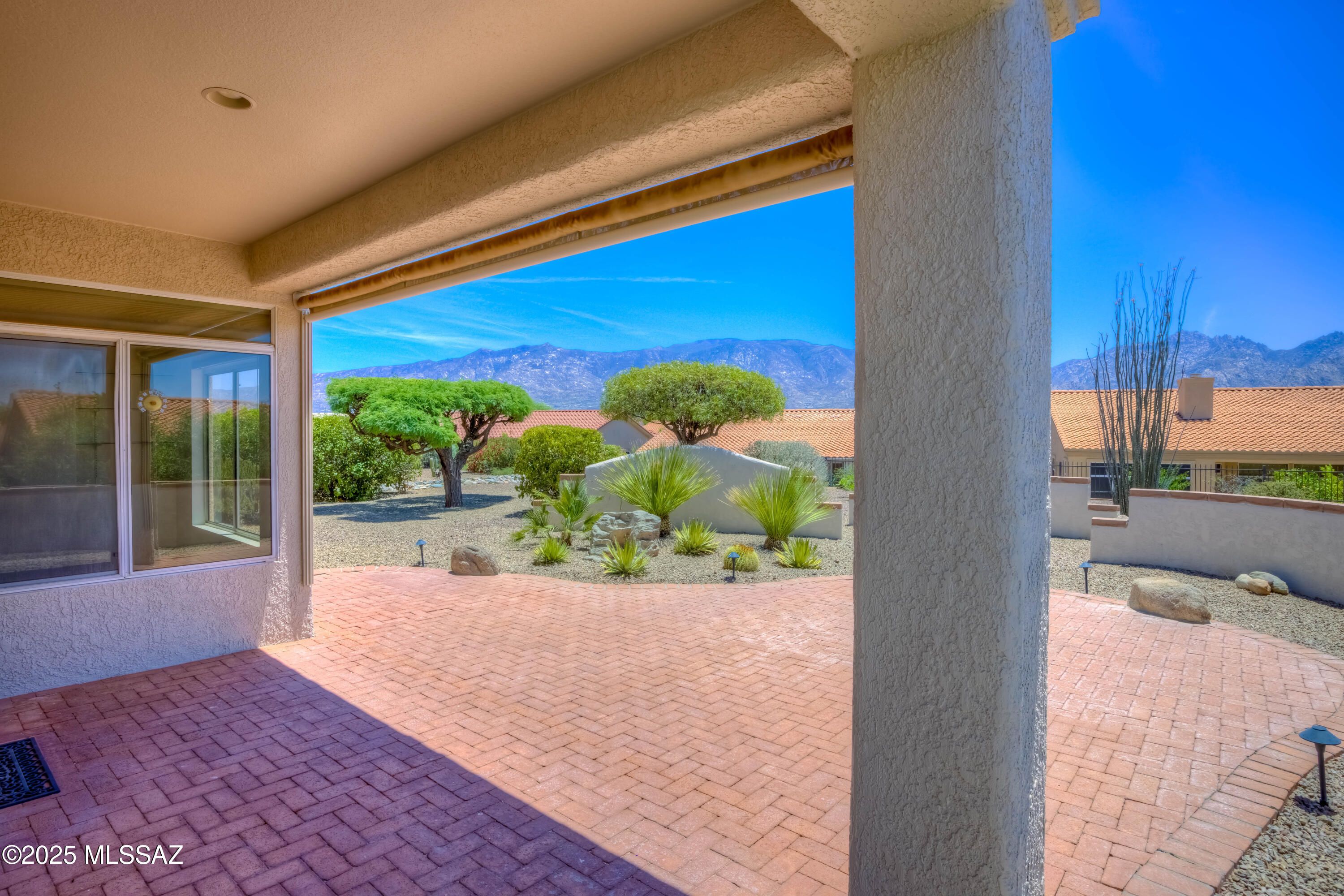 Welcome to your dream retreat in the heart of Sun City Oro Valley with newer interior & exterior paint and carpet! This beautifully designed home offers over 1,700 square feet of comfortable living space, including 2 spacious bedrooms, a versatile den/office, and a bright, open living and dining area--all framed by breathtaking views of the Catalina Mountains from every rear-facing window. The Mohawk brand engineered hardwood flooring in the main living areas, kitchen and bathrooms adds to the beauty and modern feel. The charming kitchen is a chef's delight, featuring a breakfast bar, cozy nook, and new dishwasher. The expansive primary suite boasts a luxurious en suite bathroom with custom etched marble shower surrounds & a generous walk-in closet. Step outside to your private
