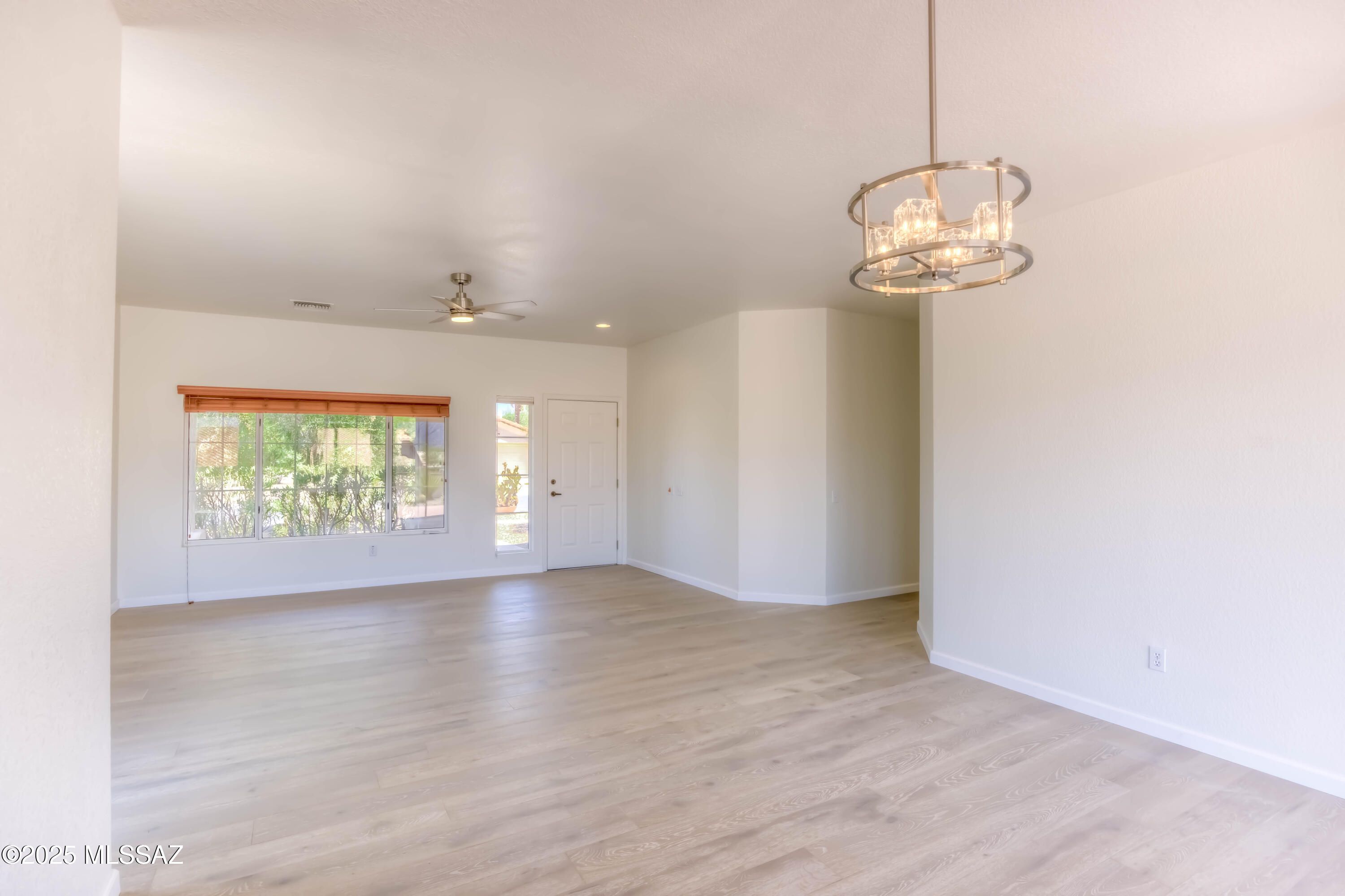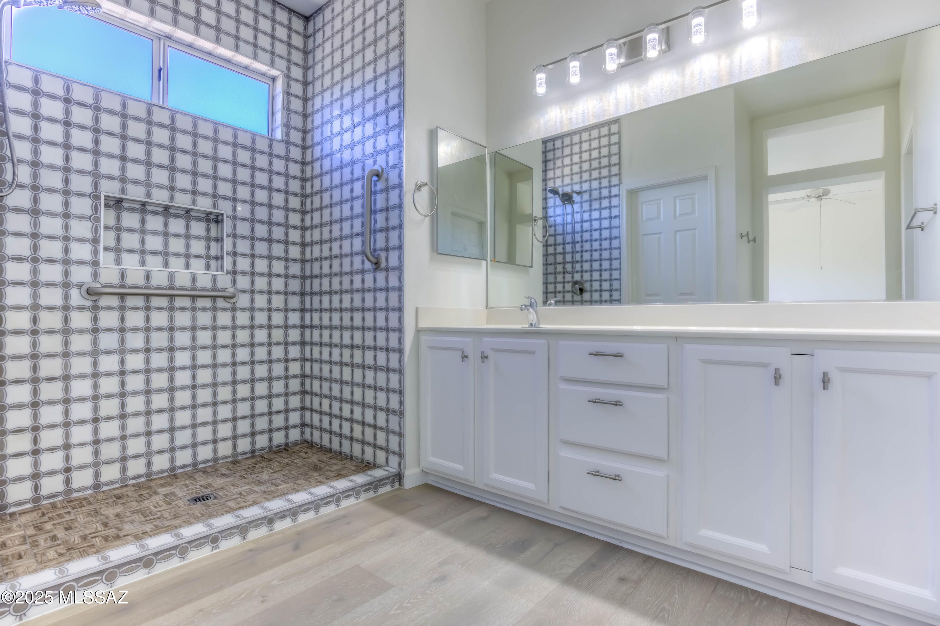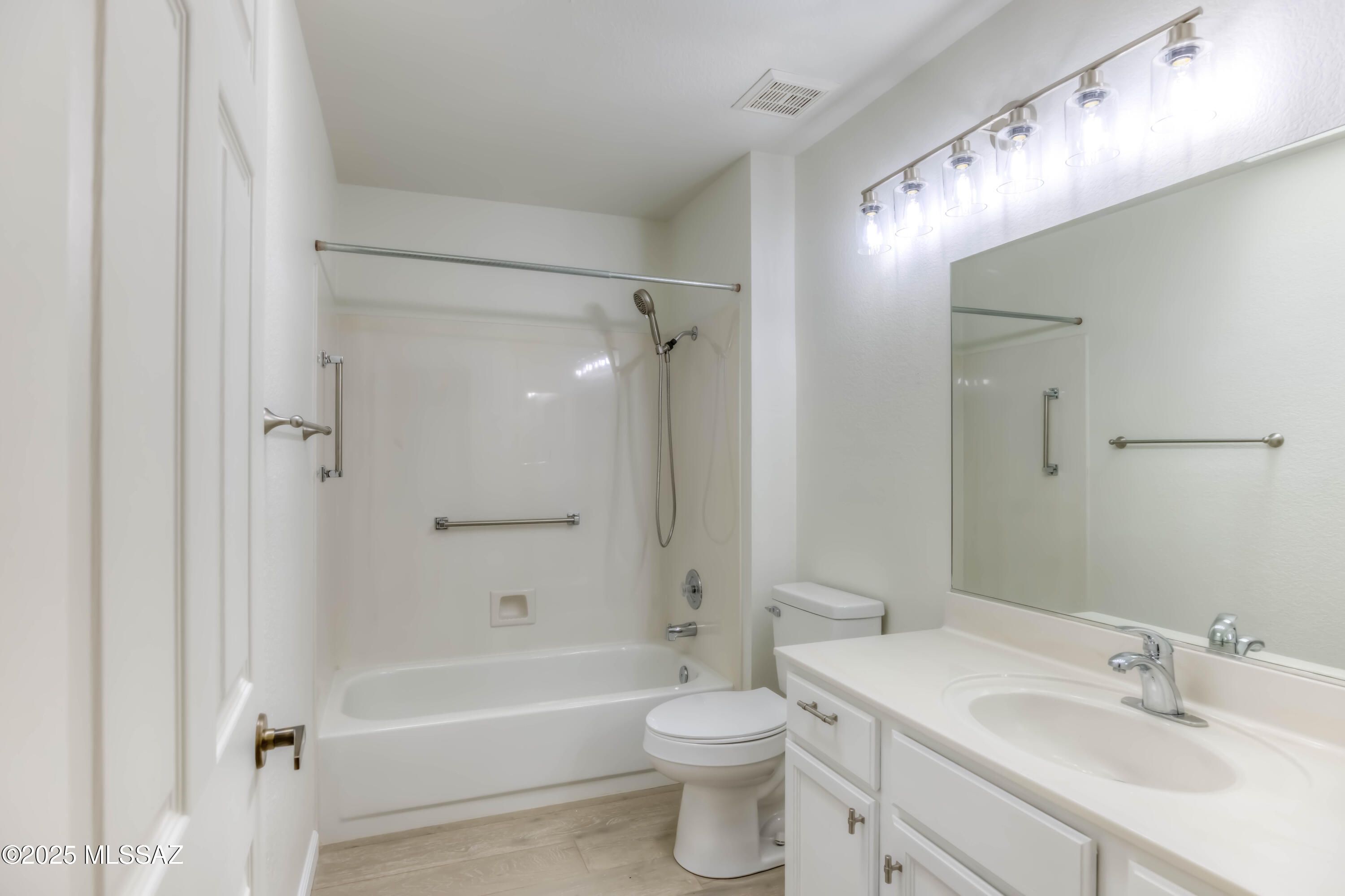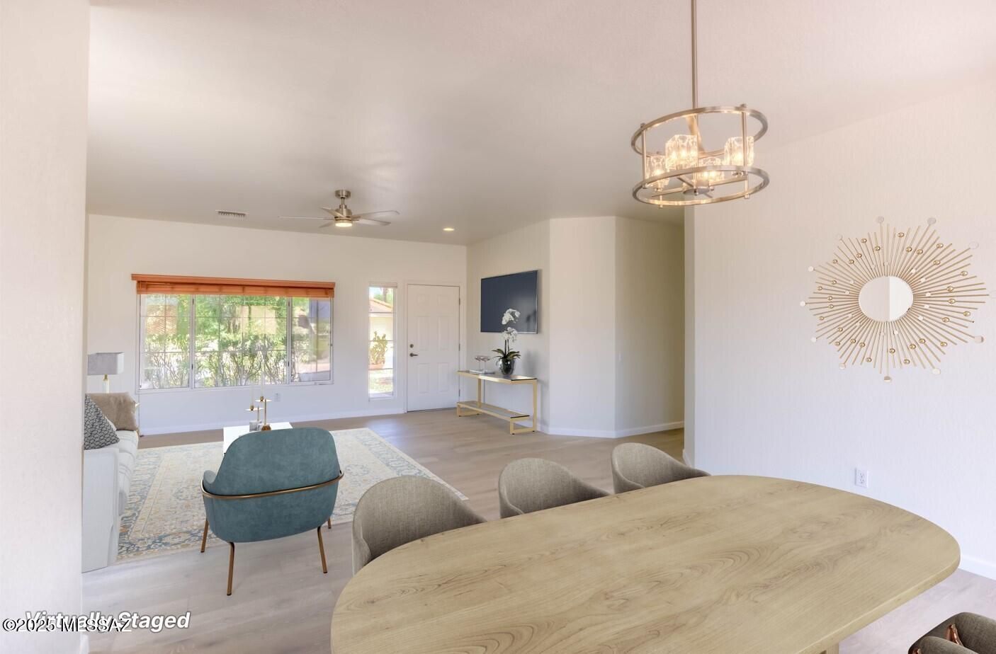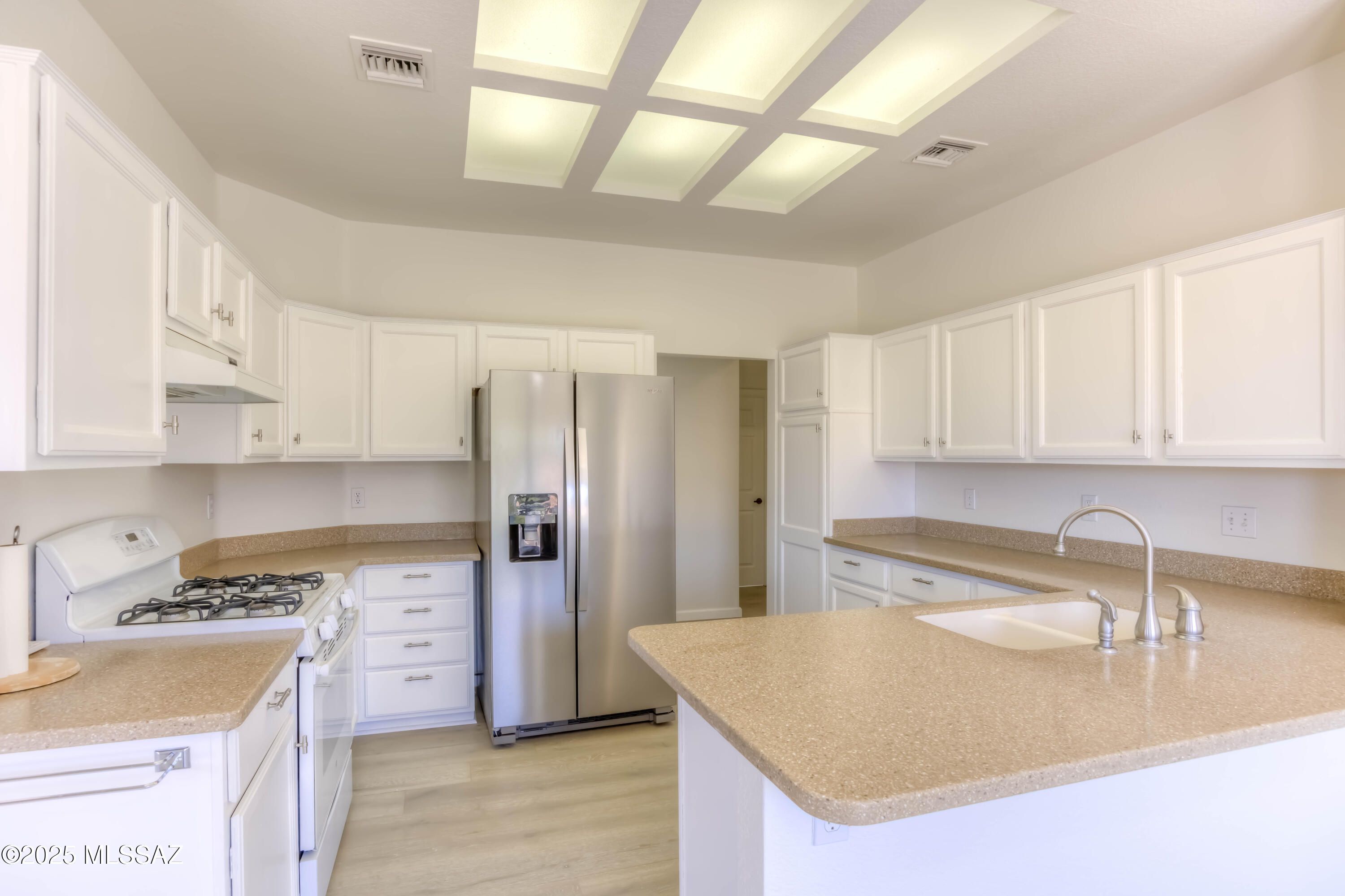 Welcome to your dream retreat in the heart of Sun City Oro Valley with newer interior & exterior paint and carpet! This beautifully designed home offers over 1,700 square feet of comfortable living space, including 2 spacious bedrooms, a versatile den/office, and a bright, open living and dining area--all framed by breathtaking views of the Catalina Mountains from every rear-facing window. The Mohawk brand engineered hardwood flooring in the main living areas, kitchen and bathrooms adds to the beauty and modern feel. The charming kitchen is a chef's delight, featuring a breakfast bar, cozy nook, and new dishwasher. The expansive primary suite boasts a luxurious en suite bathroom with custom etched marble shower surrounds & a generous walk-in closet. Step outside to your private