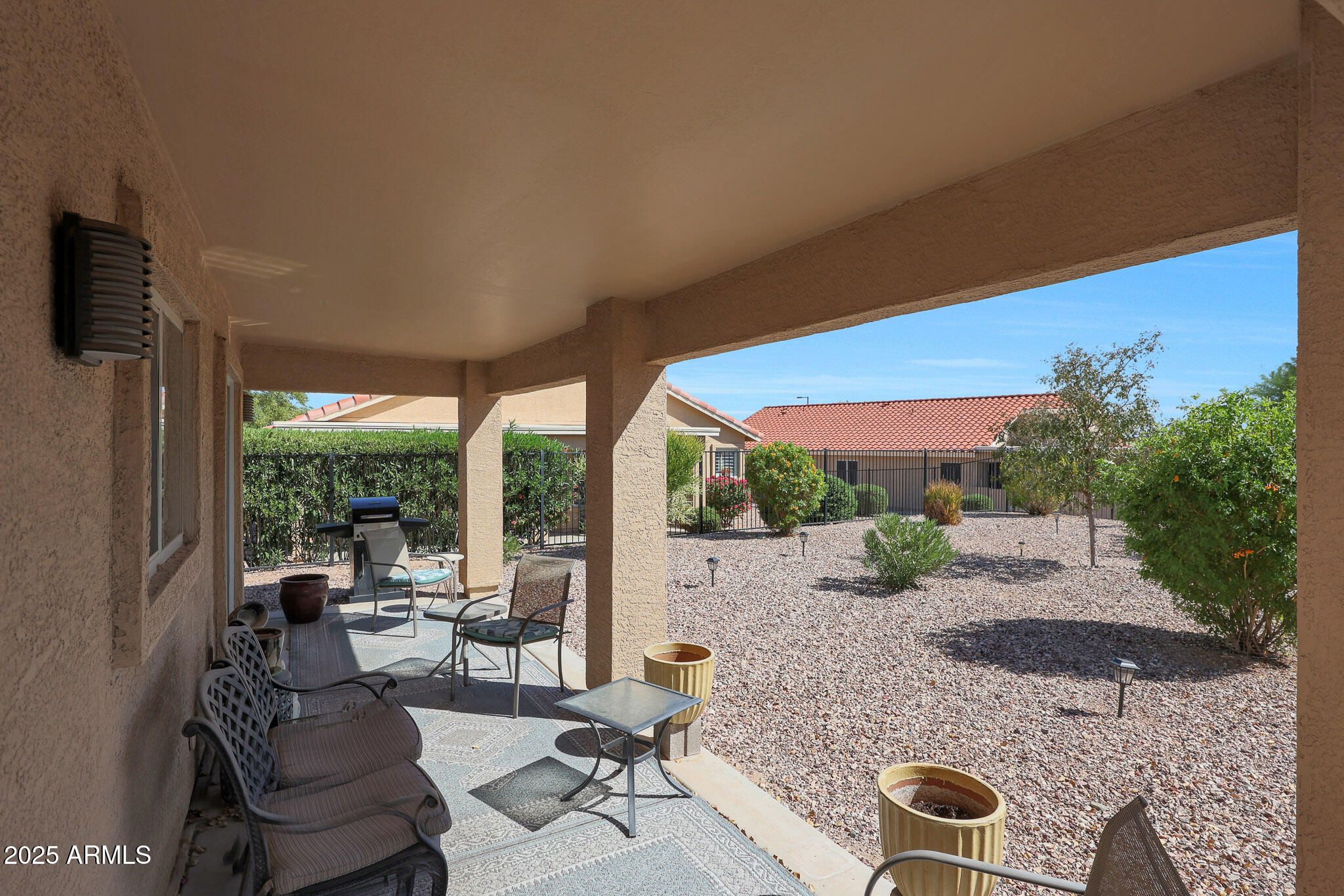Relax and enjoy life in this impeccably maintained two bed, two bath home with a versatile office/sitting room that adds flexible living space. Vaulted ceilings and an inviting open floor plan make entertaining easy, while the bright open kitchen overlooks the beautifully landscaped backyard. Enjoy a shaded covered patio—perfect for morning coffee or evening gatherings—as quail and bunnies visit. The ideal north-south lot and 2-car garage enhance comfort and convenience. Located in Sundance Active Adult Village: enjoy tennis and pickleball, pools and spa, fitness center, billiards, card rooms, library, ballroom, nearby golf (non-HOA), and stunning mountain views.