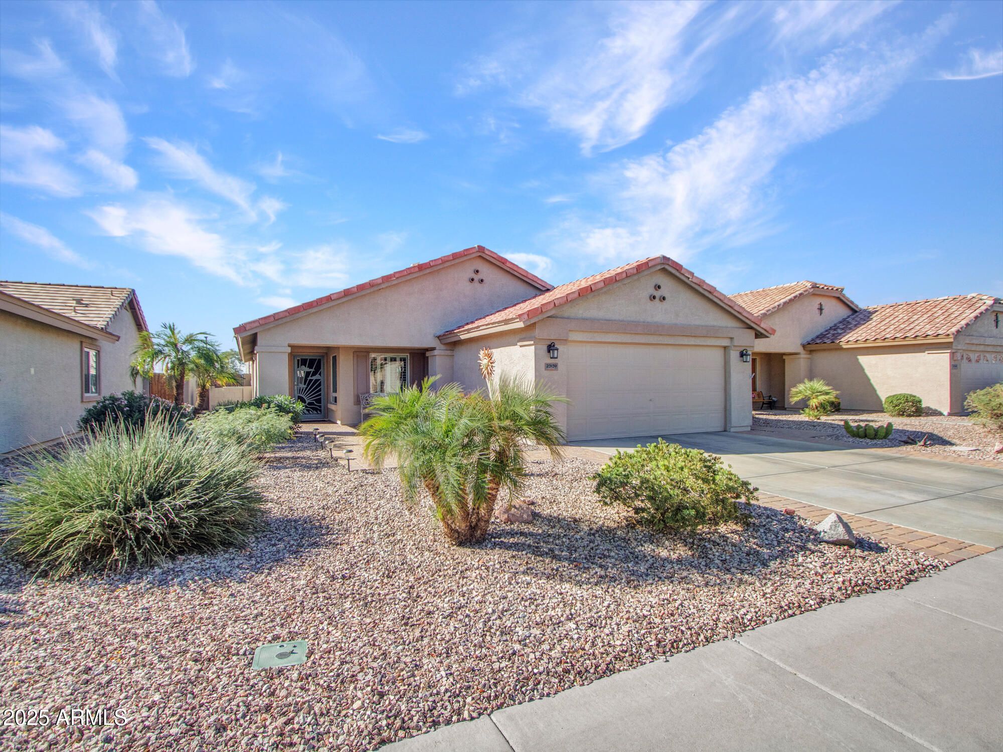 Be ready to enjoy this beautifully maintained 2-bed, 2.5-bath home with a den set in the highly desirable Sundance Active Adult 55+ community. An open and airy floorplan with vaulted ceilings creates a welcoming living space perfect for everyday living and effortless entertaining. The well-appointed kitchen boasts ample cabinetry, pantry, breakfast bar and flows seamlessly to the dining and living areas. Two spacious bedrooms each feature en-suite baths for privacy and convenience, plus a flexible den ideal for a home office or reading nook. Step outside to enjoy Arizona living on the paver-accented backyard with covered patio, perfect for relaxing or hosting guests. Solar panels help boost energy efficiency, and the 2-car garage with epoxy floors adds a touch of style and practicality. Residents enjoy access to Sundance's resort-style amenities including golf, clubhouse, pool, spa, fitness center, tennis and pickleball courts, walking paths, and an active social calendar. Ready for you to embrace the active adult lifestyle!