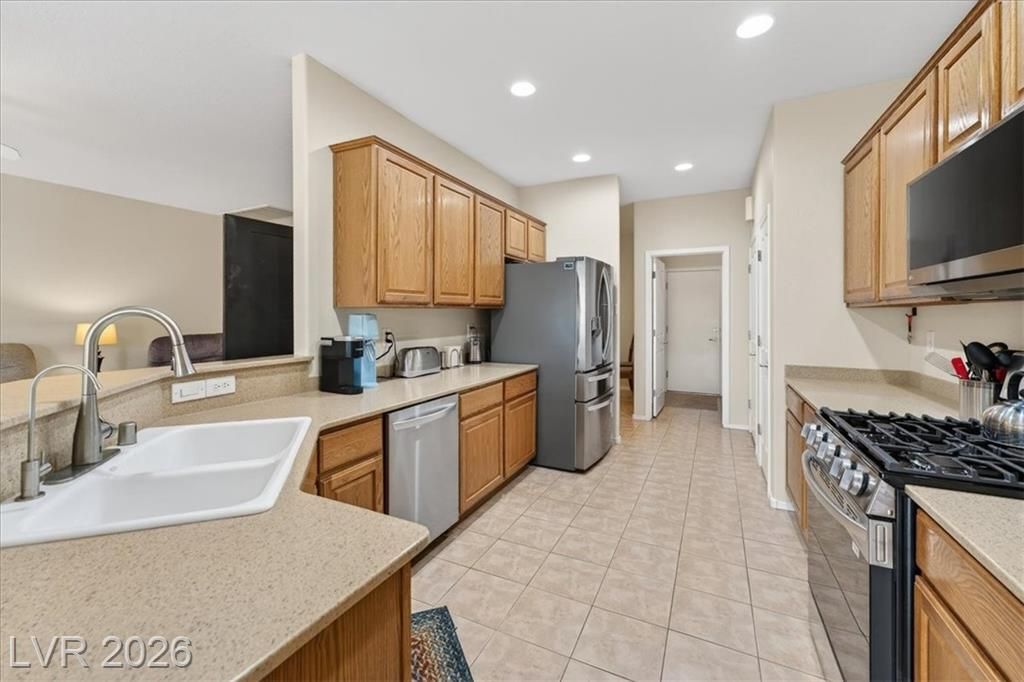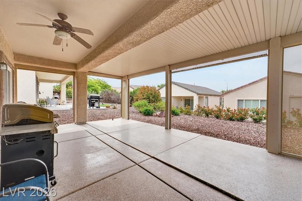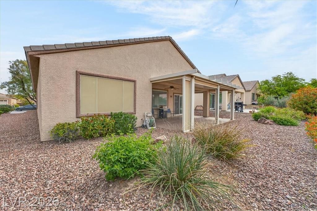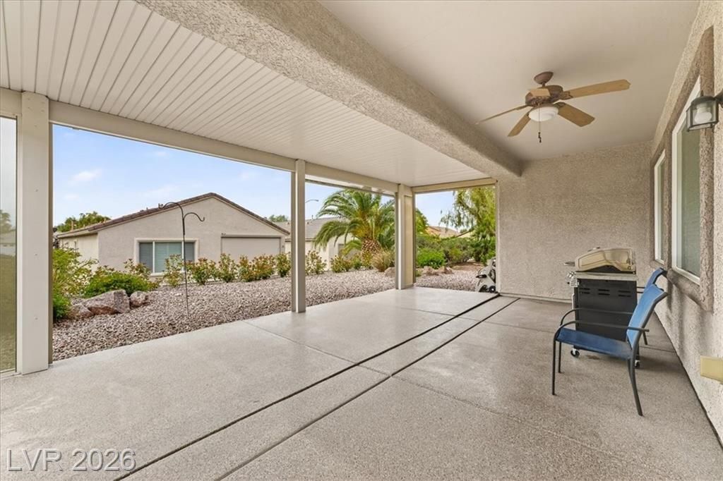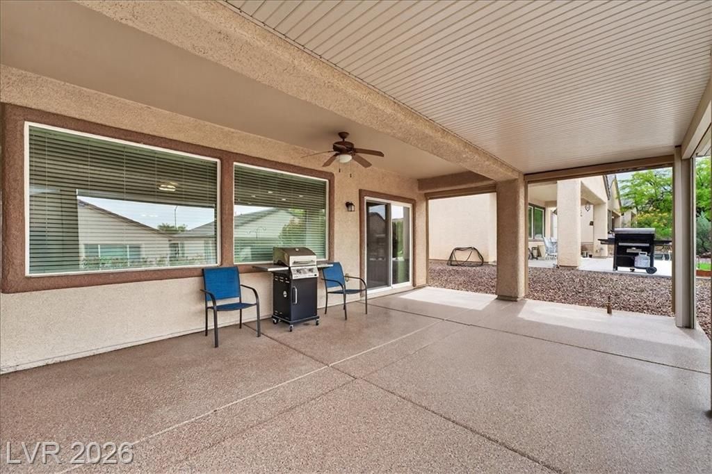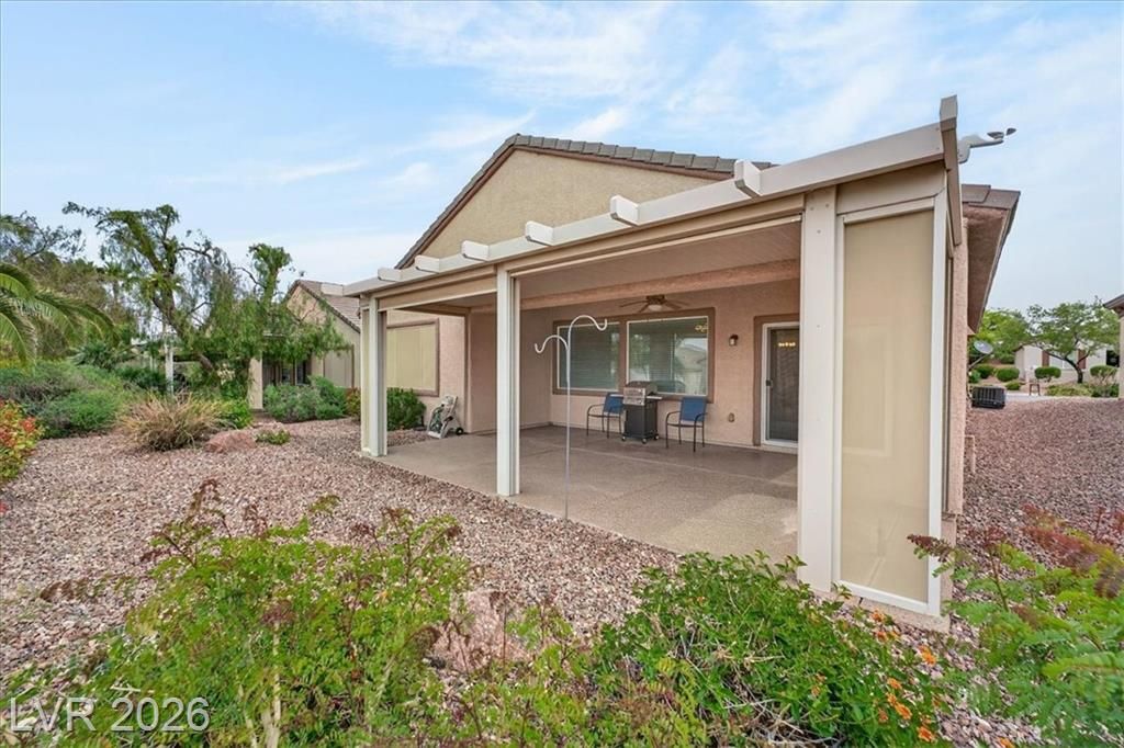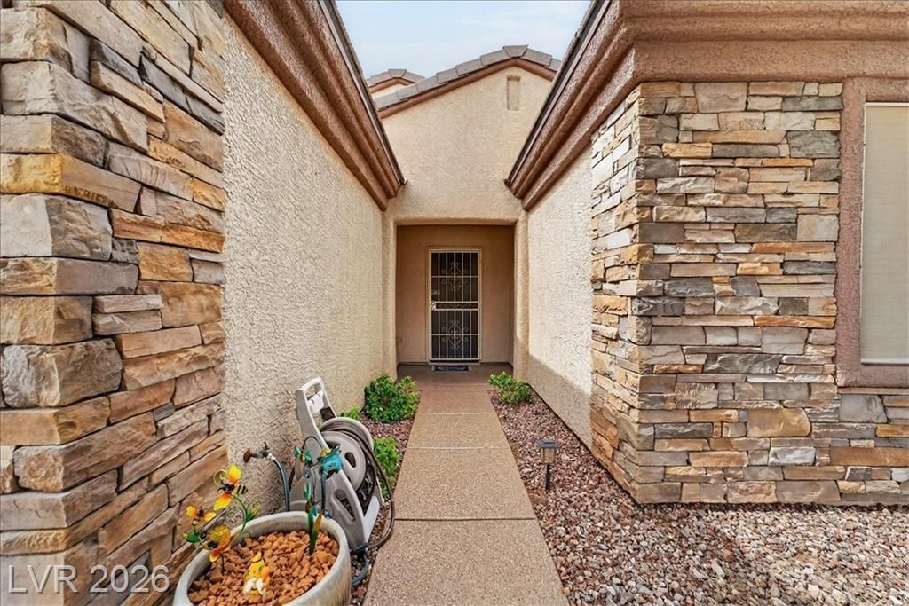 Located in the heart of Solera at Anthem, Henderson's premier Del Webb 55+ community, this open concept 3 bedroom Franklin model features a freshly painted interior with neutral colors throughout. The kitchen boasts all-new stainless steel LG ThinQ Wi-Fi enabled appliances, pantry, & Corian counters. Upgrades galore including stacked stone exterior facade, security gate at the front entry, epoxy driveway & walkway, ceiling fans throughout, and new LG front loader washer & dryer! Major system upgrades include a new HVAC core, new water heater, new garage door opener, all-new comfort height toilets, water softener & reverse osmosis system. Step outside to your extended covered patio featuring motorized remote-control shades, plus included new stainless steel BBQ! IDEAL LOCATION situated just steps from the gorgeous Solera Community Center where residents enjoy a clubhouse, fitness center, indoor pool, outdoor spa, tennis, bocce ball, & more included in your HOA Fees!