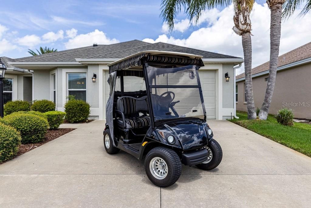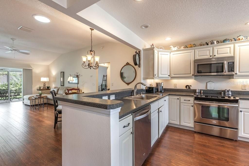 FURNISHED. TURNKEY, GOLF CART INCLUDED! OR furniture can be removed. Step into this impeccable Jasmine floor plan, block and stucco construction, offering 3 bedrooms and 2 baths with a spacious open floor plan. Volume ceilings and stunning Parkay flooring throughout provides a light and modern feel. The kitchen features stainless steel appliances and a charming breakfast nook. The split-bedroom layout includes a pocket door to enter the guest suite, adding privacy for guests. The 2 Large Flexsteel chairs in BR#2 open to twin beds. The primary suite presents a walk-in closet, ensuite bathroom with linen closet and Roman shower. Enjoy Florida living in the screened lanai overlooking the beautifully manicured landscaped surroundings. Located in the desirable Village of Tamarind Grove, close to golf, shopping, dining, and recreation!