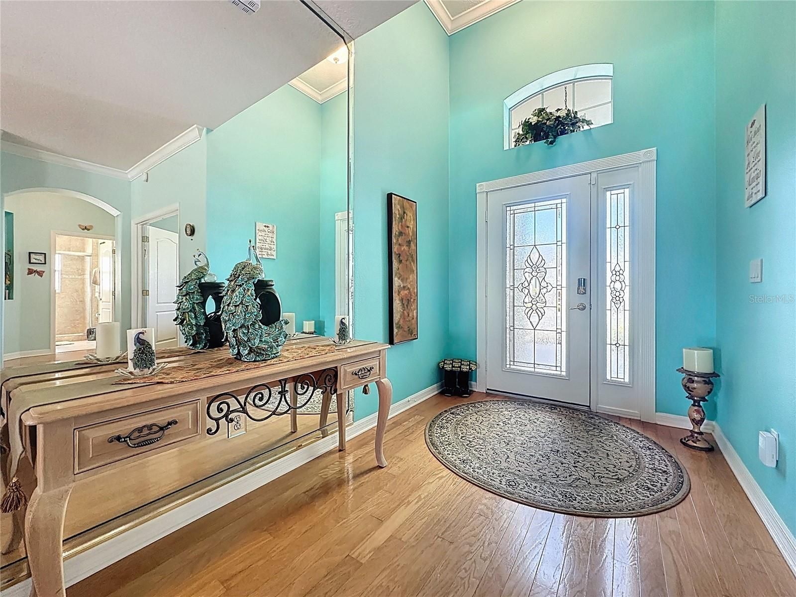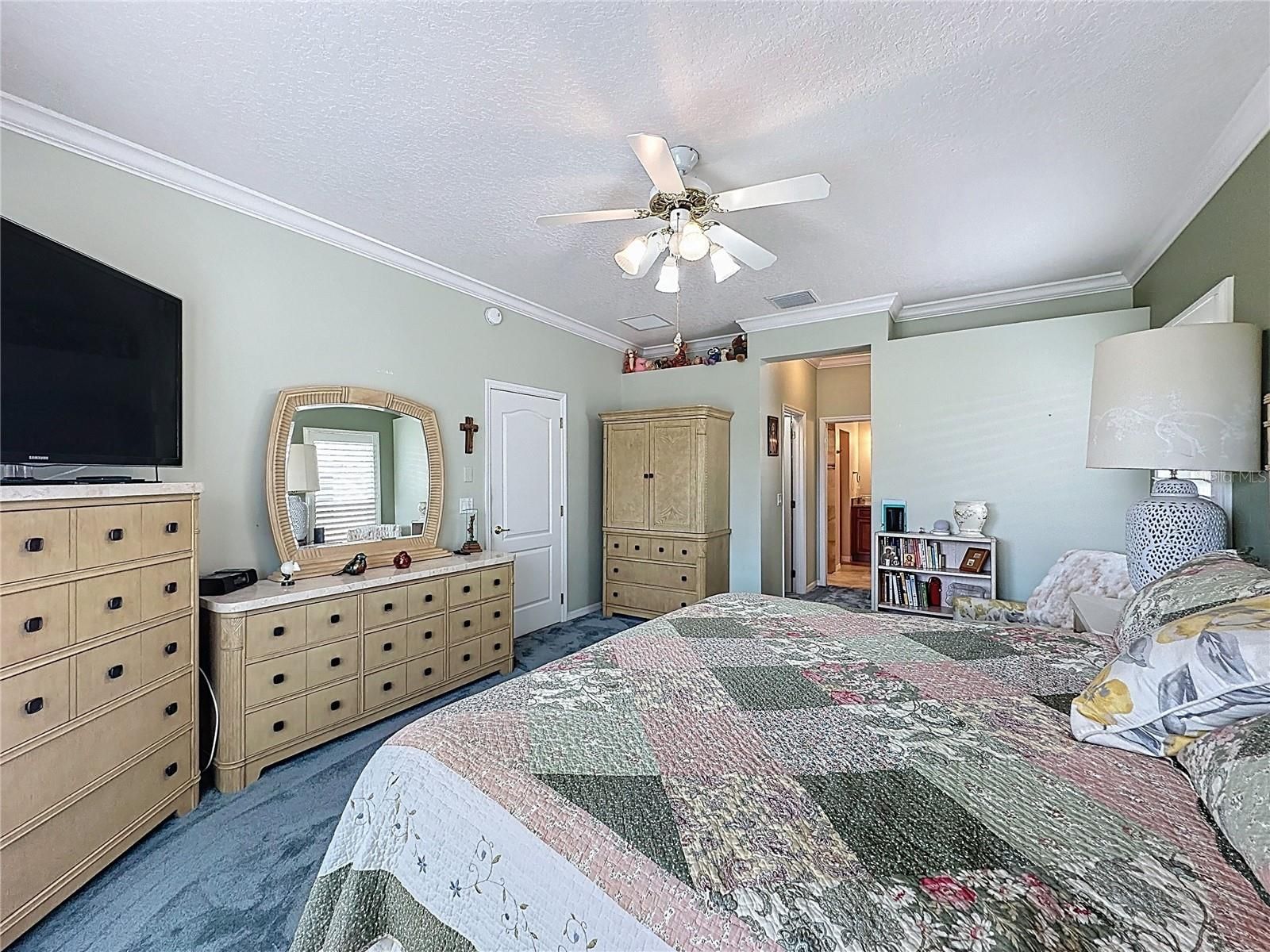 - Ceiling Fan(s), Crown Molding, High Ceilings, Open Floorplan, Main Level Primary, Solid-Wood Cabinets, Stone Counters, Thermostat, Walk-In Closet(s), Window Treatments