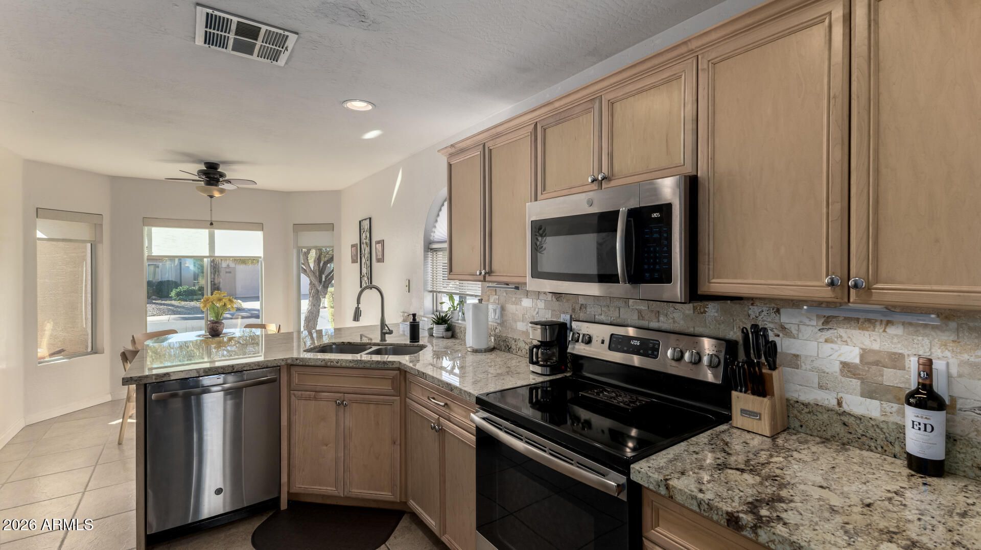 Beautifully upgraded home located in the highly desirable Sundance Adult Community, showcasing true pride of ownership. This meticulously maintained residence features high-end finishes, stainless steel appliances, and a thoughtful layout designed for both comfort and style. With a new 2026 Air Conditioner to keep the termeratures down. Enjoy a stunning, low-maintenance backyard—perfect for entertaining or relaxing year-round. Sundance offers an exceptional active-adult lifestyle with championship golf, resort-style pool, pickleball courts, bingo, fitness and hobby classes, and miles of walking paths. Conveniently located near shopping, dining, and everyday essentials, this home delivers the perfect blend of relaxation, recreation, and convenience.