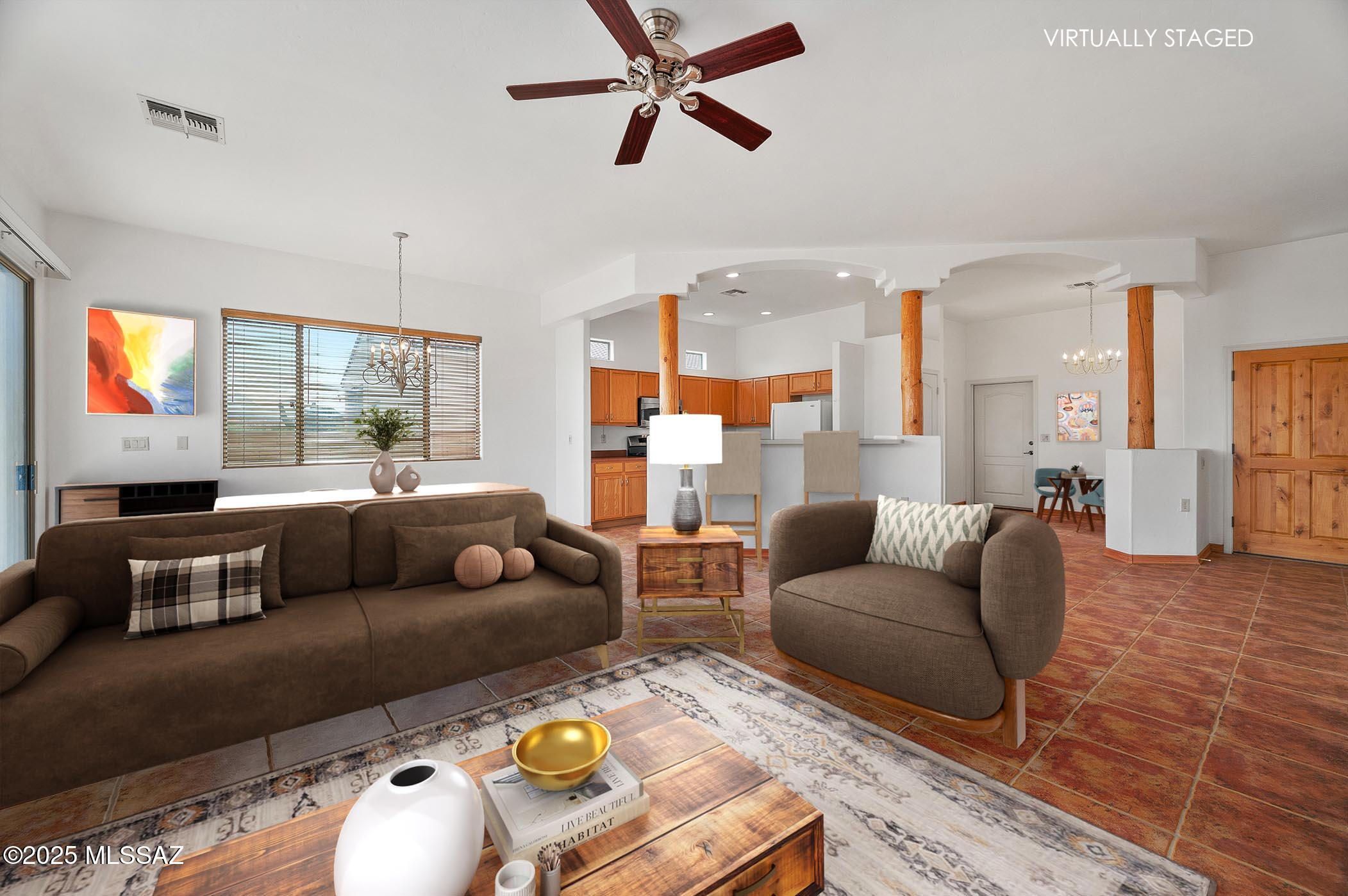 This single-family home in the gated Legends community exemplifies Santa Fe architecture from the curvature of the exterior parapet wall to the interior exposed beams, peeled poles, niches, arches and tile accented beehive fireplace in the great room. A very Southwestern ceramic tile floor pattern carries this theme throughout the home into the split bedrooms and office. Abundant natural light fills the great room bringing sunshine and mountain views. Step out to the east-facing rear patio to witness amazing sunrises, rainbows over the mountains and occasional snow-covered peaks. A mighty saguaro looms tall and majestic over the yard's desertscape.