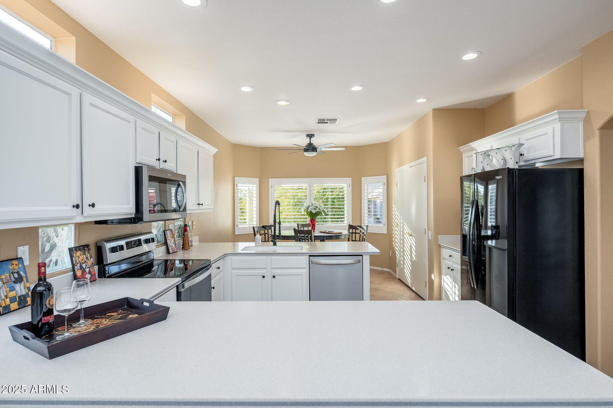 Your Arizona Dream Starts Here. This beautifully maintained 3-bedroom, 3-bath home features a highly desirable split floor plan with 2 private bedroom suites, offering exceptional comfort and flexibility for guests, multigenerational living, or seasonal visitors. With 2,258 sq ft of well-designed living space and a nearly 10,000 sq ft fenced lot, this property delivers privacy, functionality, and room to enjoy the Arizona lifestyle. Built in 1995 and recently refreshed with new exterior paint, the home offers tile throughout the main living areas and no carpet, making it low-maintenance and ideal for both full-time and part-time residents. The kitchen is equipped with stainless steel appliances, plentiful cabinetry, and an open layout that flows seamlessly to the living and dining areas. Owned solar adds year-round energy efficiency for lower electric costs. Located in the desirable north end of Sun City West, this home places you close to scenic walking trails and just minutes from three top golf coursesDesert Trails, Trail Ridge, and Deer Valley. Convenience is at your fingertips with quick access to recreation centers, shopping, restaurants, and medical services. Living in Sun City West means embracing one of Arizona's premier active-adult communities. Residents enjoy access to 7 golf courses, multiple recreation centers, indoor and outdoor pools, fitness facilities, pickleball, bowling, clubs, crafts, and countless social activitiesall designed to support an active, enriching lifestyle. If you're looking for comfort, value, and the perfect blend of relaxation and recreation, this home delivers. Your Arizona Dream Starts Here.