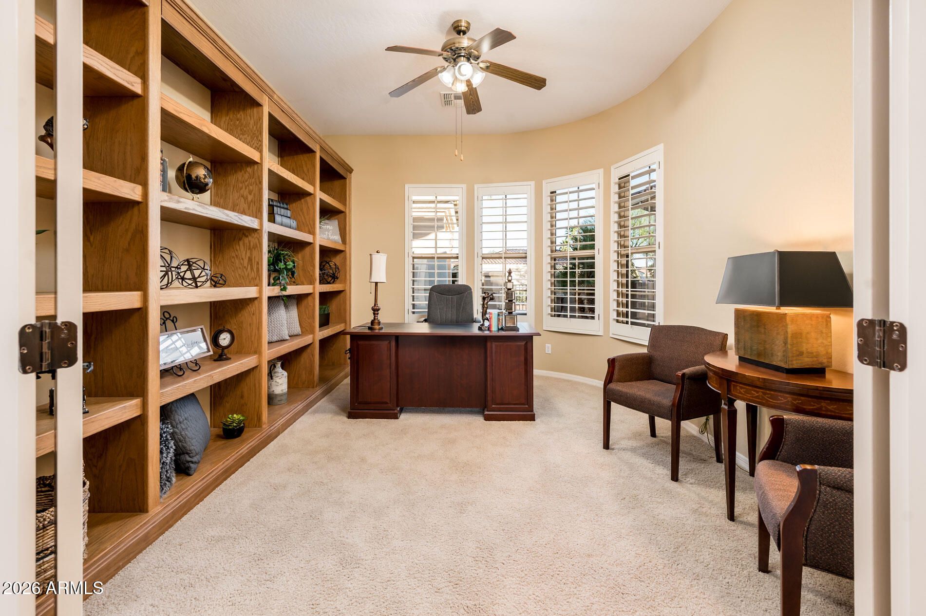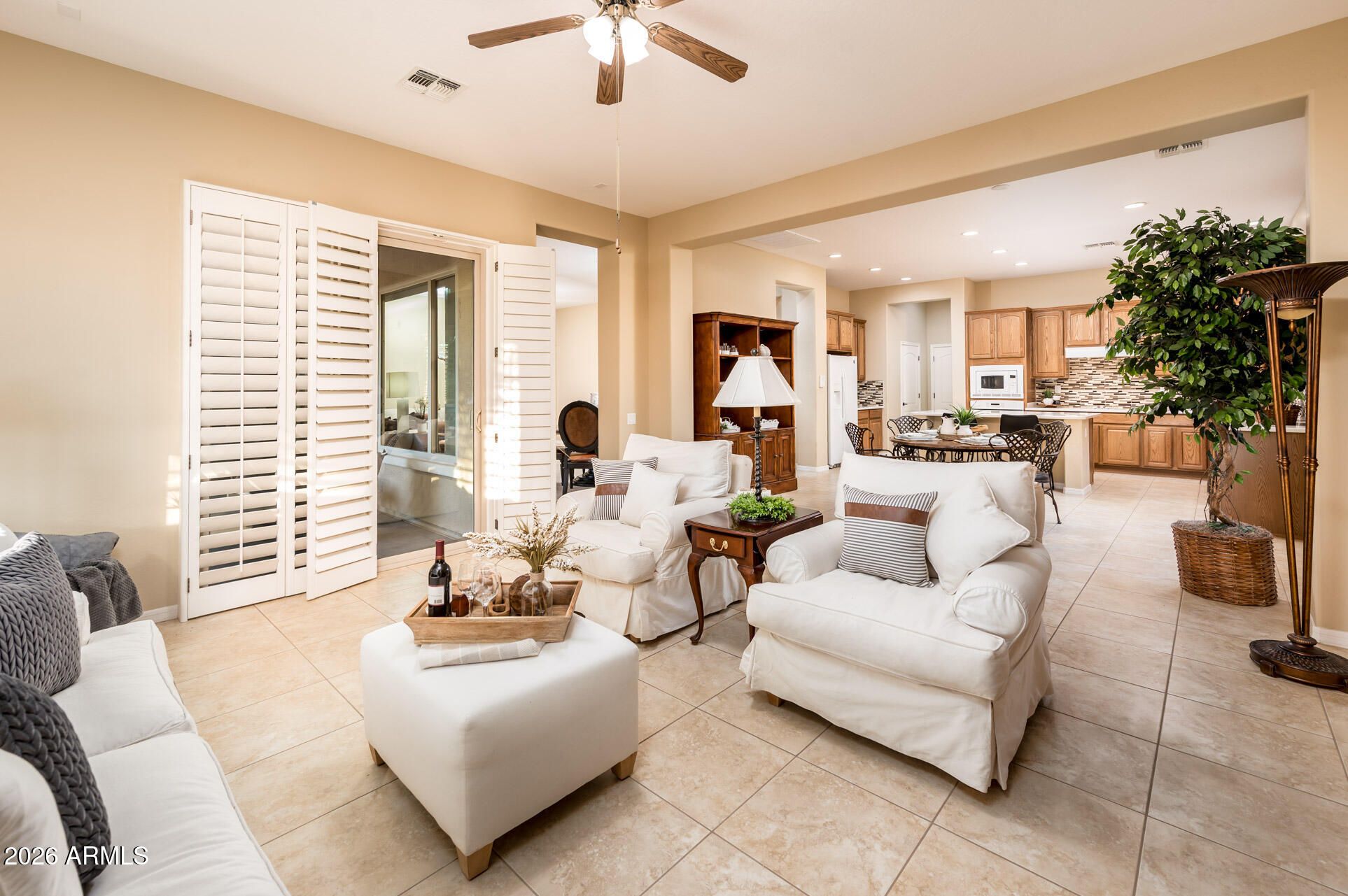 Beautifully maintained Alameda (2,726 sq ft) plus Casita (247 sq ft) on a premier lot in Corte Bella. This 4BD/3.5BA home backs a serene walking path and sits beside a lush greenbelt for exceptional privacy. Split floor plan features a spacious Primary Wing with patio access, large walk-in closet, dual sinks, walk-in shower, and soaking tub. Guest wing offers two bedrooms and full bath. Private Casita is ideal for guests or a studio. Home includes office/den, flexible living/dining, neutral tile, and shutters throughout. Rear patio offers firepit, water feature, and tranquil outdoor living. Gently lived in by seasonal owners. Exceptional price, premier location, and pristine condition--this home ranks among Corte Bella's finest.