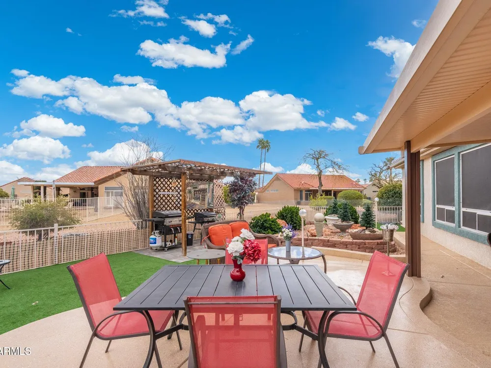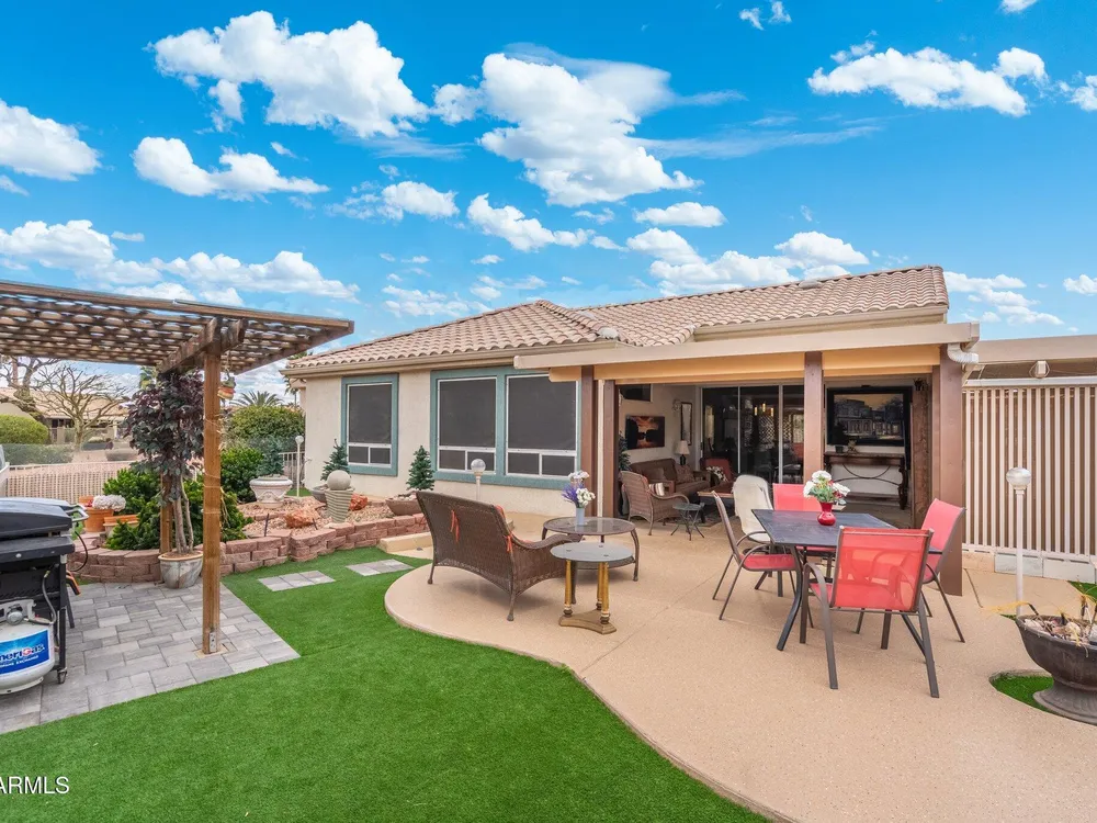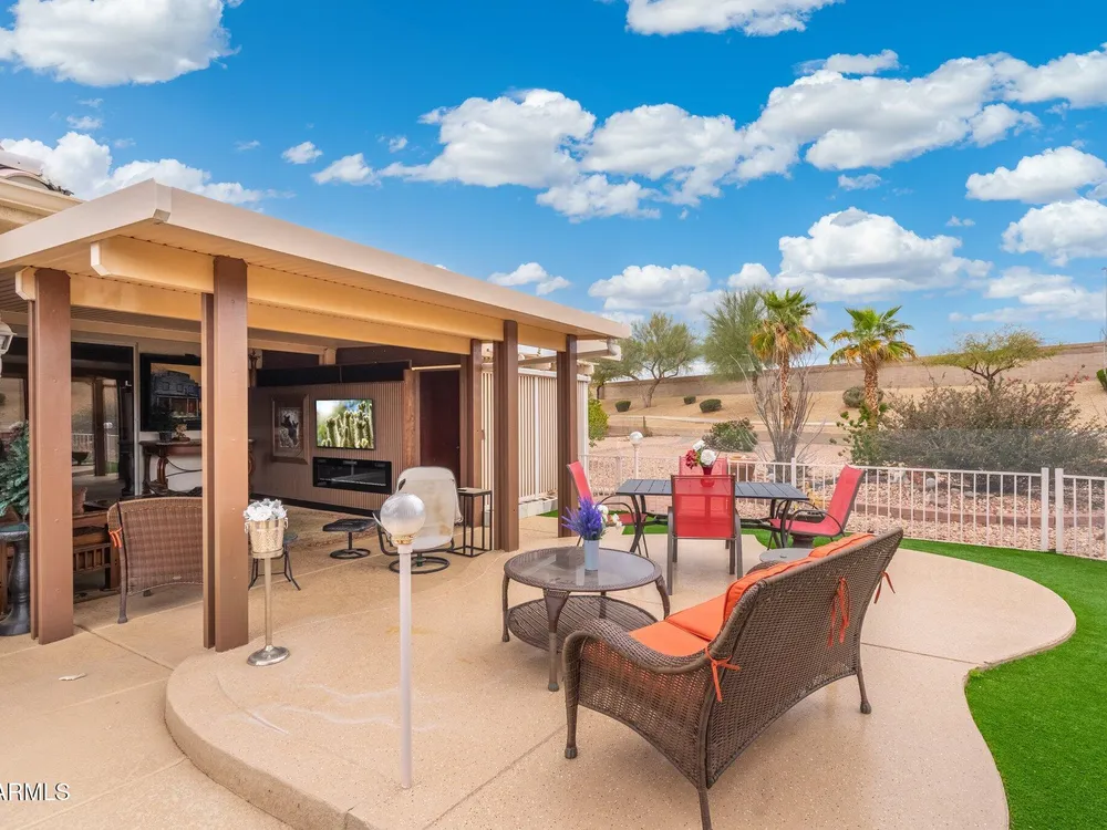 Incredible furnished home for sale in Sun City West. This 2300 sq ft. Flagstaff model is being offered for sale Totally furnished. 2 electric fireplaces, 5 TV's. All appliances with a gas stove and stainless-steel fridge, dishwasher, microwave and oven. All kitchen items including dishes and utensils. Leather couches and recliners. Dining room table/pool table combination with chairs. Large patio area with all patio furniture 2 Blackstone Grills and spacious back yard with plenty of room if want to add a POOL. The home is located in a Cul de sac and has plenty of parking. The roof was replaced 3 years ago and Solar has been added for low utility bills. New HVAC system approx. 16,000 K put in in 2024 This home has lots of upgrades and can offer full three bedrooms and an Office. Washer and dryer included. Take a view online or in person of this great home and see if it fits your needs. You will not be disappointed to see the space and all that it offers. Yard has green space and great entertaining area. A side area with a closed in room that can be used for storage. Walking paths and privacy directly behind the home for your enjoyment. If you are looking to become a Snowbird or to retire in AZ this house gives you a great start.