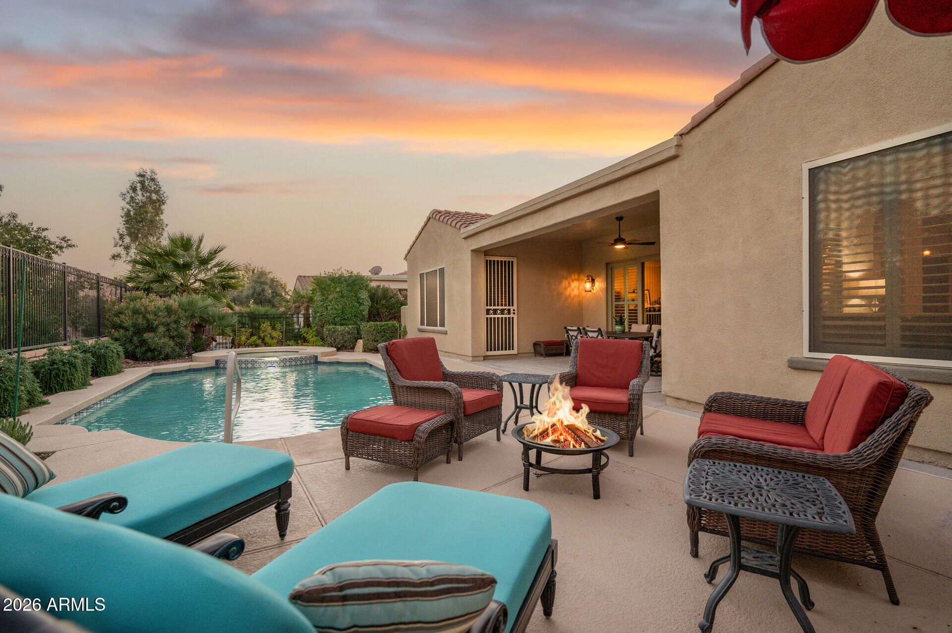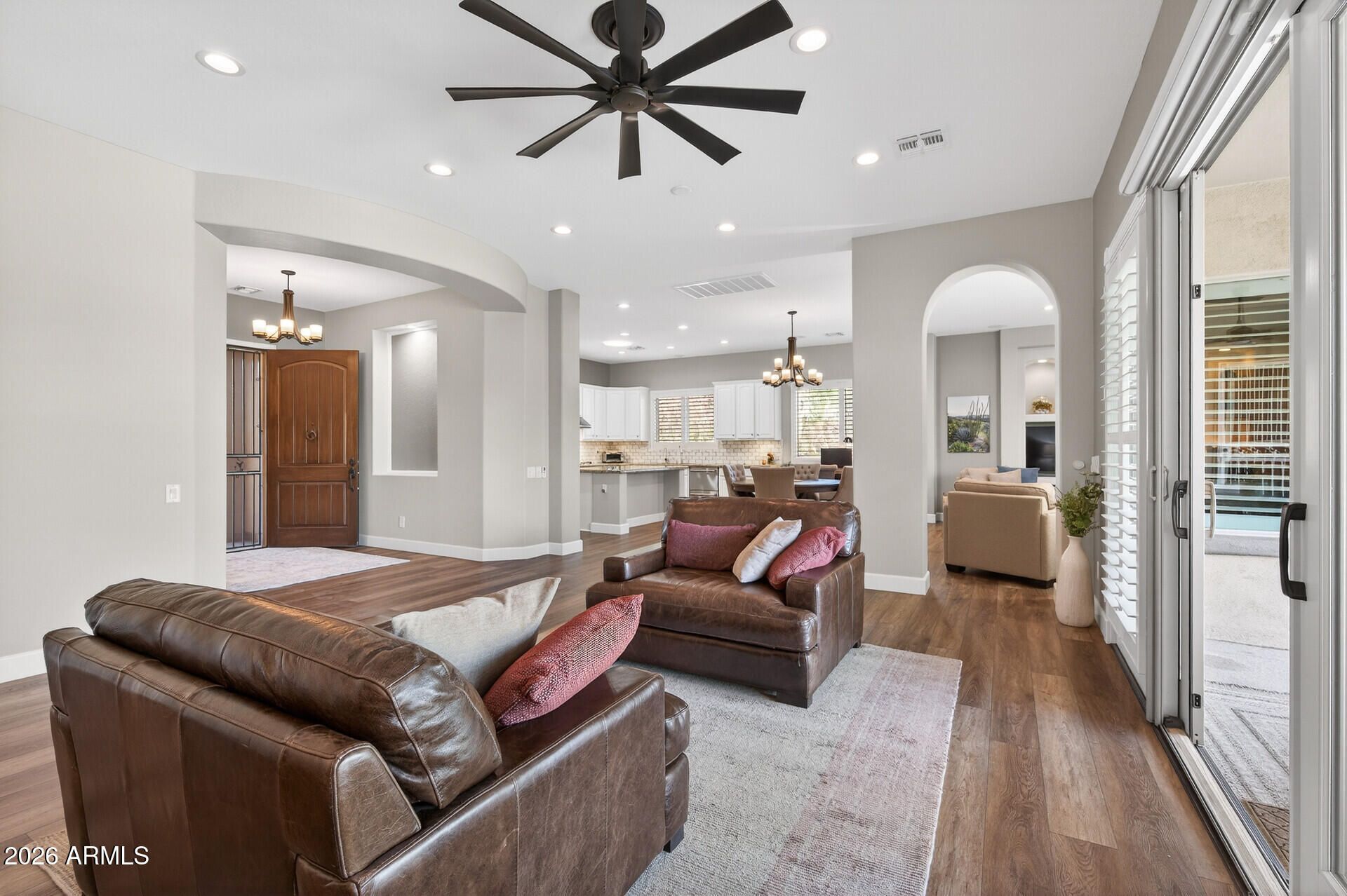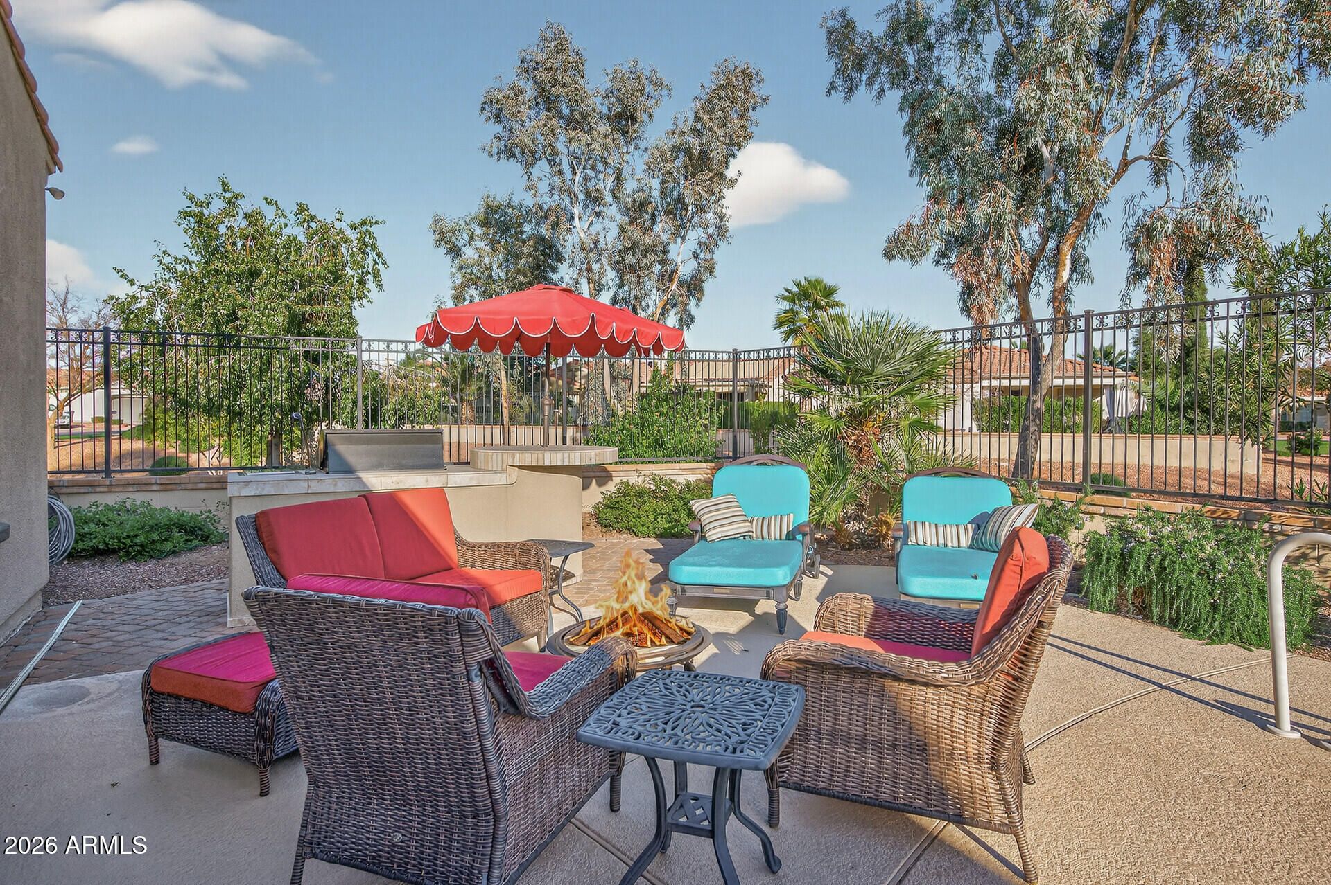 Welcome to this exceptional POOL & SPA Home on a PRIME Lot in the gated community of Corte Bella! With 3 full bedrooms plus a den large enough to be a 4th bedroom, this Alameda has been thoughtfully and masterfully updated, blending modern style with resort-style living in a prime greenbelt location along the walking trail—offering more privacy than most. The interior has been extensively remodeled, including removal of a dividing kitchen wall to create a bright, open, flowing floor plan. Enjoy new LVP flooring, tall craftsman-style baseboards, Hunter Douglas plantation shutters & Vignette blinds, and fresh interior & exterior paint. The stunning kitchen features bull-nosed granite countertops, refinished cabinets, Daltile backsplash, and a new GE Café stainless steel appliance suite, including a two-drawer dishwasher, plus reverse osmosis filtration at the sink and refrigerator. New ceiling fans and LED lighting with dimmer switches complete the polished look. Seamless indoor/outdoor living awaits with a full-glass sliding French door opening to a spacious backyard retreat. Outside, relax or entertain under the covered patio, take a dip in the sparkling Pebbletec pool and spa (new variable speed pool pump), or enjoy the built-in BBQ with fridge and workstation, perfect for Arizona living & entertaining. Convenient large indoor laundry room with granite counter tops, additional cabinets, utility sink and new front load LG Washer & Dyer on pedestals. The seasonal owners are offering this fabulous home fully furnished, featuring brand name, modern, contemporary furnishings just two years old and hardly used. With its true 3-bedroom layout, oversized office/den, premium updates, resort-style backyard, and unbeatable location, this home is truly one-of-a-kind. Move-in ready. Fully furnished. Prime Corte Bella living at it's finest!