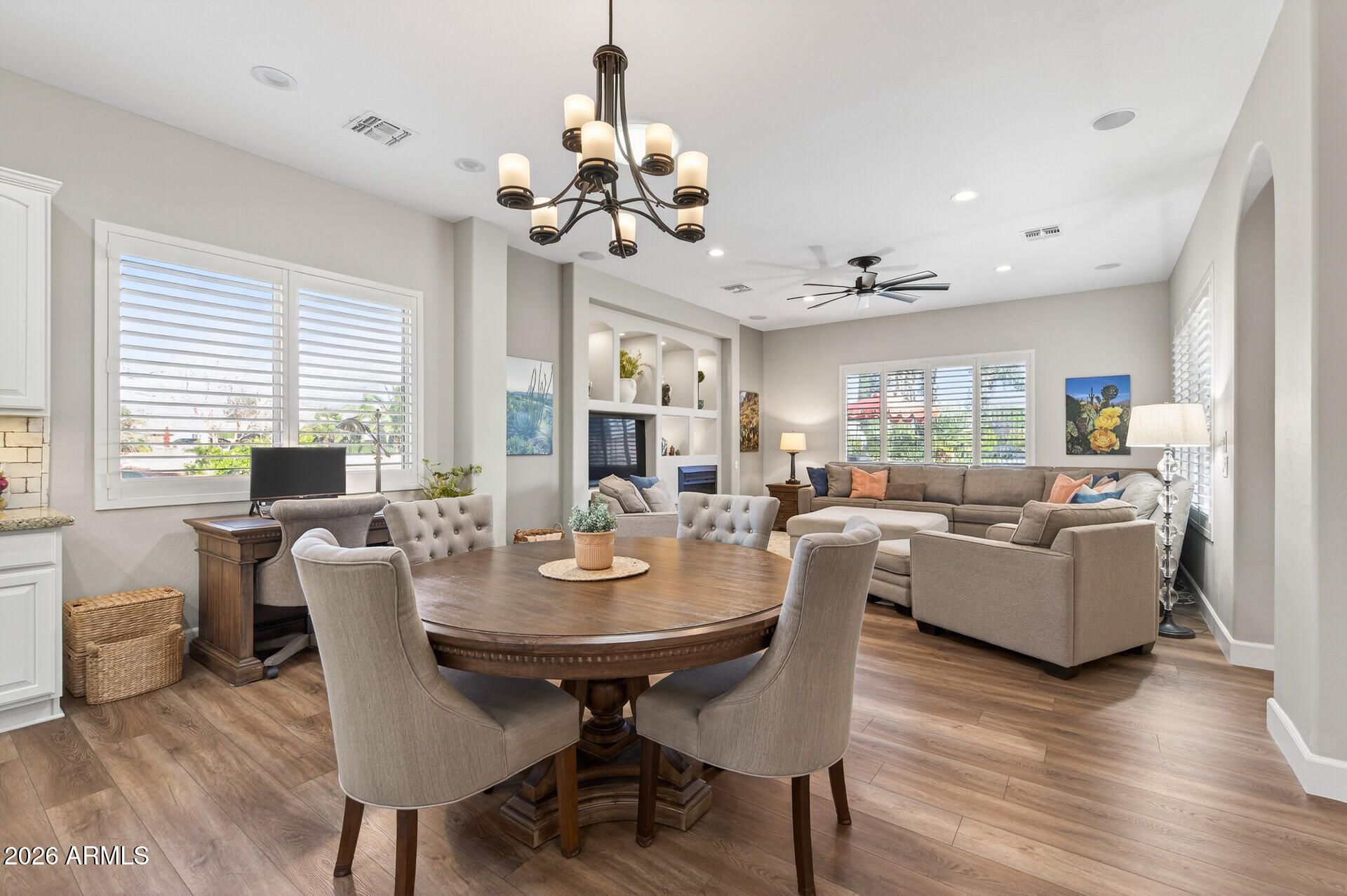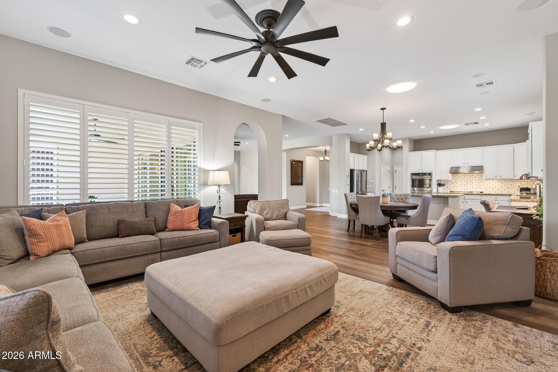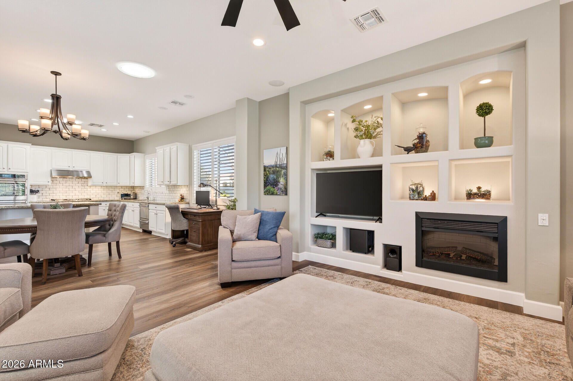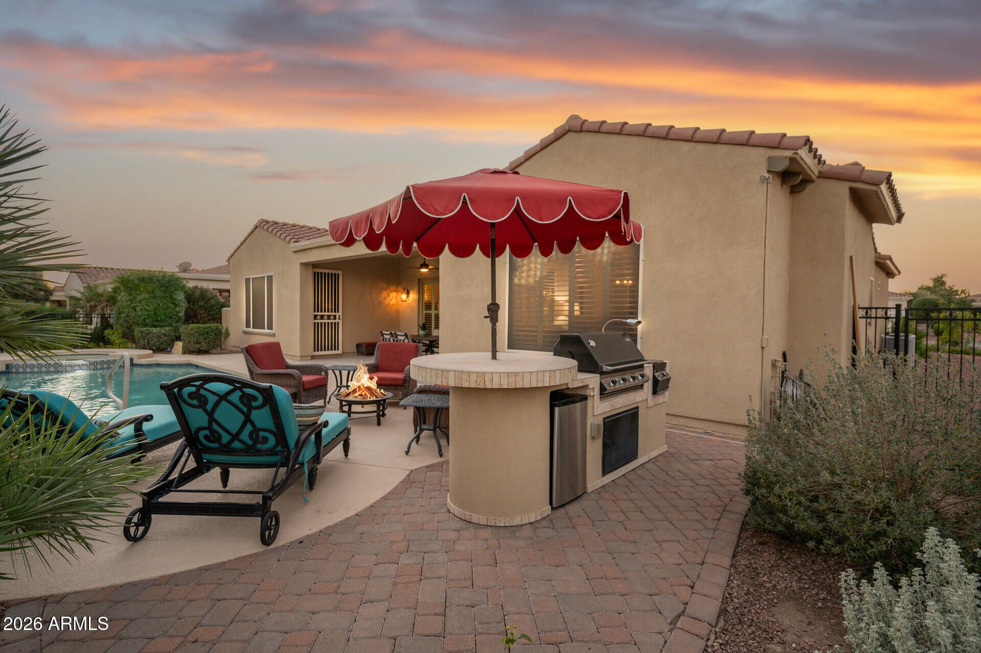 Welcome to this exceptional POOL & SPA Home on a PRIME Lot in the gated community of Corte Bella! With 3 full bedrooms plus a den large enough to be a 4th bedroom, this Alameda has been thoughtfully and masterfully updated, blending modern style with resort-style living in a prime greenbelt location along the walking trail—offering more privacy than most. The interior has been extensively remodeled, including removal of a dividing kitchen wall to create a bright, open, flowing floor plan. Enjoy new LVP flooring, tall craftsman-style baseboards, Hunter Douglas plantation shutters & Vignette blinds, and fresh interior & exterior paint. The stunning kitchen features bull-nosed granite countertops, refinished cabinets, Daltile backsplash, and a new GE Café stainless steel appliance suite, including a two-drawer dishwasher, plus reverse osmosis filtration at the sink and refrigerator. New ceiling fans and LED lighting with dimmer switches complete the polished look. Seamless indoor/outdoor living awaits with a full-glass sliding French door opening to a spacious backyard retreat. Outside, relax or entertain under the covered patio, take a dip in the sparkling Pebbletec pool and spa (new variable speed pool pump), or enjoy the built-in BBQ with fridge and workstation, perfect for Arizona living & entertaining. Convenient large indoor laundry room with granite counter tops, additional cabinets, utility sink and new front load LG Washer & Dyer on pedestals. The seasonal owners are offering this fabulous home fully furnished, featuring brand name, modern, contemporary furnishings just two years old and hardly used. With its true 3-bedroom layout, oversized office/den, premium updates, resort-style backyard, and unbeatable location, this home is truly one-of-a-kind. Move-in ready. Fully furnished. Prime Corte Bella living at it's finest!