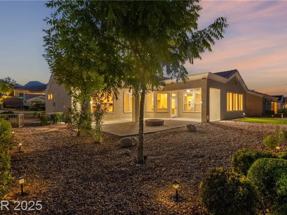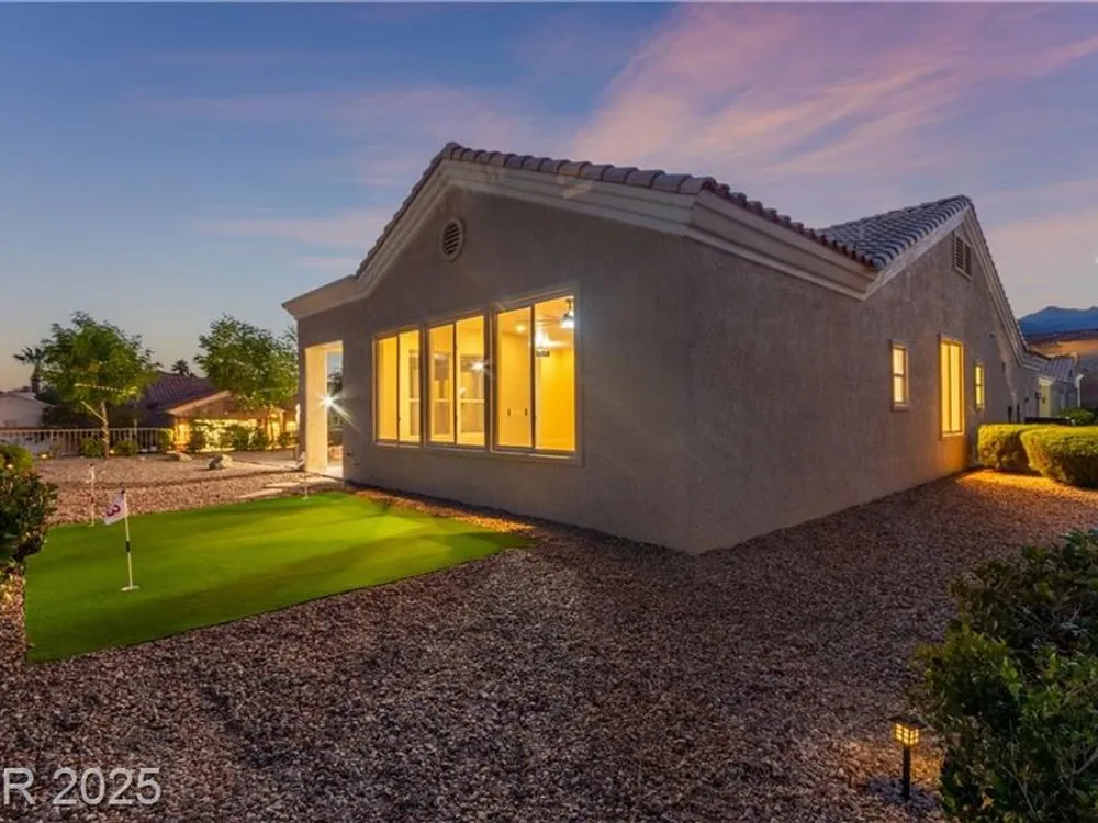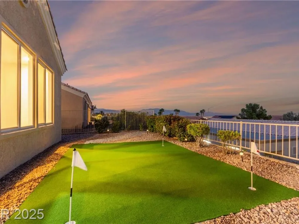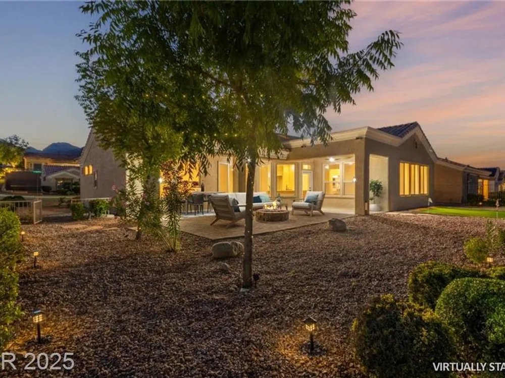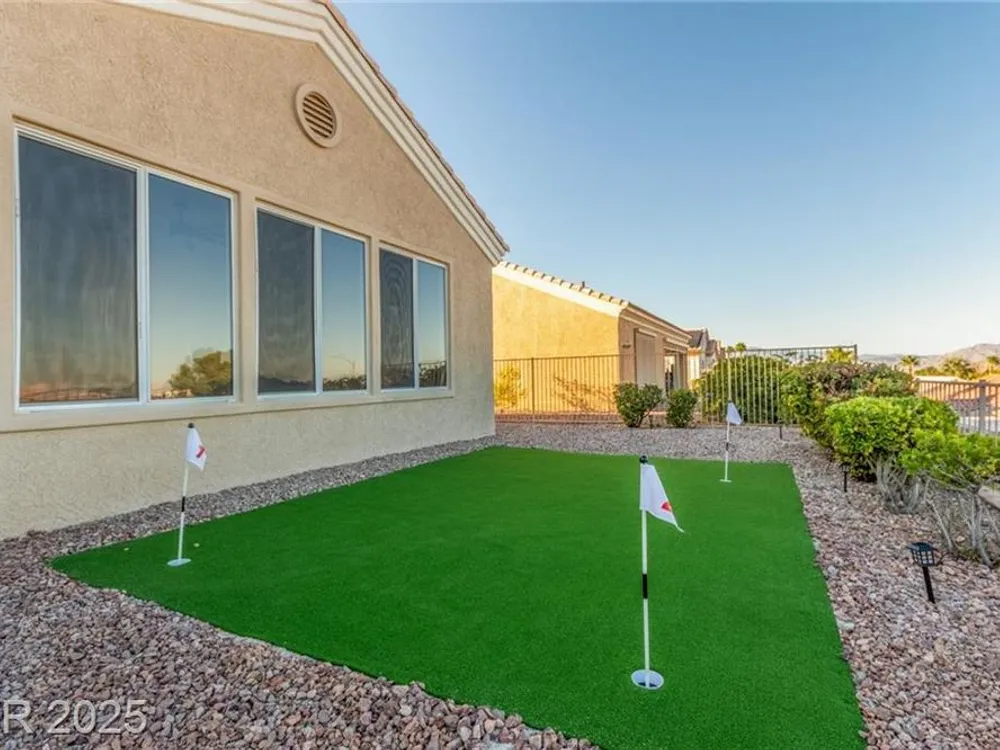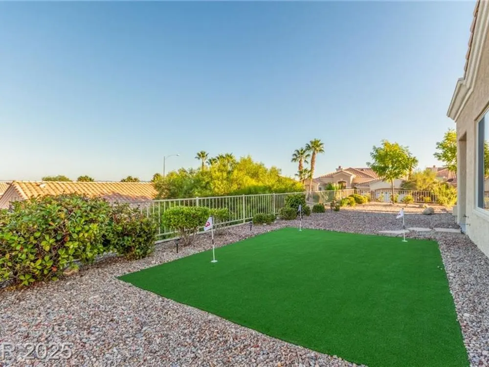 Live the Sun City Summerlin dream in this gorgeous single-story with breathtaking Strip views and glowing sunsets from the back patio. Inside, soaring ceilings, luxury vinyl floors, and modern finishes set the stage. A chef’s kitchen boasts custom cabinets, brand-new KitchenAid stainless appliances, quartz counters with a waterfall edge, tile backsplash, and a breakfast bar that's perfect for entertaining. A flex room adapts as an office, hobby space, or guest room. Retreat to the stunning, designer, spa-like primary suite to relax in the deep soaking tub and refresh in the walk-in rain shower. Outside, prepare for the next round of golf on the putting green or cozy up on the paver firepit area, then dine under covered patio,while savoring the views. The extended 2 car garage offers extra storage or room for a golf cart-visit the Eagle Crest course down the hill. Very close to one of the community centers with tons of amenities and endless social activities it's the ultimate lifestyle!