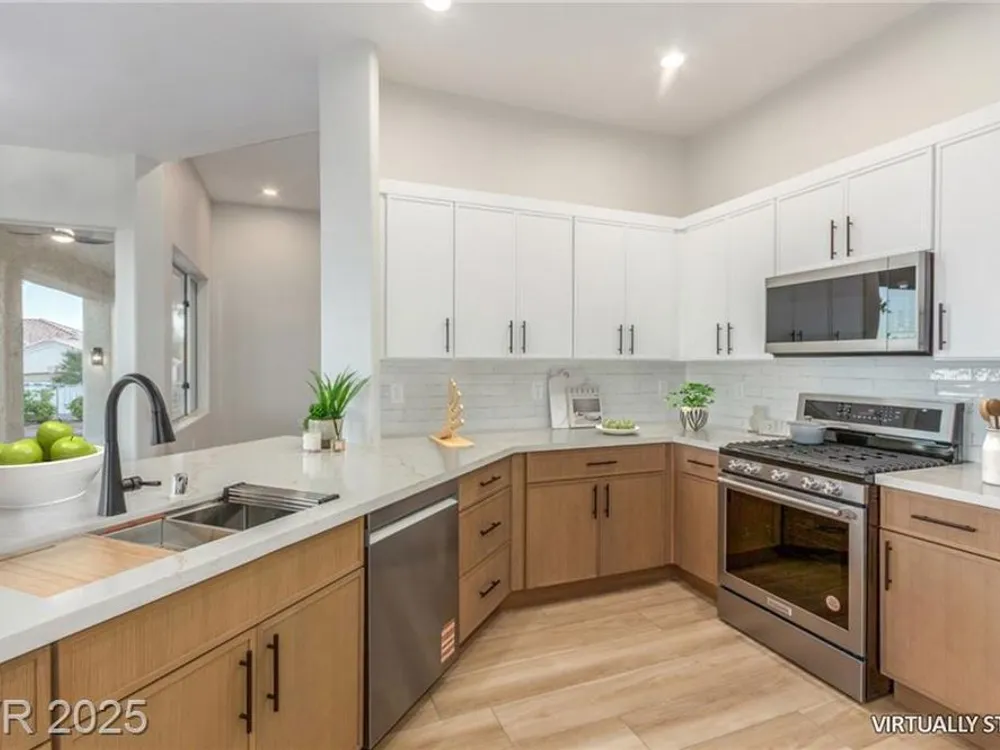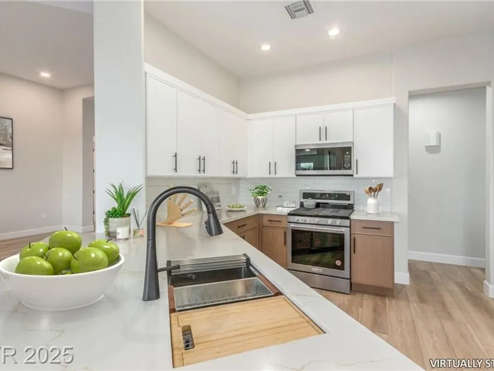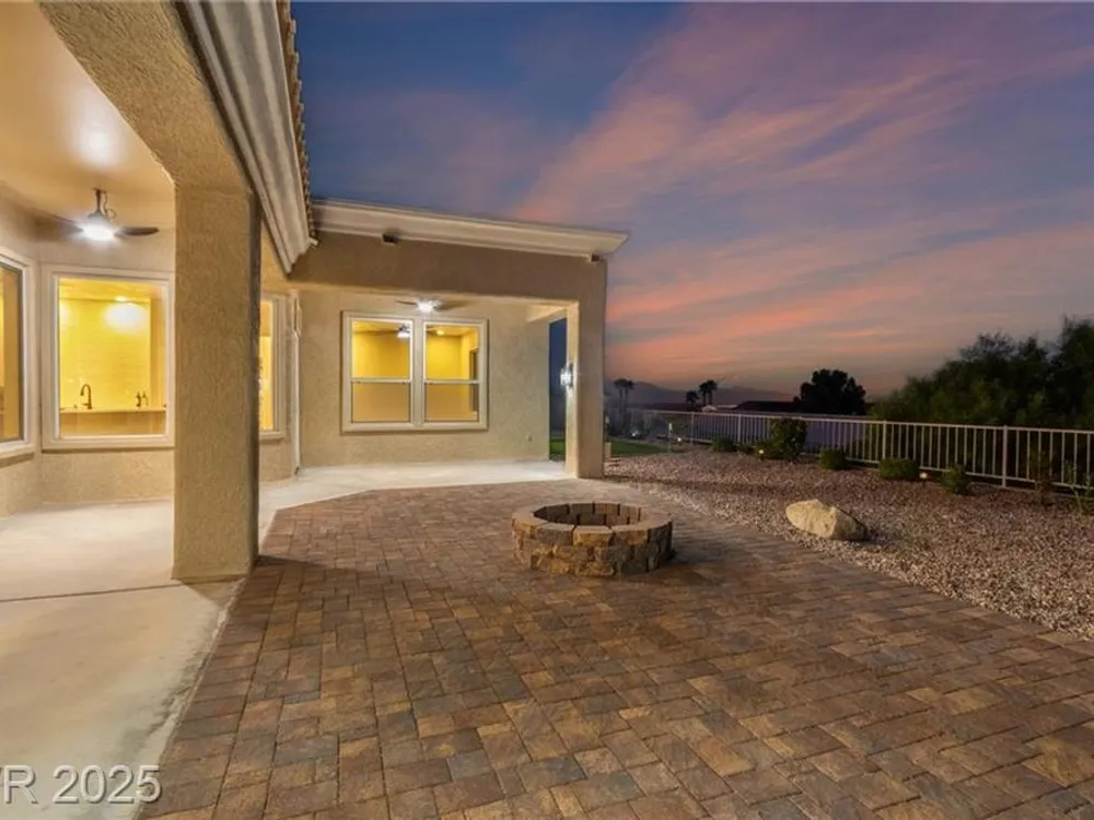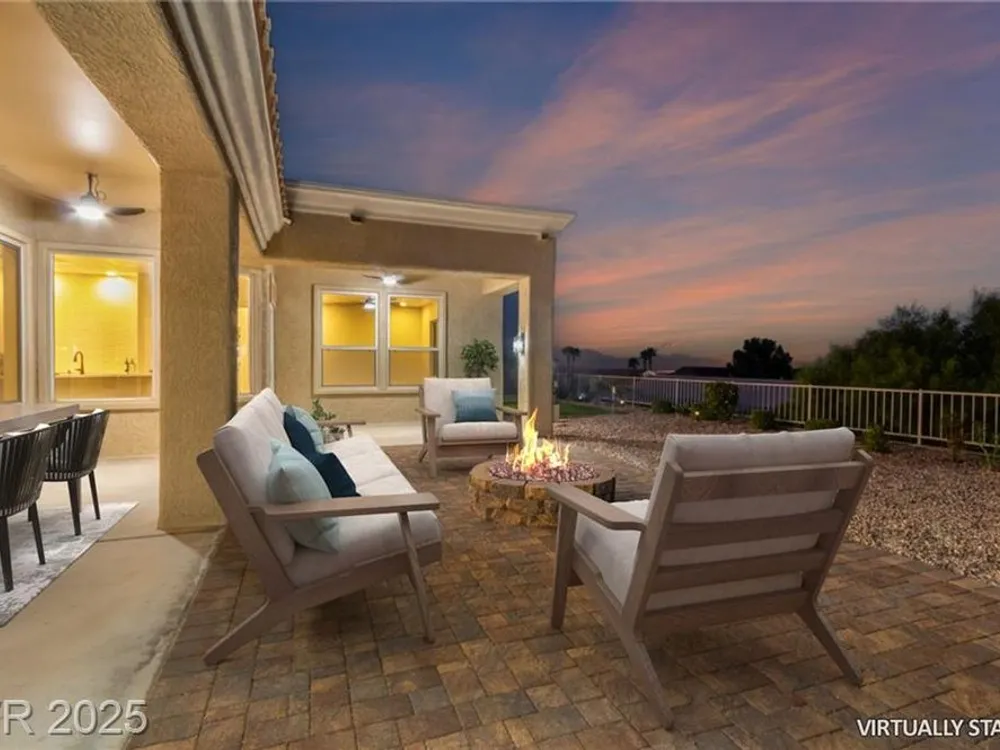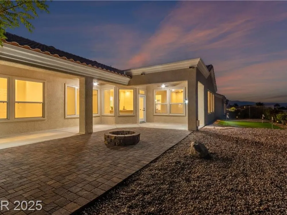 Live the Sun City Summerlin dream in this gorgeous single-story with breathtaking Strip views and glowing sunsets from the back patio. Inside, soaring ceilings, luxury vinyl floors, and modern finishes set the stage. A chef’s kitchen boasts custom cabinets, brand-new KitchenAid stainless appliances, quartz counters with a waterfall edge, tile backsplash, and a breakfast bar that's perfect for entertaining. A flex room adapts as an office, hobby space, or guest room. Retreat to the stunning, designer, spa-like primary suite to relax in the deep soaking tub and refresh in the walk-in rain shower. Outside, prepare for the next round of golf on the putting green or cozy up on the paver firepit area, then dine under covered patio,while savoring the views. The extended 2 car garage offers extra storage or room for a golf cart-visit the Eagle Crest course down the hill. Very close to one of the community centers with tons of amenities and endless social activities it's the ultimate lifestyle!