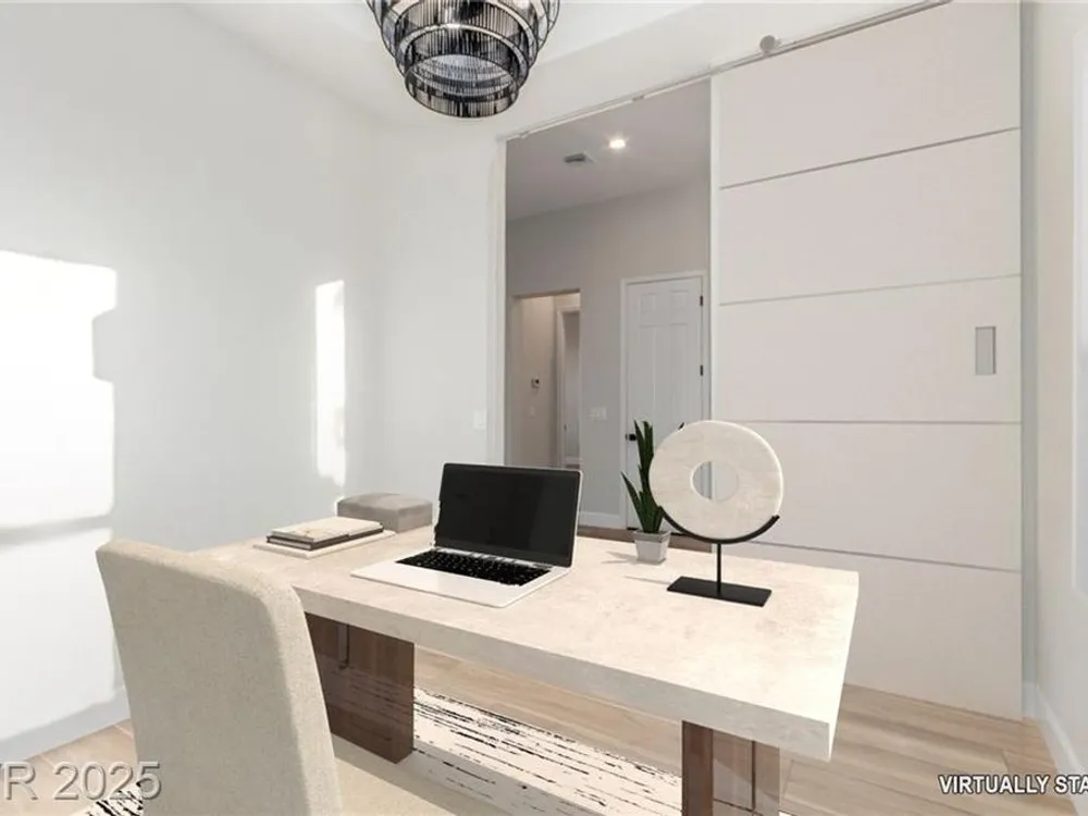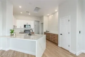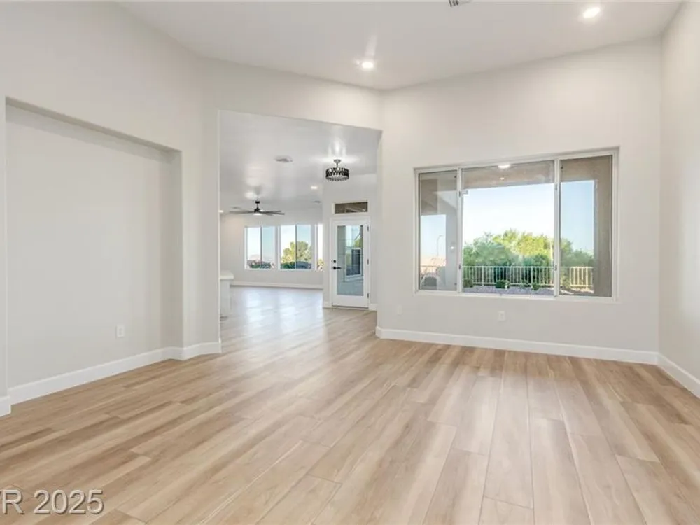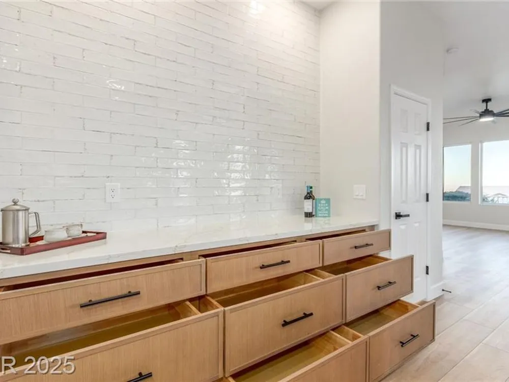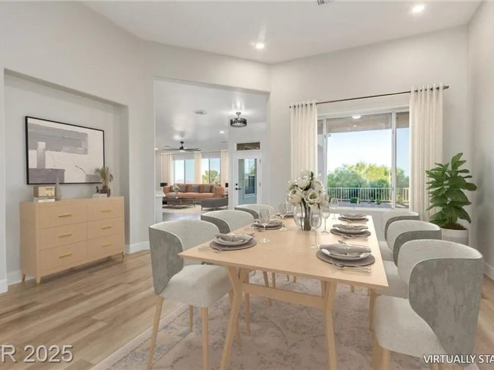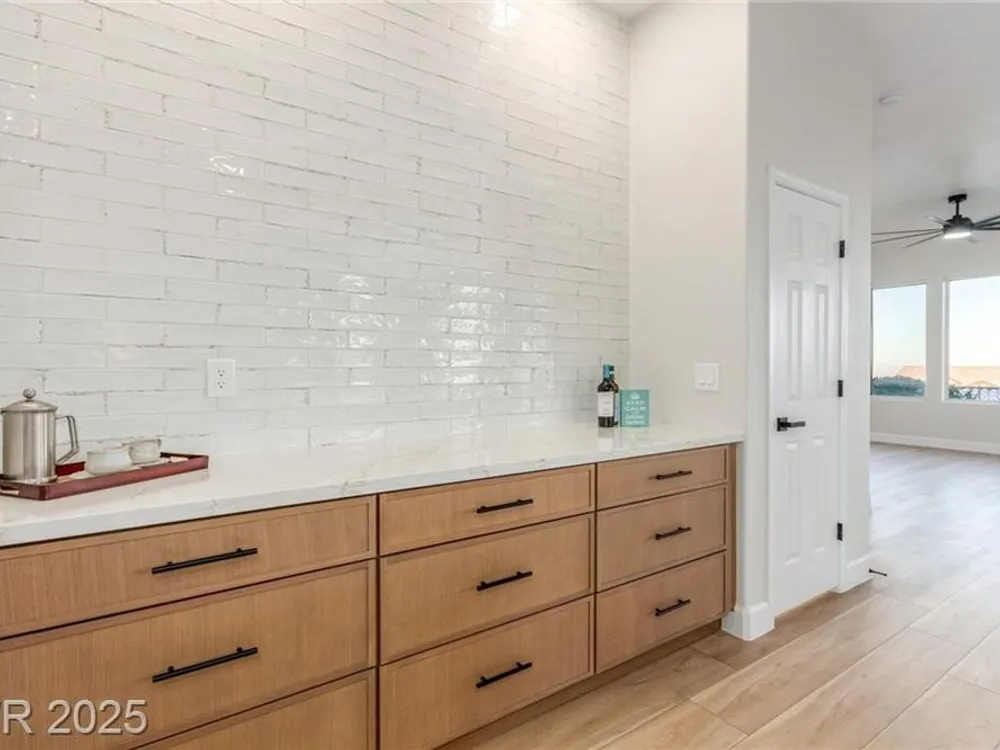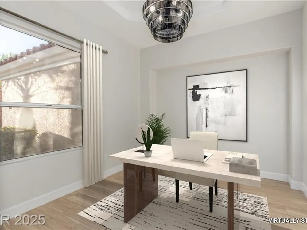 Live the Sun City Summerlin dream in this gorgeous single-story with breathtaking Strip views and glowing sunsets from the back patio. Inside, soaring ceilings, luxury vinyl floors, and modern finishes set the stage. A chef’s kitchen boasts custom cabinets, brand-new KitchenAid stainless appliances, quartz counters with a waterfall edge, tile backsplash, and a breakfast bar that's perfect for entertaining. A flex room adapts as an office, hobby space, or guest room. Retreat to the stunning, designer, spa-like primary suite to relax in the deep soaking tub and refresh in the walk-in rain shower. Outside, prepare for the next round of golf on the putting green or cozy up on the paver firepit area, then dine under covered patio,while savoring the views. The extended 2 car garage offers extra storage or room for a golf cart-visit the Eagle Crest course down the hill. Very close to one of the community centers with tons of amenities and endless social activities it's the ultimate lifestyle!