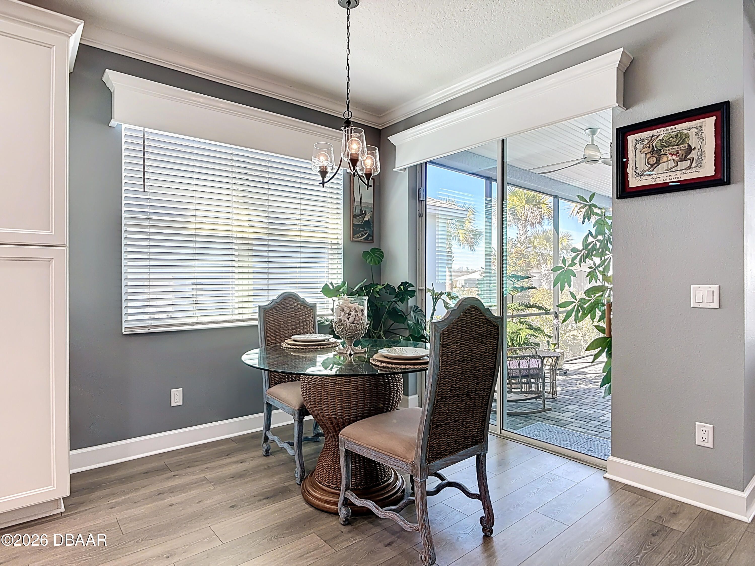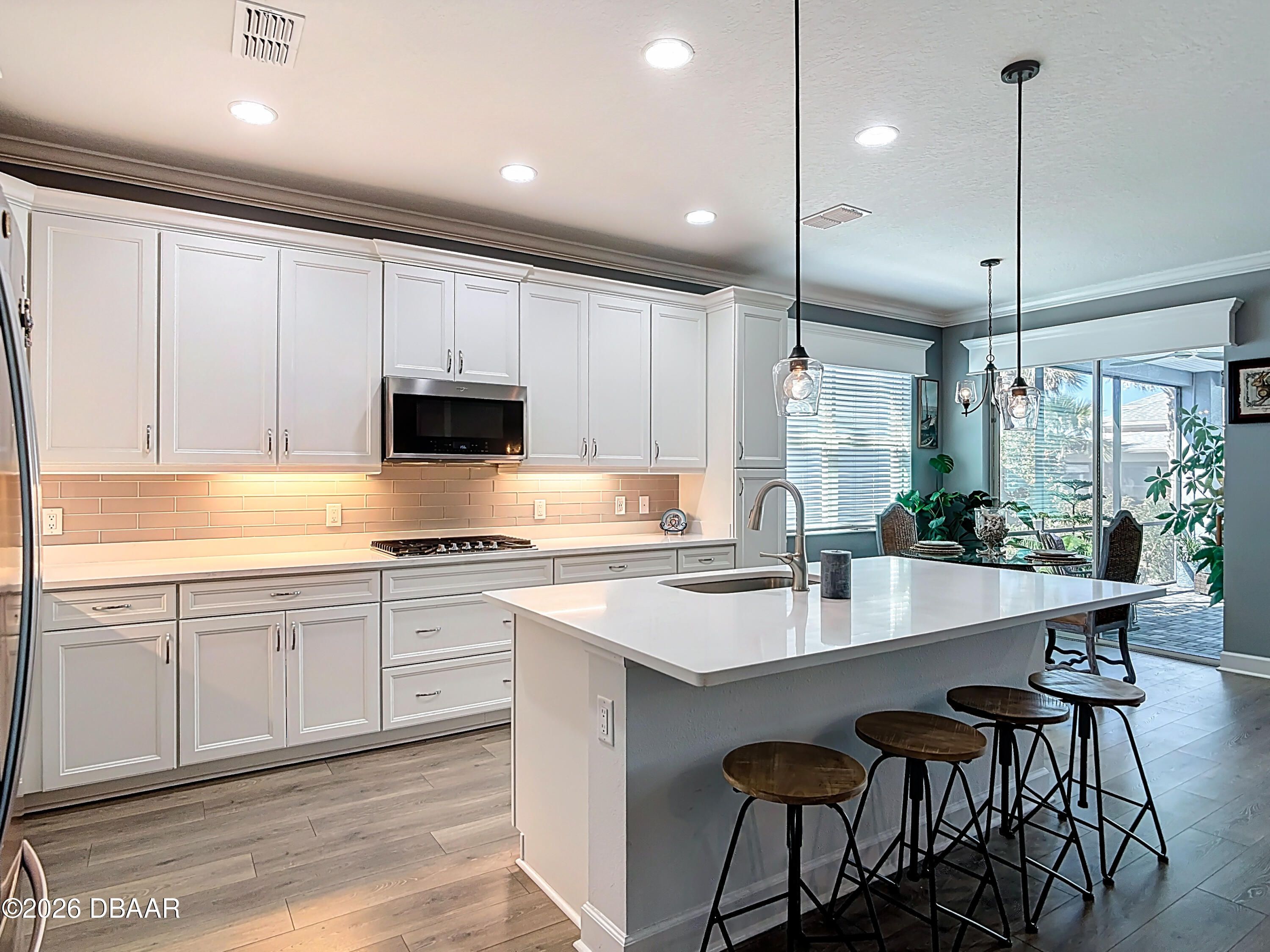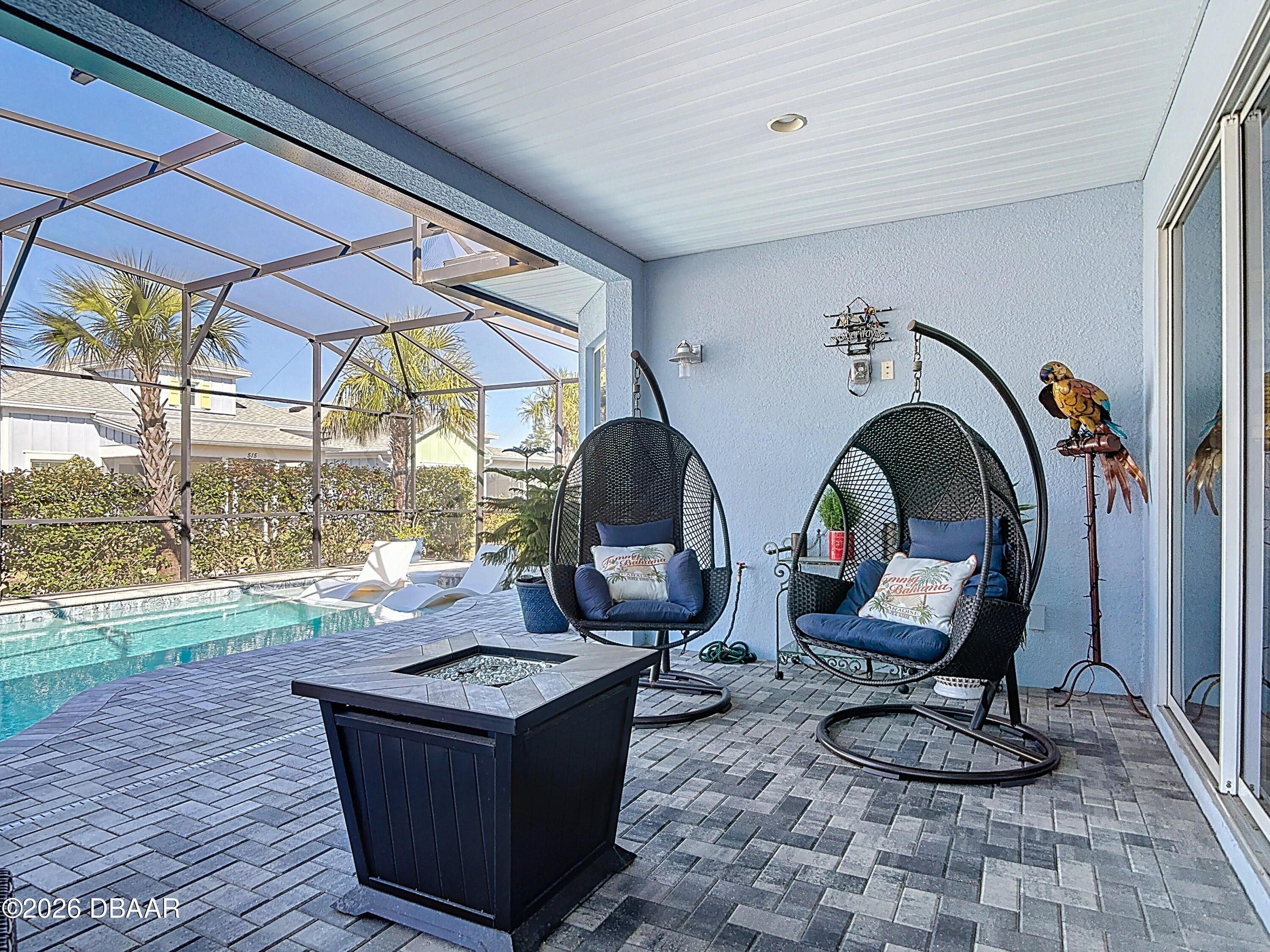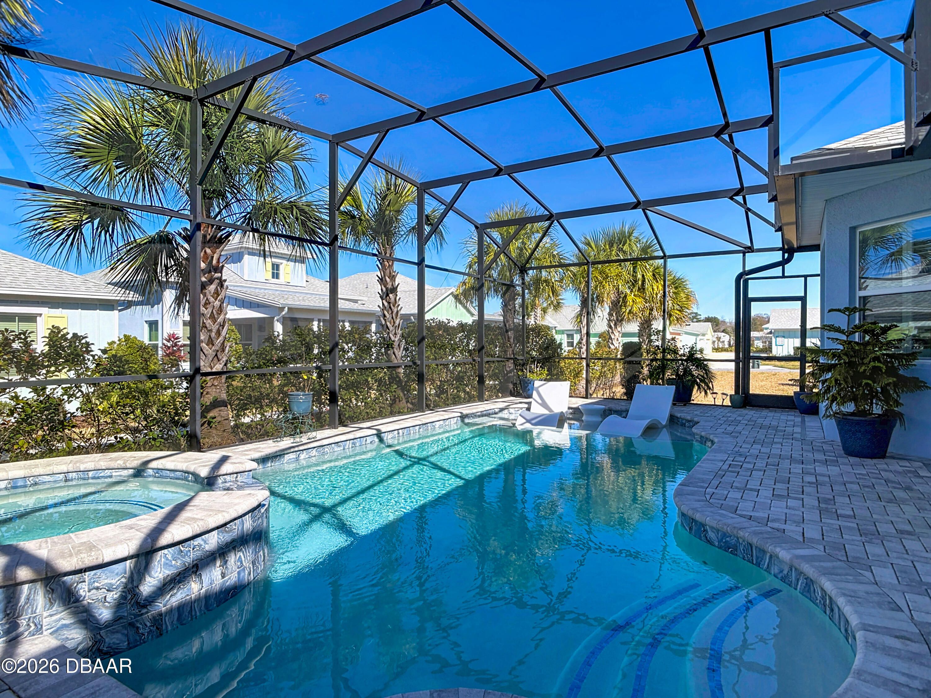Luxury Breeze Bay in Latitude Margaritaville—beautifully upgraded and truly move-in ready. Designed for relaxed elegance, this home offers a saltwater pool with integrated spa and dual heat (solar + electric), plus an extended paver lanai for effortless indoor-outdoor living. Enjoy a gentle glimpse of the pond in the distance when you step outside to unwind. Inside, you'll love the fresh coastal feel with LVP throughout, plantation shutters, crown molding, tray ceilings with recessed lighting, and majestic 8' doors. The kitchen shines with 42'' white cabinetry, gas cooking, and pots & pans drawers—perfect for entertaining. Laundry includes a utility sink; closets feature wood shelving; and the primary suite offers a linen closet in the water closet. Sealed driveway pavers add the finishing touch. Furniture negotiable. ''Where every day feels like vacation.''