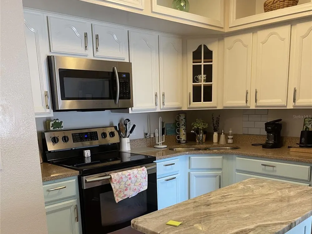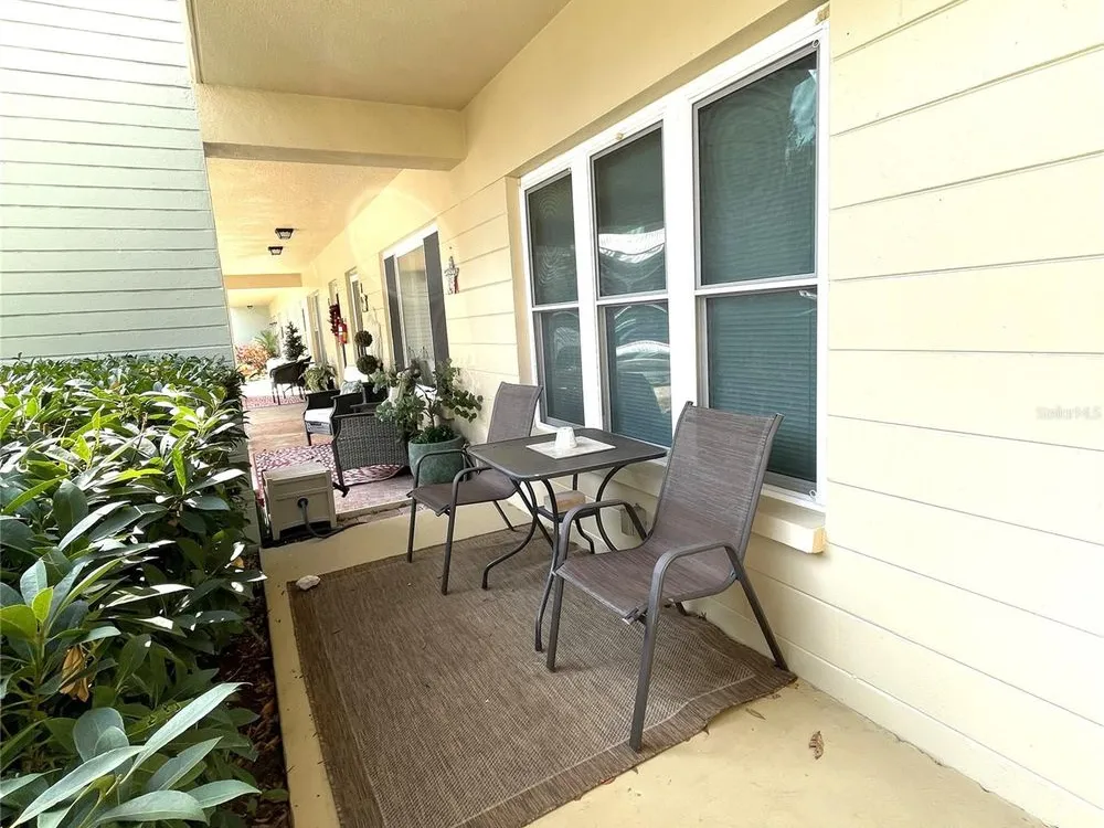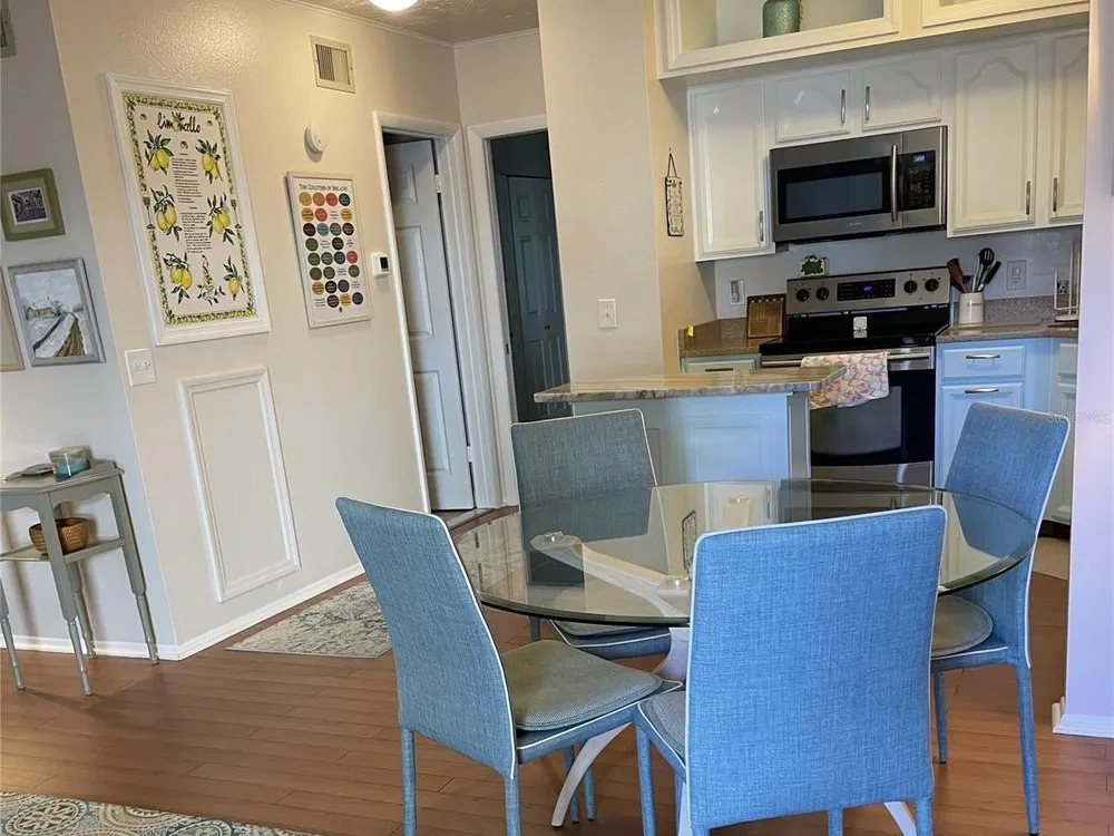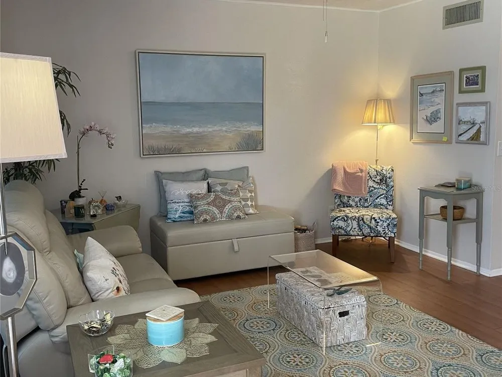 $10,000 PRICE REDUCTION!! Come and see this beautiful 1st floor unit with Beautiful laminate flooring throughout .Wait to you see the beautiful open Livingroom/dining room/kitchen. Italian marble top in the island, wood cabinets. topped off with granite countertops, impact Resistant AAA certified 50/50+ designed wind pressure window installed in 2014. HVAC and HWH replaced in 2013, Bedroom and living room have ceiling fans. Check out the unique cubby holes storage features in bathroom and also in kitchen. Rear patio overlook tree covered greenbelt area. Furniture in included . Assigned parking in front of unit . This super 55+ community has 2 activity centers also 2 golf courses 9 and 18 holes FREE for resident owners . Enjoy the 2 swimming pools, 1 heated. Gym after you swim. Enjoy hobbies at the hobby studios.. Have a dog there is a Dog Park so they can enjoy running and playing (large dogs allowed) There are indoor activities indoor on the hot day ,fitness classes, dancing, clubs and cards and even more things to keep you busy. According to Top of the World the exact CONDO FEE IS $517.58