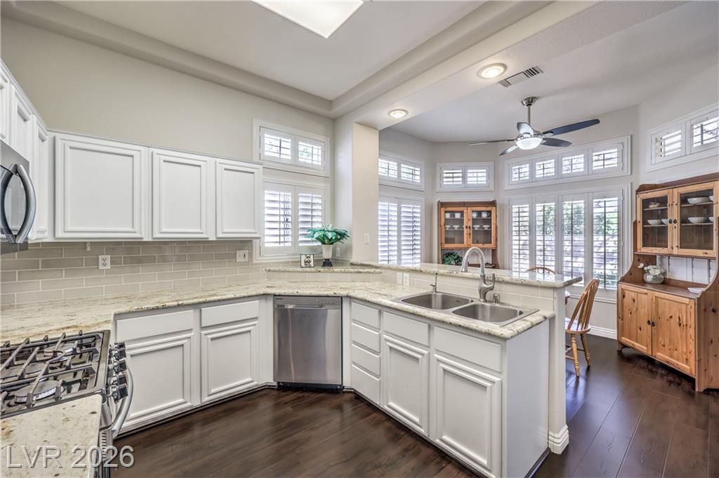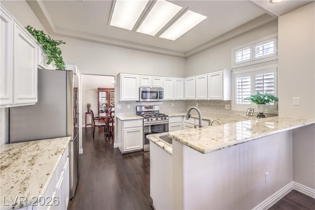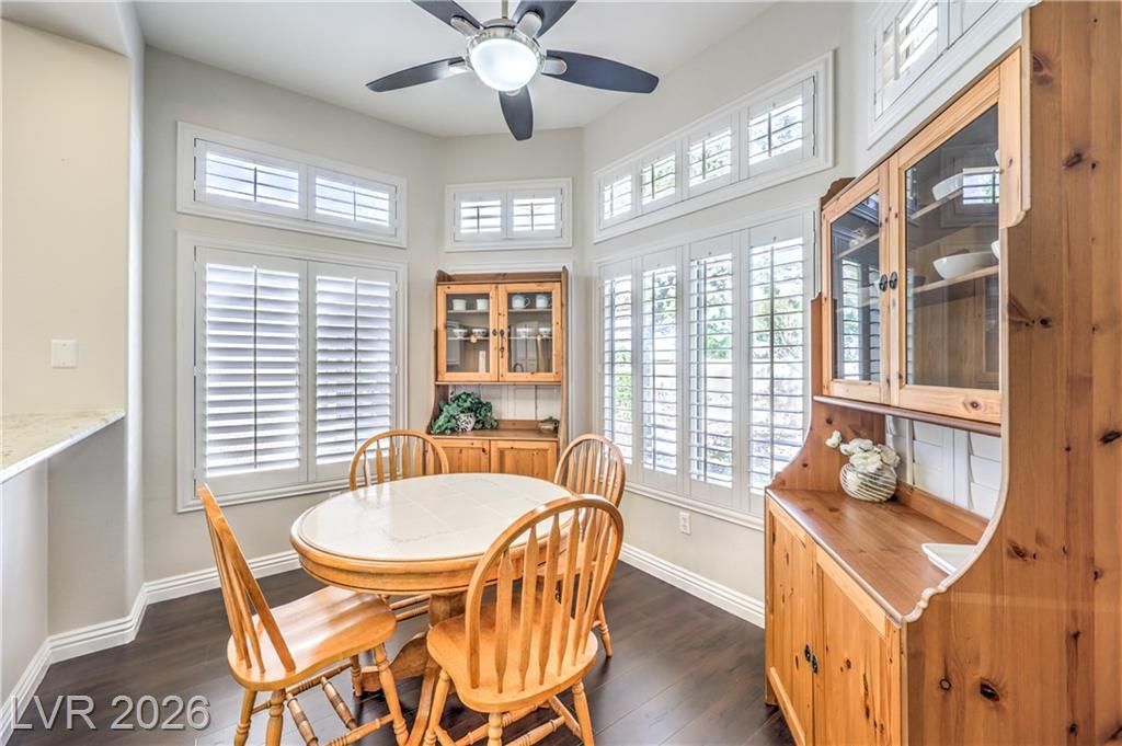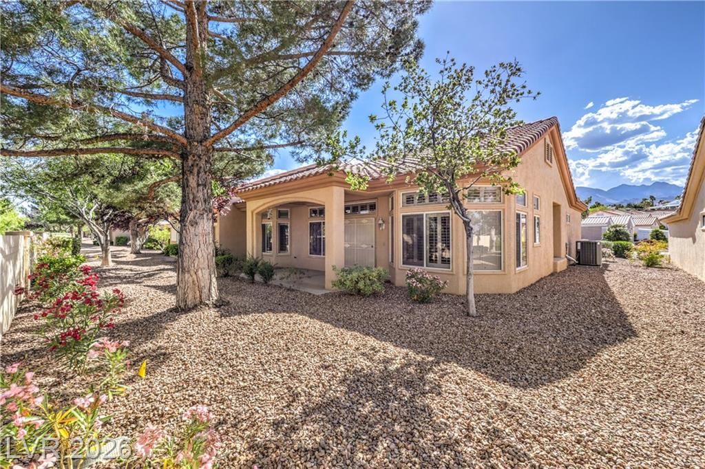 Beautifully updated townhome in Sun City Summerlin! This spacious layout features split bedrooms, an enclosed front courtyard, formal living/dining areas, and a separate family room. The remodeled kitchen offers granite counters, Samsung stainless appliances, and a cozy breakfast nook. Upgrades include luxury vinyl plank flooring, plantation shutters, ceiling fans, and solar screens. The primary suite has a large walk-in closet and dual sinks in the bathroom. The laundry room has been converted to an office with added storage. Additional highlights include an extended garage with an epoxy floor, no rear neighbors, and mountain views. New AC and heating units, plus a new water heater. All appliances included! Enjoy resort-style living with 3 golf courses, 4 clubhouses, 2 restaurants, indoor/outdoor pools, fitness centers, tennis, pickleball, racquetball, a theater, baseball park, security patrols, and a wide range of social clubs and activities.