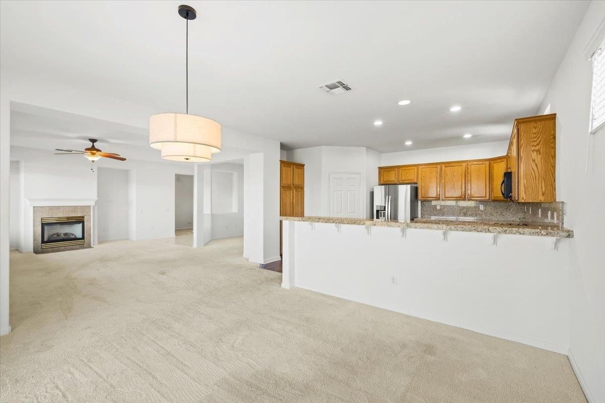 WOW!... FANTASTIC VIEW of Scenic Nature Preserve!! This Baldwin model offers 2 Bed 2 Baths Plus Additional Room for Office, Den or Hobby. All Fresh Interior Paint, Ceiling Fans & Window Blinds throughout. No Kitec. Livingroom with Fireplace. Spacious Kitchen has SS Refrigerator, Granite Counters, Gas Cook-top & 4-Door Pantry Cabinet. Formal area has bump-out. Inside Laundryroom with Cabinets, Washer & Dryer included. Appliances Convey with No Seller Warranty. Primary Bedroom has outside access and bump-out. Primary Bath with Dual Sinks, Shower & Walk-in Closet. Hallway has added cabinetry for extra storage. 2.5 Car Garage with Sink & Window. Large Backyard Covered Patio features extended area to Enjoy All the Open Space. Close to one-of-many Walking Trails. Come Experience Del Webb Lincoln Hills!