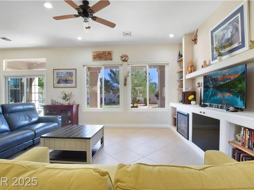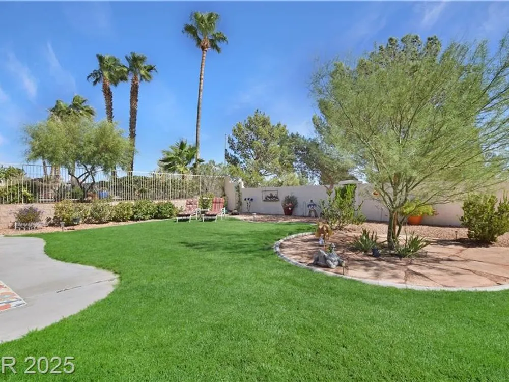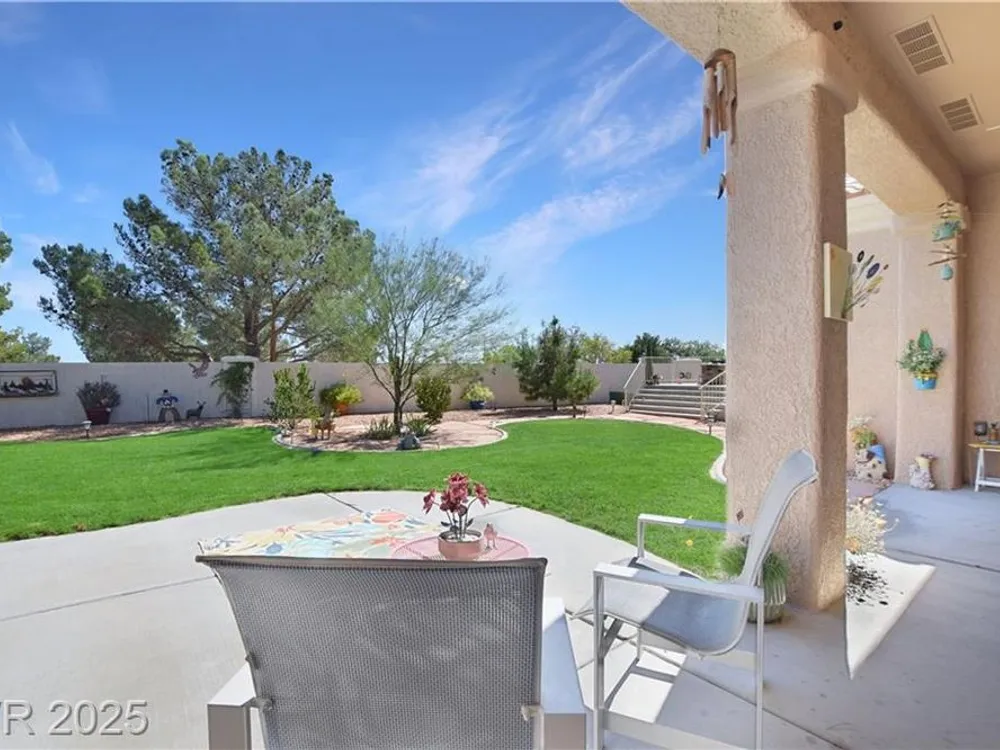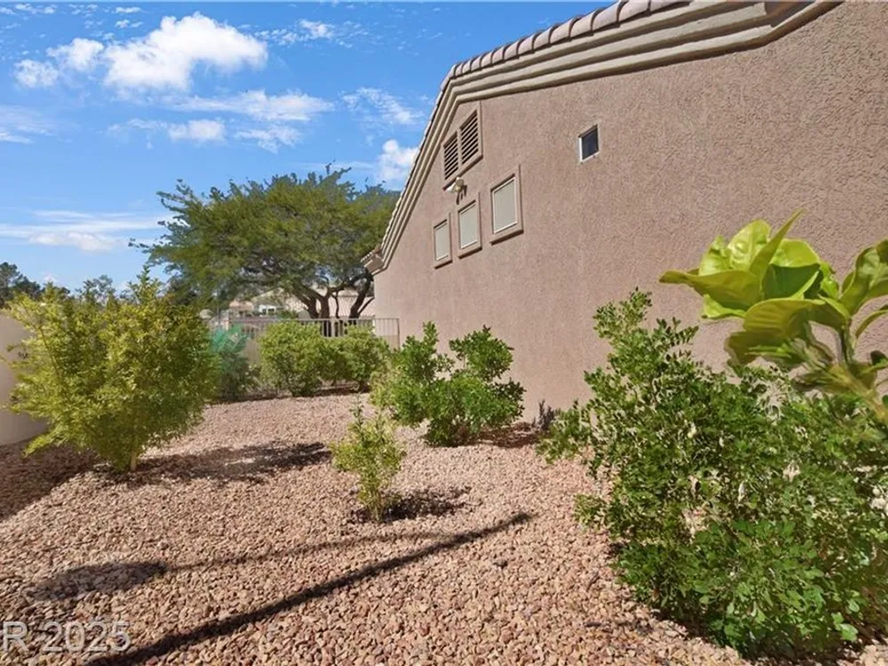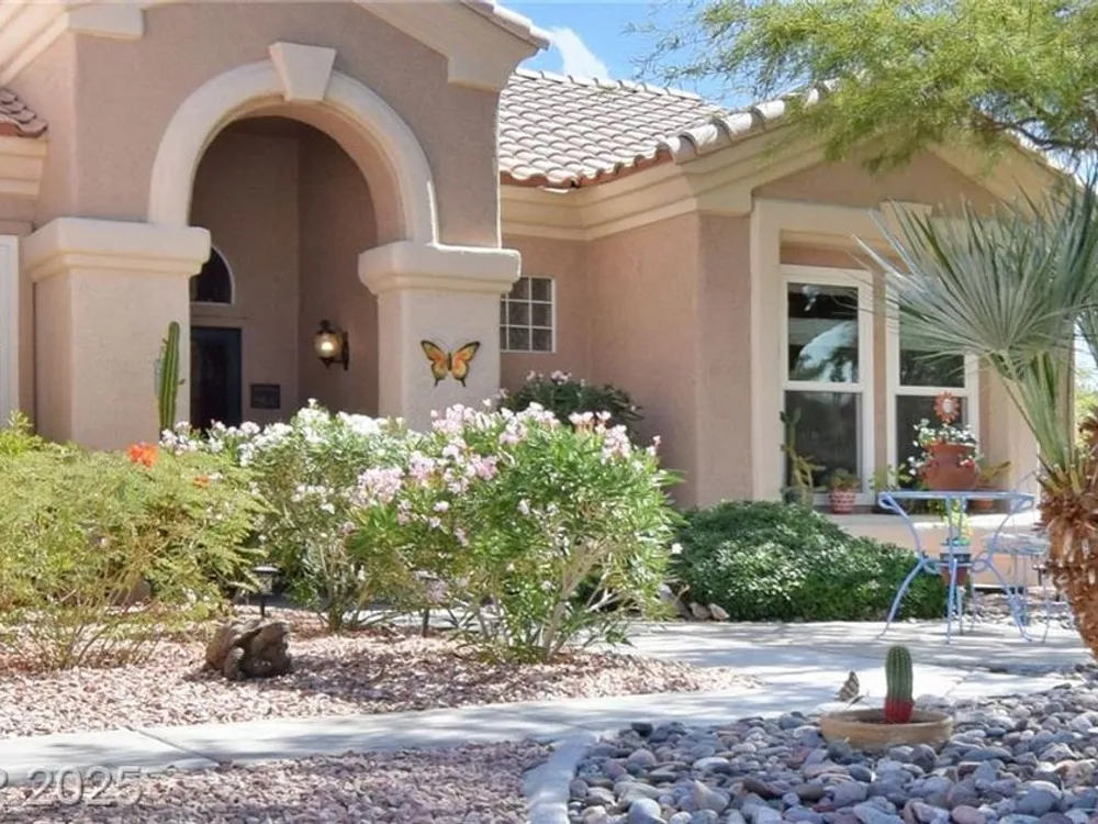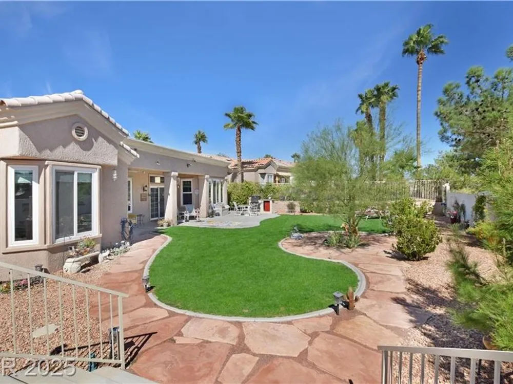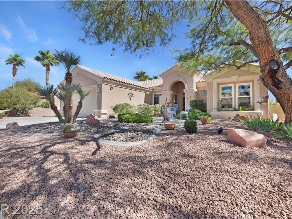 Remarkable one-story corner lot home on a 1/4 acre in highly sought-after Sun City Summerlin & across the street from the Pinnacle Community Center. The owner spared no expense with new Milgard energy-efficient windows & sliding doors, as well as new front & storm doors. The office/den also features new French doors. The house has been recently painted both inside & outside, plus new fans & light fixtures have been installed. The primary bathroom has been remodeled with a custom shower, new vanity, & light fixtures. The hallway bathroom has a new Jacuzzi 10 Jet bathtub, light fixtures, tile, & faucet. The kitchen is a chef's dream with newer appliances including a 5-burner gas cooktop, double ovens, & microwave in addition to tons of storage with pull-out shelves. The front & backyard are beautifully landscaped with refreshed, decorated rock and updated drip & sprinkler systems. There is an updated BBQ with electrical outlets, a spacious covered patio & additional raised patio.
