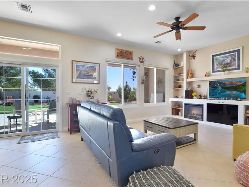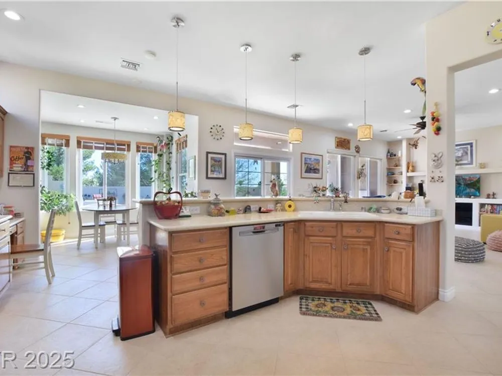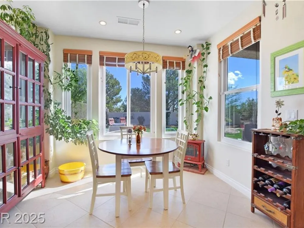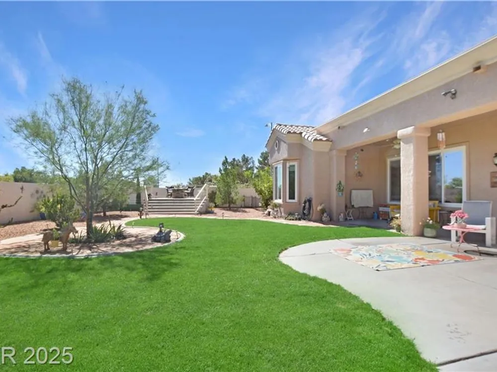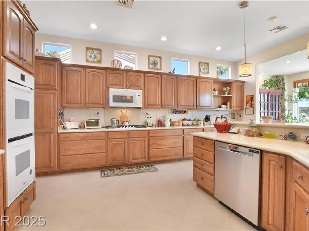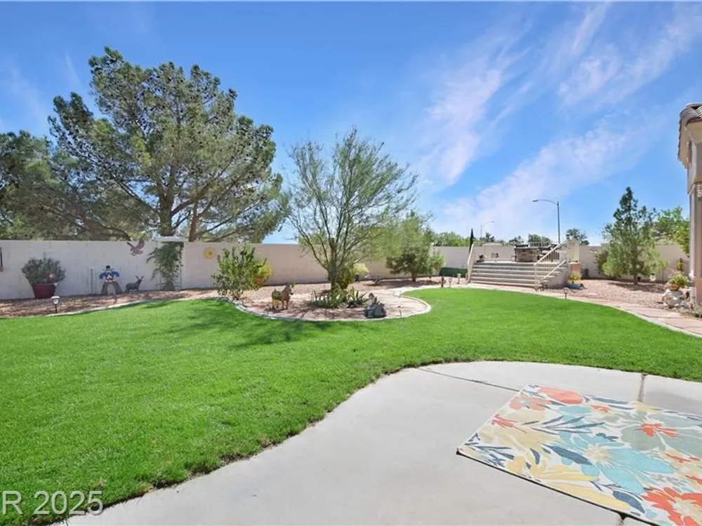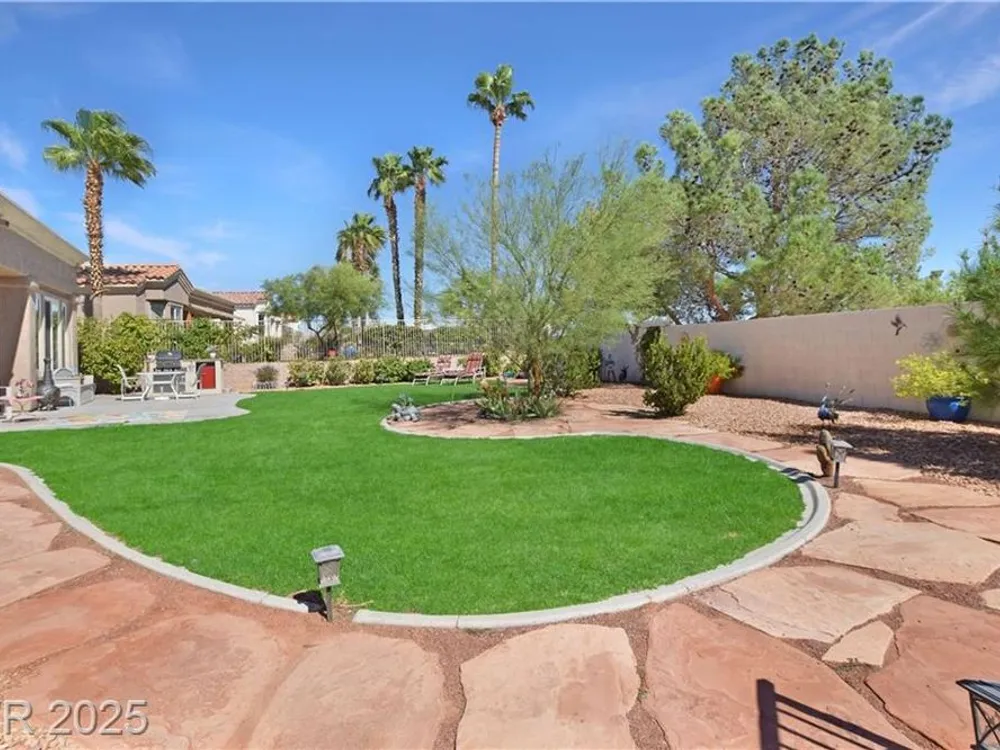 Remarkable one-story corner lot home on a 1/4 acre in highly sought-after Sun City Summerlin & across the street from the Pinnacle Community Center. The owner spared no expense with new Milgard energy-efficient windows & sliding doors, as well as new front & storm doors. The office/den also features new French doors. The house has been recently painted both inside & outside, plus new fans & light fixtures have been installed. The primary bathroom has been remodeled with a custom shower, new vanity, & light fixtures. The hallway bathroom has a new Jacuzzi 10 Jet bathtub, light fixtures, tile, & faucet. The kitchen is a chef's dream with newer appliances including a 5-burner gas cooktop, double ovens, & microwave in addition to tons of storage with pull-out shelves. The front & backyard are beautifully landscaped with refreshed, decorated rock and updated drip & sprinkler systems. There is an updated BBQ with electrical outlets, a spacious covered patio & additional raised patio.