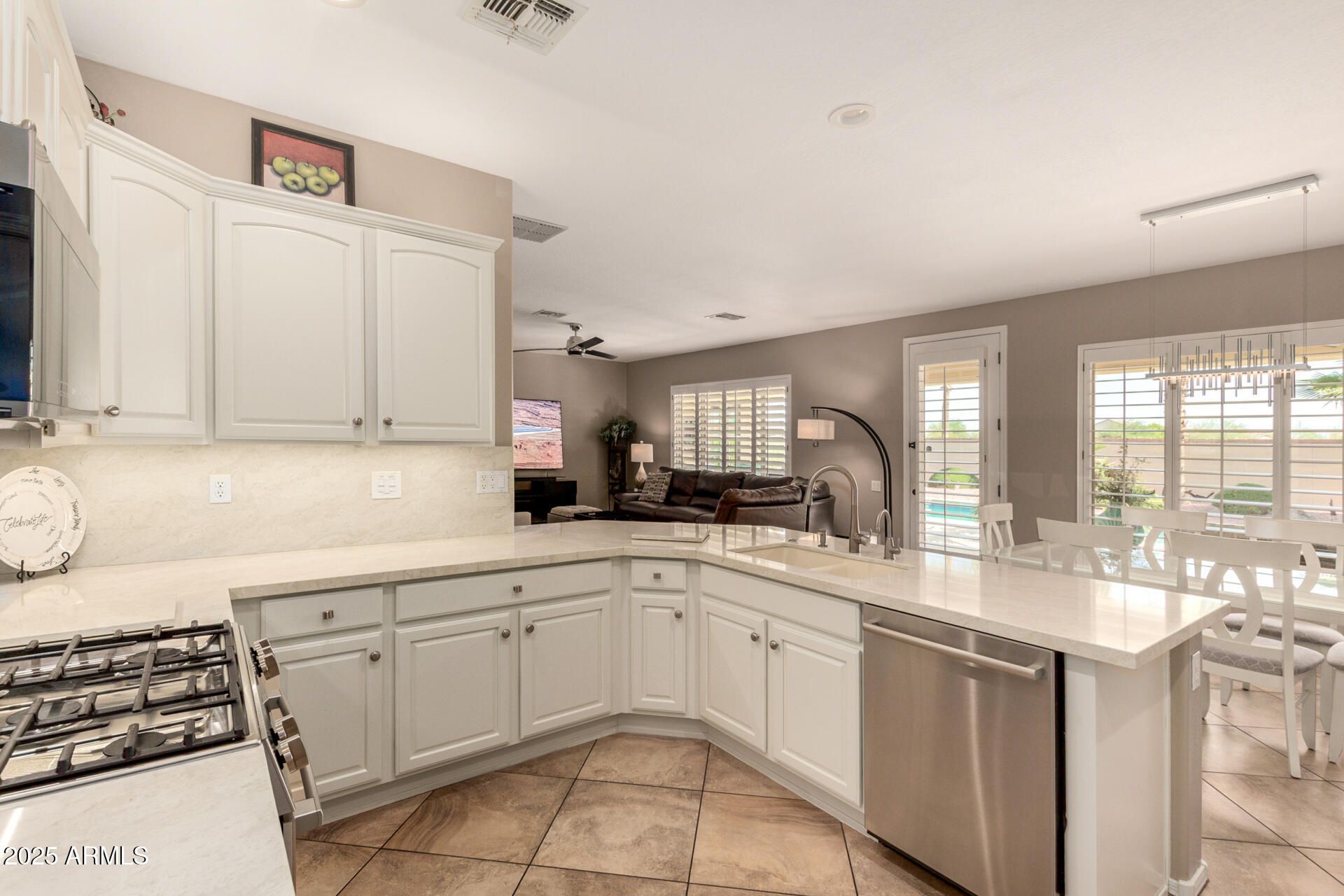Home sweet home! This charming 2-bedroom retreat greets you with a spacious 2-car garage and a welcoming paver courtyard. Step inside to a peaceful living room featuring high ceilings, a calming color scheme, classic plantation shutters, and durable tile floors. The gorgeous kitchen offers quartz counters, crisp white cabinets with crown molding, stylish backsplash, recessed lighting, stainless steel appliances, a pantry, and a peninsula with a breakfast bar for easy dining. Double French doors open to a flexible den/office with custom California closets. The primary bedroom boasts a comfy sitting nook and a private bath with dual sinks. Enjoy magical evenings in the backyard with its covered patio, travertine pavers, custom lighting and sparkling heated & chilled pool. Show Today!
