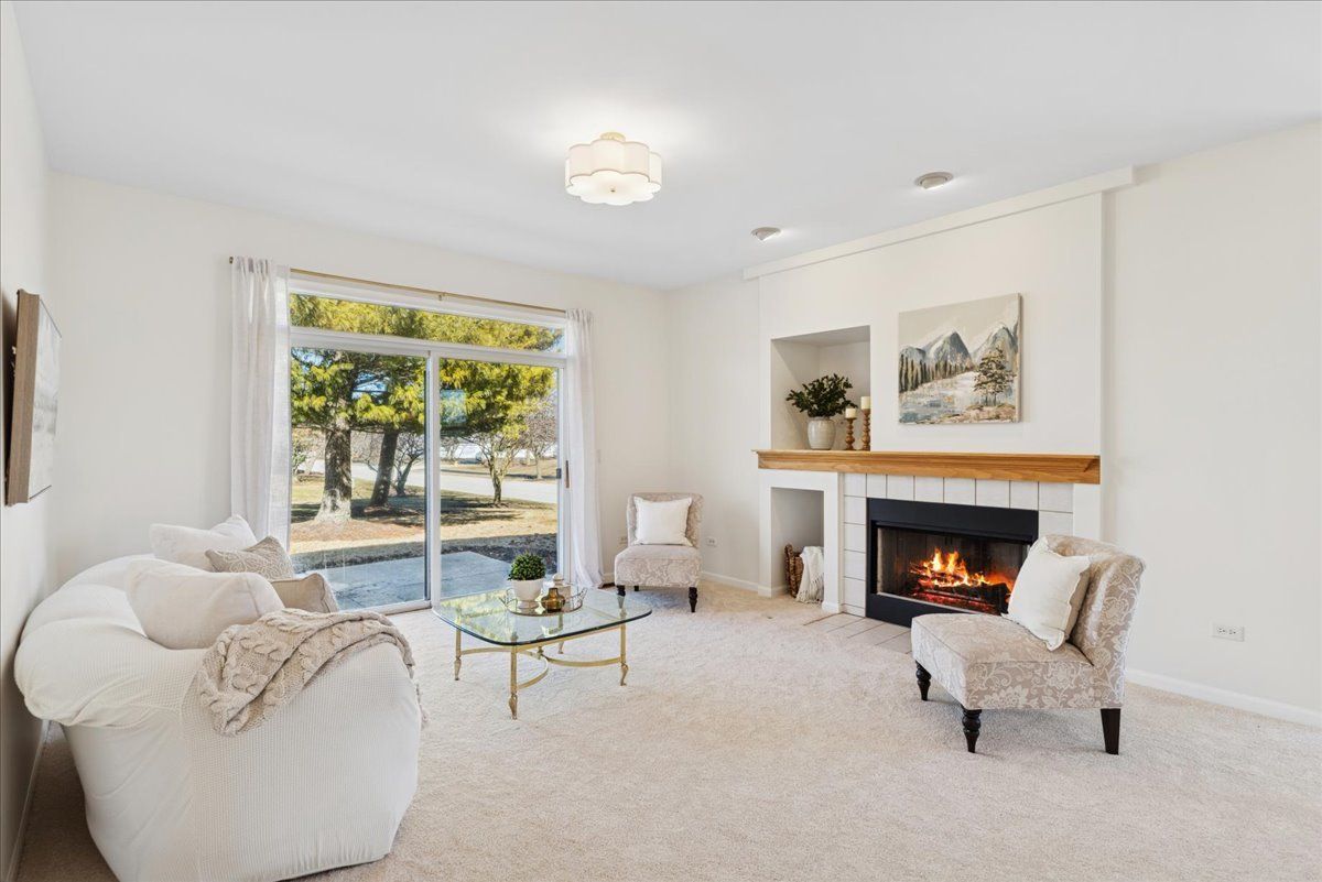 Welcome home to this beautifully updated premium end-unit ranch townhome in the highly sought-after 55 plus community of Carillon North-a place where you or your loved one can enjoy resort style living everyday. The spacious living room is bathed with natural light and features a cozy fireplace, creating a warm and inviting gathering space that is perfect for entertaining or just relaxing. It flows seamlessly into the dining area that is highlighted by a charming bay window. A sliding glass door in the living room opens to the backyard space, extending the living area outdoors and making it easy to enjoy fresh air and nature views. The bright and inviting kitchen offers ample cabinetry, generous countertop space, a pantry along with a comfortable eating area and direct access to another private patio-ideal for morning tea, casual meals, or enjoying fresh air. Down the hall, you'll find a spacious primary bedroom retreat with a private en-suite bath and a generous walk-in closet. An additional bedroom offers flexibility as a guest room, home office, or cozy reading nook. A convenient laundry closet nearby completes the space, adding everyday comfort and ease. The fully finished basement practically doubles your living area with a spacious family room, an additional bedroom, a full bath, large walk-in closet and a versatile flex room-ideal for a home gym, music room, office, or creative space-plus abundant storage, making it perfect for guests, hobbies, or relaxation. Recent updates include (2026) brand-new light fixtures, main level carpet, fresh neutral paint throughout, hot water heater (2019) creating an easy move-in transition. Living in Carillon North means enjoying an active 55+ lifestyle with exceptional amenities: a scenic golf course, tennis and pickleball courts, and a vibrant clubhouse featuring a heated indoor pool, hot tub, fitness classes, computer room, library, card groups, social clubs, and year-round events. Nearby walking paths and hiking trails add to the appeal. All of this, plus easy access to Metra, I-94, and fantastic shopping, makes this home a perfect blend of comfort, community, and convenience. Come live your best life at Carillon North!