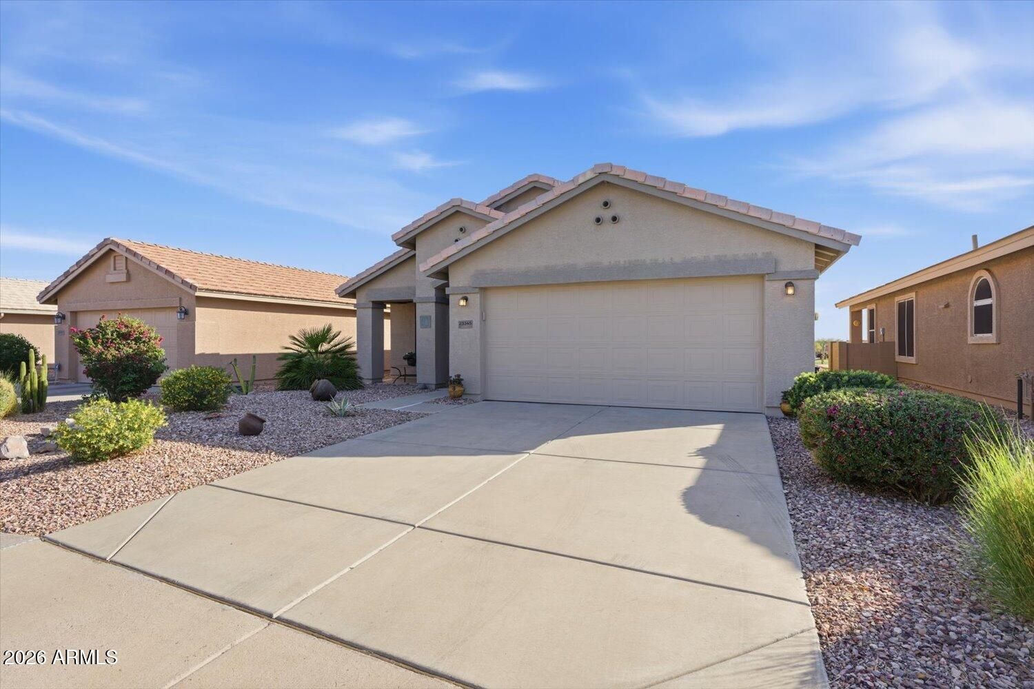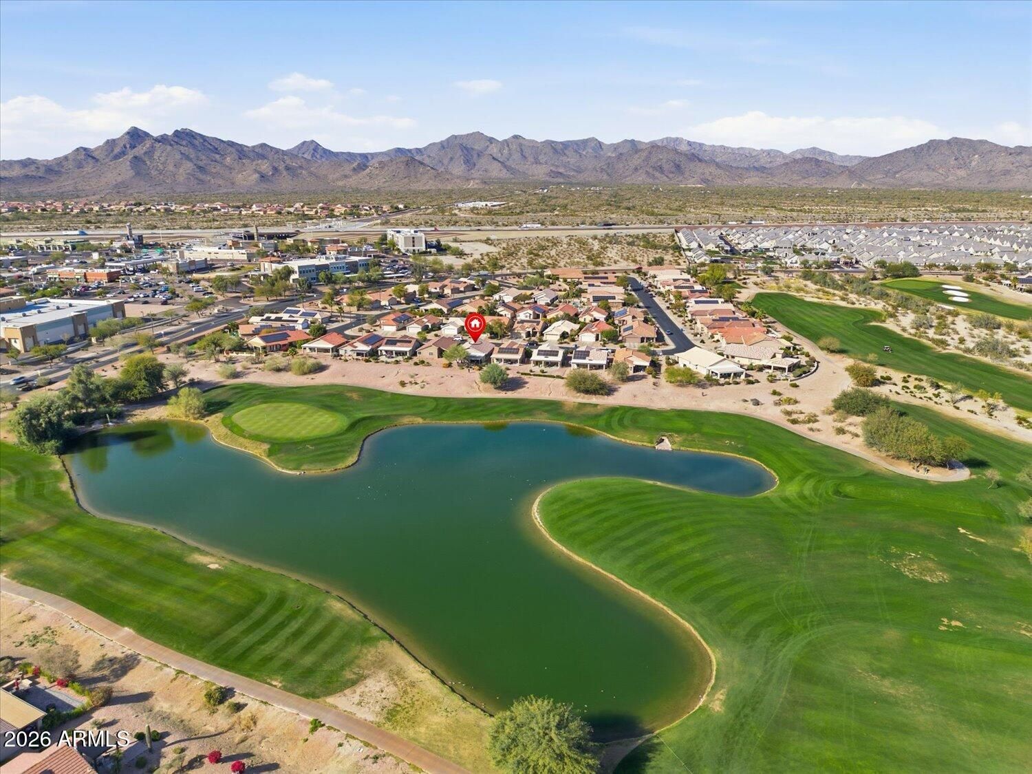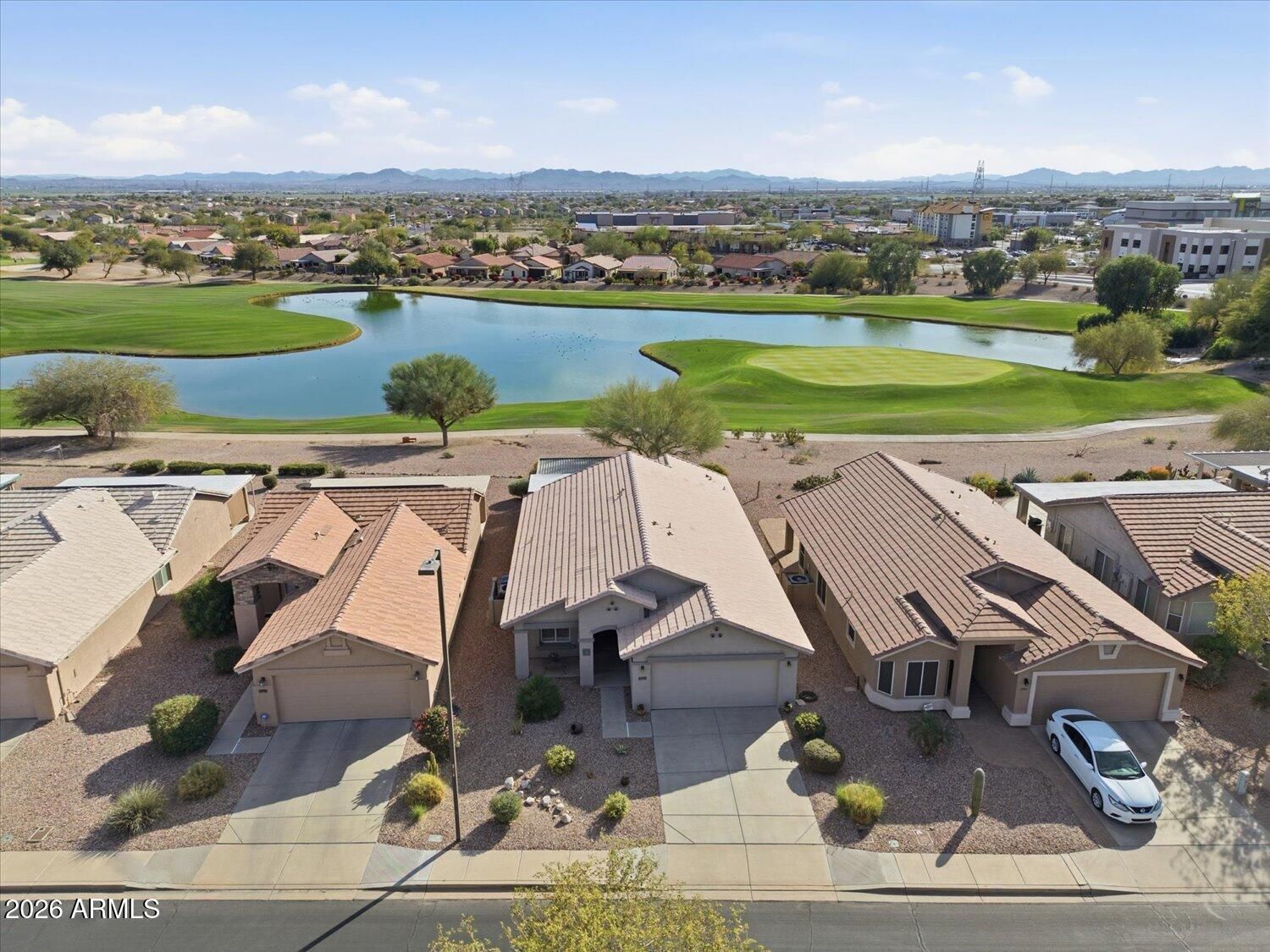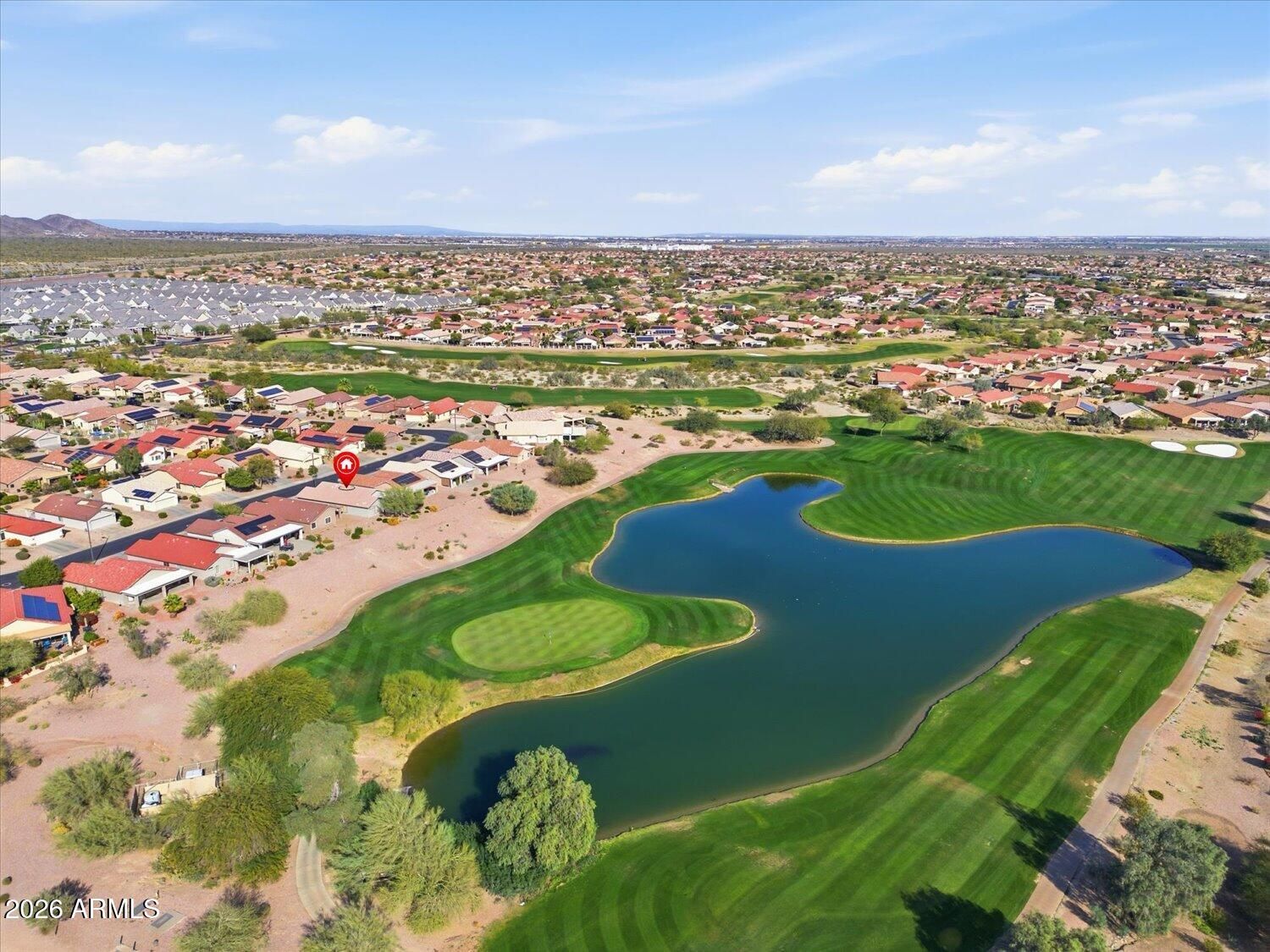 Golf course and water views set the stage for this upgraded 3 bedroom, 2 bath home offering 1,505 sq ft of inviting Arizona living. Vaulted ceilings & tile flooring throughout the main areas create an open feel. The updated kitchen features under-cabinet lighting, granite countertops, & much more. Plantation shutters add style & privacy. The spacious primary suite offers patio access & a beautifully updated bath w/ granite counters & a floor-to-ceiling tiled shower with built-in niches. Walk-in closet in the guest bedroom & a true 3rd bedroom currently used as an Office. Enjoy the extended pergola for sunrises/sunsets and water/Golf views. HVAC 2022, Bath remodel 2021, Exterior painted 2023, insulated garage door, irrigation upgrades, and much more. Ask for upgrade list. TURN KEY home.