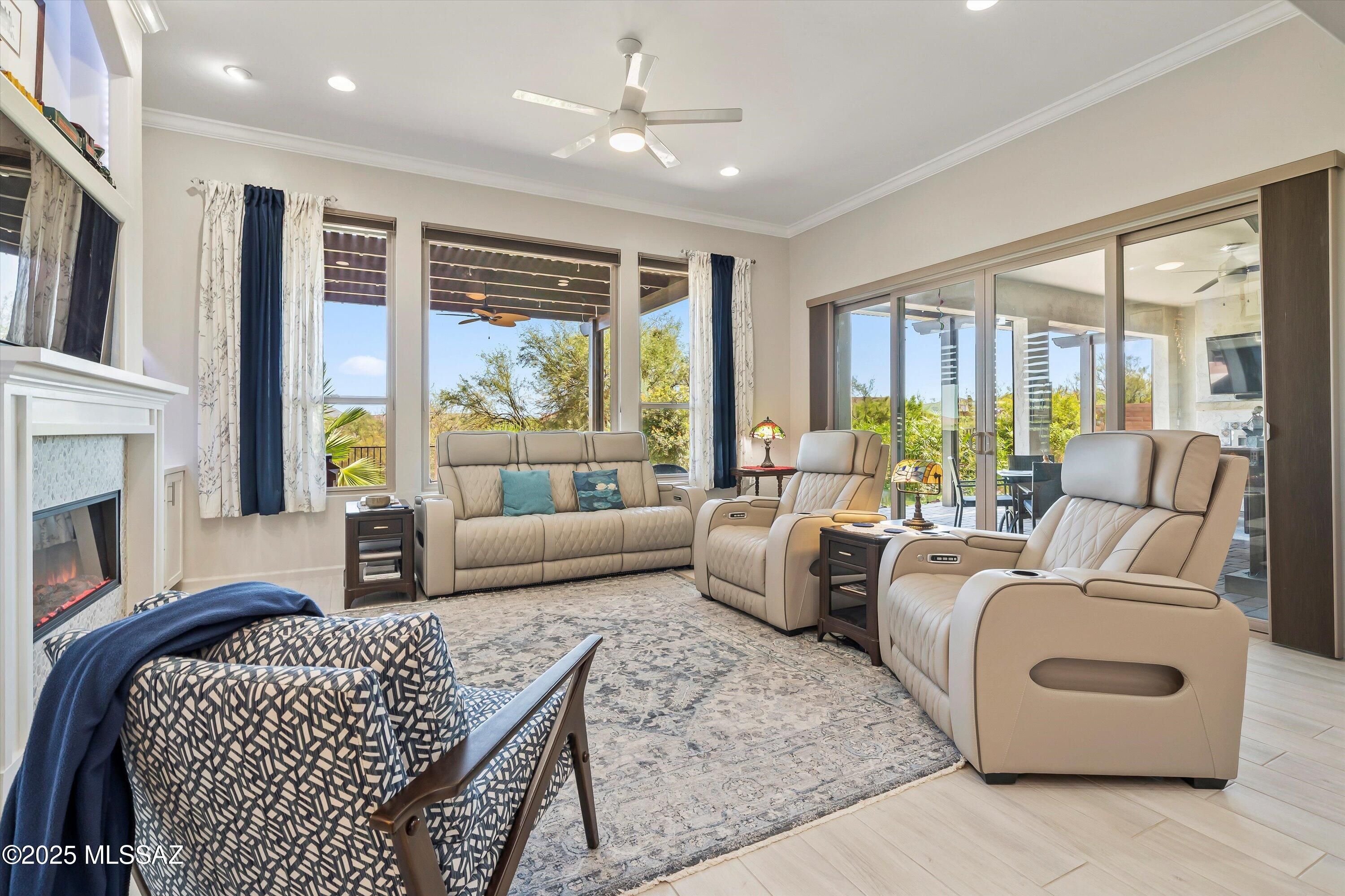 Skip the new build add on upgrades. Spectacular Quail Creek home with ALL of the ''I WANTS'' - both inside & outside. You'll find fine details beyond the standard new builds - starting with bricked driveway & courtyard entry. Fresh two-tone interior paint with crown molding accents. Custom kitchen with gas 5 burner cooktop, pull-outs, under cabinet lighting, wet bar at dining area. Great Room with custom shelving and built in storage. Laundry room with abundant cabinets... Deep garage with 8' doors, epoxy floor, tub to clean golf clubs & 220 plug for EV. Outside is a ZEN PARADISE backing to natural spaces and the golf course, unexpected privacy created by fireplace accent wall & electric solar screens. Custom water feature with waterfall established plantings. Citrus trees. Owned Solar.