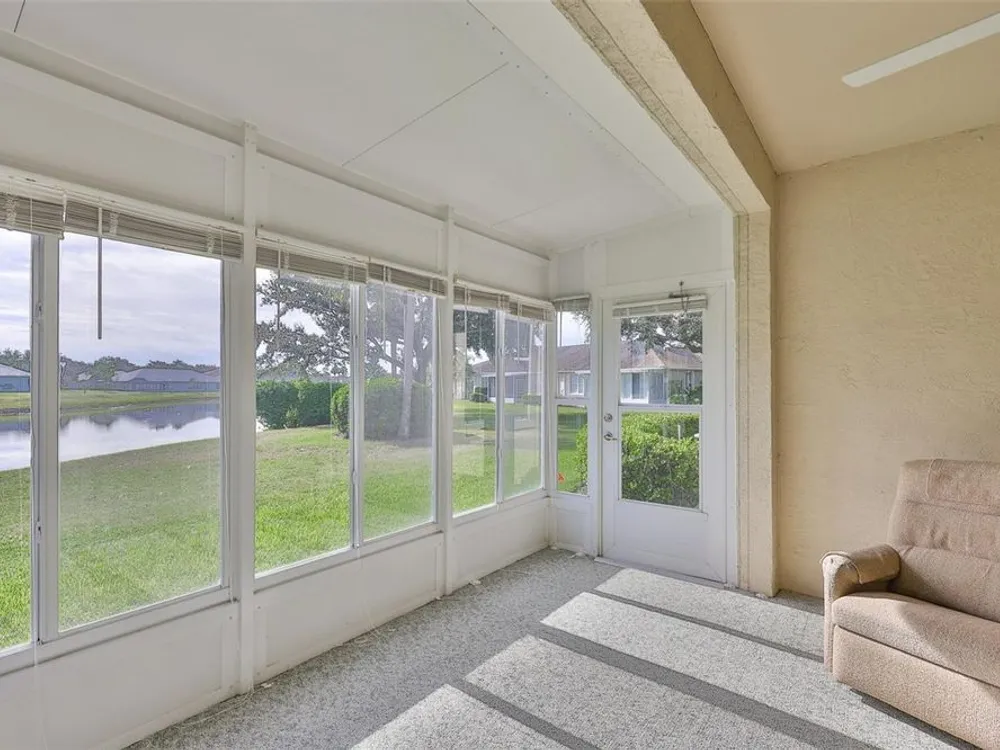 This charming 2-bedroom, 2-bathroom villa offers a serene and comfortable living experience, with stunning pond views that create a peaceful backdrop to your daily life. The home features an updated AC unit (2022) ensuring year-round comfort, while the expanded, glass-enclosed lanai provides an inviting space to enjoy the outdoors in a climate-controlled environment. The front entrance is highlighted by an elegant leaded glass door, adding a touch of sophistication to the home's welcoming appeal. Perfectly situated in a tranquil setting, this villa blends modern convenience with natural beauty. Furnished, but can remove furniture if Buyer does not want. Golf cart also conveys. Fees include roof repair/replacement, exterior painting, cable, internet, exterior insurance, maintenance grounds, pest control, private road, security, water, trash, sewer & more! This is an ACTIVE 55+ community with multiple indoor/outdoor HEATED pools, fitness, pickle ball, an onsite SALON, restaurants and so much more! Located just south of Tampa, Kings Point is a resort-style active retirement community. Gated, with two beautiful clubhouses, 6 heated pools, an 850-seat theater, an elegant spa, tennis courts, golf course, 2 hot tubs, billiards, several pickleball courts, two state-of-the-art fitness centers, and much, much more. Dozens of social and sports clubs will keep you entertained year-round. This maintenance-free community allows access to doctors, hospitals, shopping, banking, restaurants, and virtually everything you will ever need via a golf cart. Kings Point even offers a free transportation system. Centrally located minutes from an assortment of spectacular beaches, world class fishing, Tampa's convenient cruise port, and Disney World, Kings Point is an award-winning community and one of Florida's best places to live!