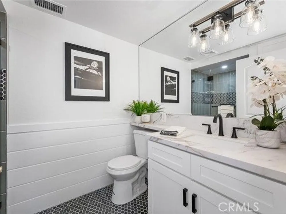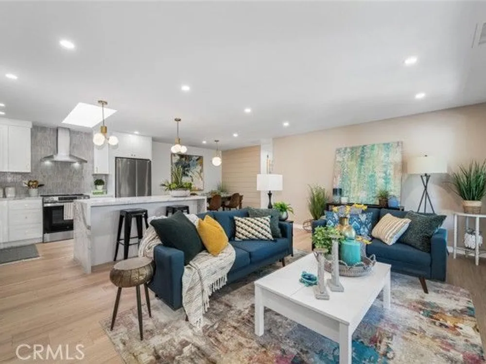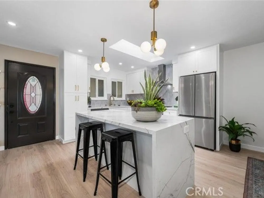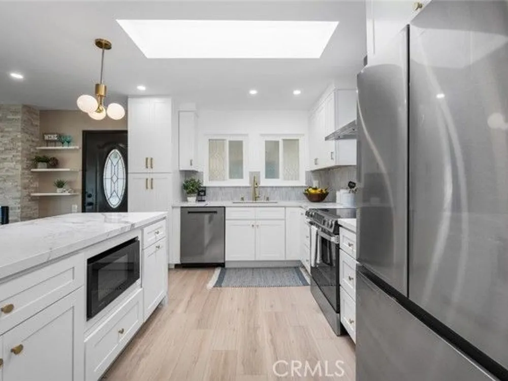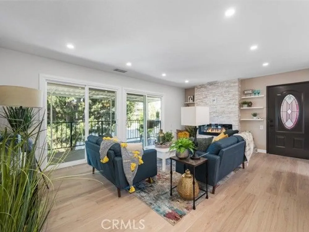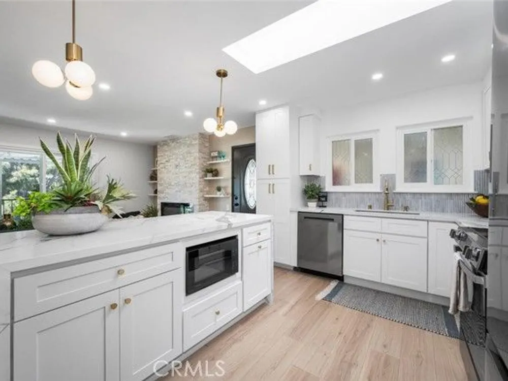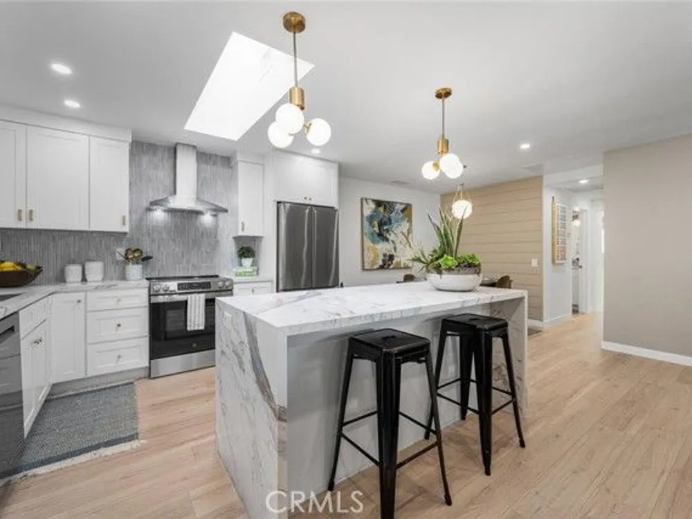 Welcome to this beautifully reimagined top-floor Casa Contenta model home, located in the desirable Third Mutual of Laguna Woods! Step inside to discover a stunning open-concept living space featuring recessed lighting and a custom floor-to-ceiling stone electric fireplace that serves as a striking focal point. Expansive dual-pane sliding doors bring the outdoors in, creating a serene, treehouse-like ambiance with an exceptional sense of privacy—no neighbors in sight. Natural light floods the home through a dramatic skylight that spans the width of the kitchen. The kitchen itself is a true showstopper, thoughtfully updated with sleek quartz countertops, stainless steel appliances, Shaker-style cabinetry, pendant lighting, and an oversized island with a breakfast bar—perfect for entertaining. Adjacent to the kitchen is a dedicated dining area accented by stylish custom lighting fixtures, ideal for hosting dinner parties or casual meals. Down the hallway, you'll find a beautifully updated guest bathroom featuring a new vanity, a fully tiled roll-in shower, and a glass enclosure. The unique floor plan includes a private primary suite, complete with a luminous white bathroom boasting quartz counters, a tiled floor, and a low-threshold glass-enclosed shower. Additional highlights include high-quality laminate flooring throughout, central air conditioning, and an in-unit washer and dryer for your convenience.This home is ideally situated within Laguna Woods, allowing residents to take full advantage of its amenities. Laguna Woods Village residents are privileged to enjoy a 27-hole championship golf course, a 9-hole executive par 3 course, pickleball and tennis courts, lawn bowling, gyms, clubhouses, swimming pools, horse stables, gardening centers, an art studio, a world-class wood shop, computer workrooms and classes + over 200 clubs and organizations!
