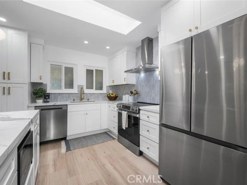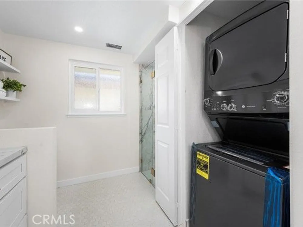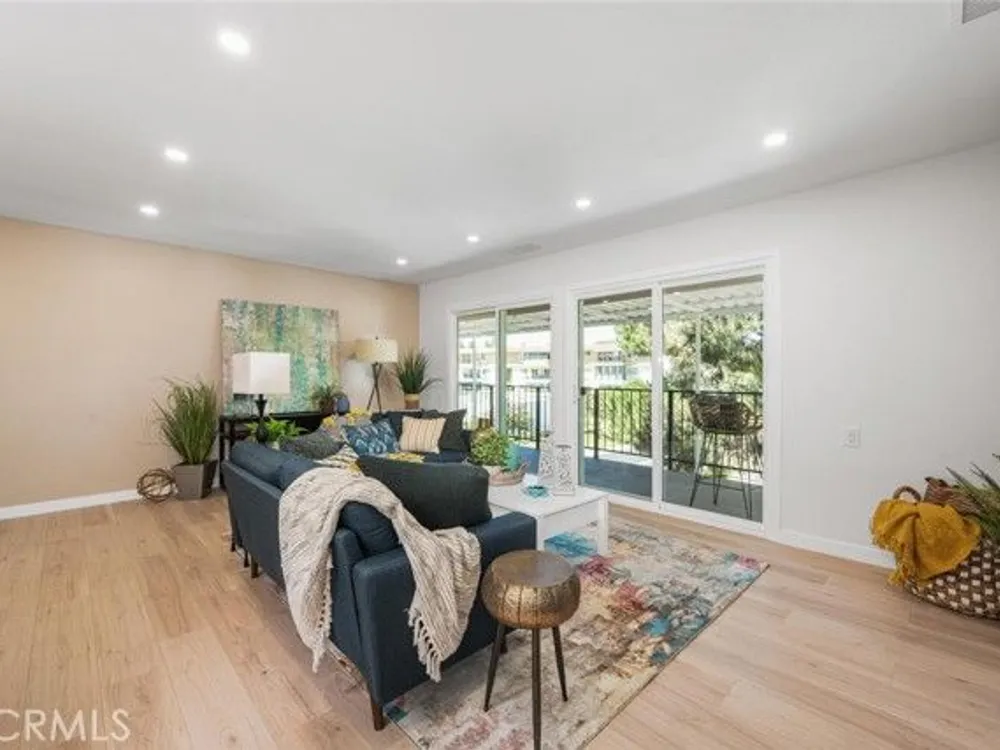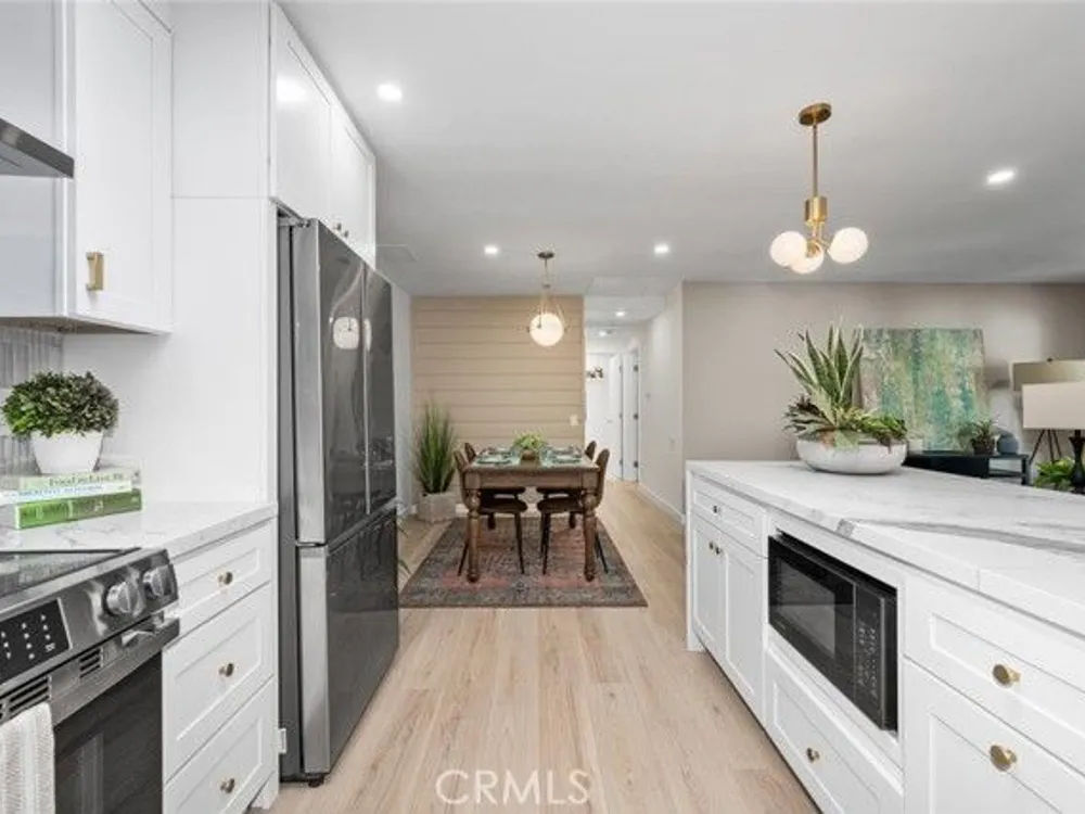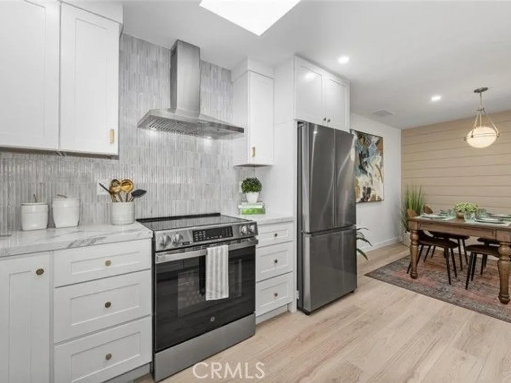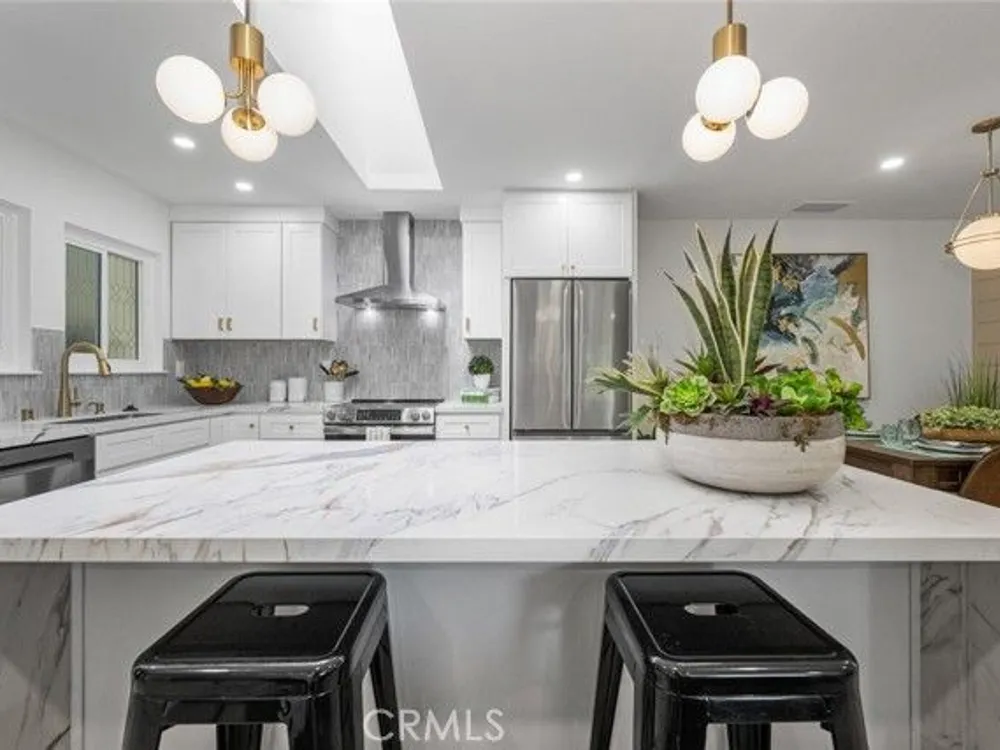 Welcome to this beautifully reimagined top-floor Casa Contenta model home, located in the desirable Third Mutual of Laguna Woods! Step inside to discover a stunning open-concept living space featuring recessed lighting and a custom floor-to-ceiling stone electric fireplace that serves as a striking focal point. Expansive dual-pane sliding doors bring the outdoors in, creating a serene, treehouse-like ambiance with an exceptional sense of privacy—no neighbors in sight. Natural light floods the home through a dramatic skylight that spans the width of the kitchen. The kitchen itself is a true showstopper, thoughtfully updated with sleek quartz countertops, stainless steel appliances, Shaker-style cabinetry, pendant lighting, and an oversized island with a breakfast bar—perfect for entertaining. Adjacent to the kitchen is a dedicated dining area accented by stylish custom lighting fixtures, ideal for hosting dinner parties or casual meals. Down the hallway, you'll find a beautifully updated guest bathroom featuring a new vanity, a fully tiled roll-in shower, and a glass enclosure. The unique floor plan includes a private primary suite, complete with a luminous white bathroom boasting quartz counters, a tiled floor, and a low-threshold glass-enclosed shower. Additional highlights include high-quality laminate flooring throughout, central air conditioning, and an in-unit washer and dryer for your convenience.This home is ideally situated within Laguna Woods, allowing residents to take full advantage of its amenities. Laguna Woods Village residents are privileged to enjoy a 27-hole championship golf course, a 9-hole executive par 3 course, pickleball and tennis courts, lawn bowling, gyms, clubhouses, swimming pools, horse stables, gardening centers, an art studio, a world-class wood shop, computer workrooms and classes + over 200 clubs and organizations!