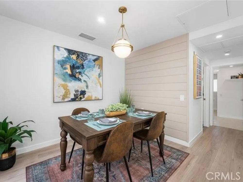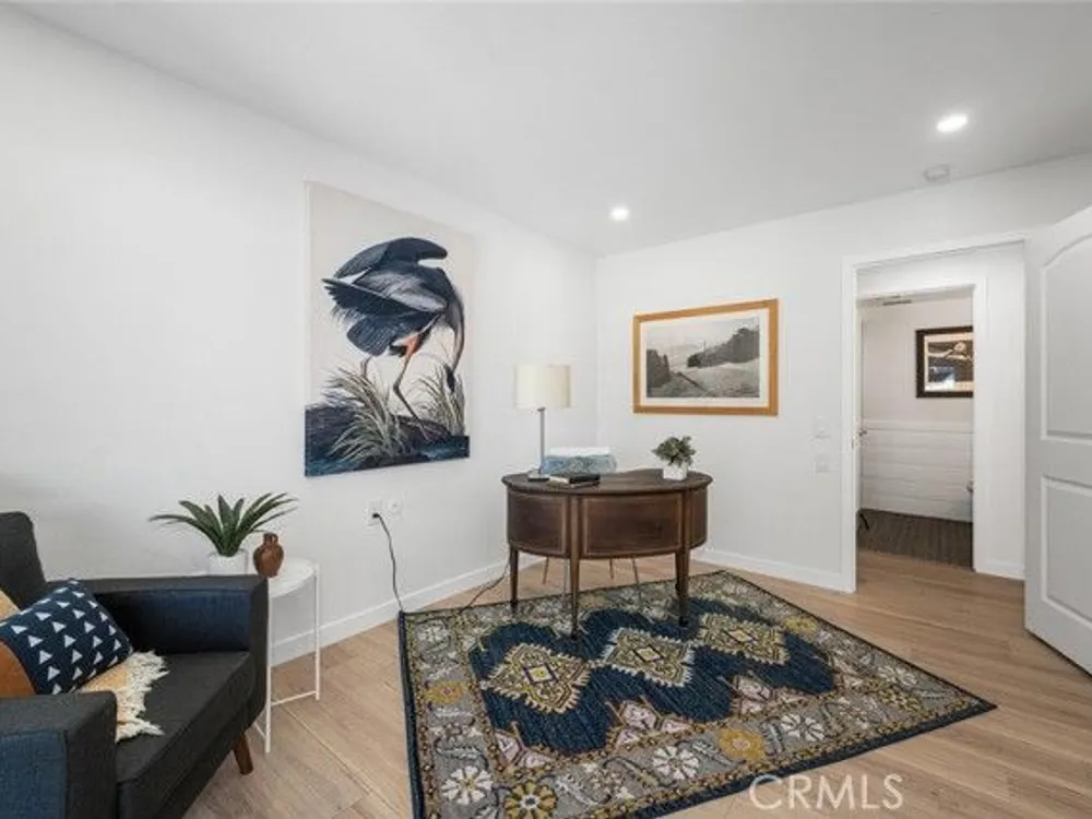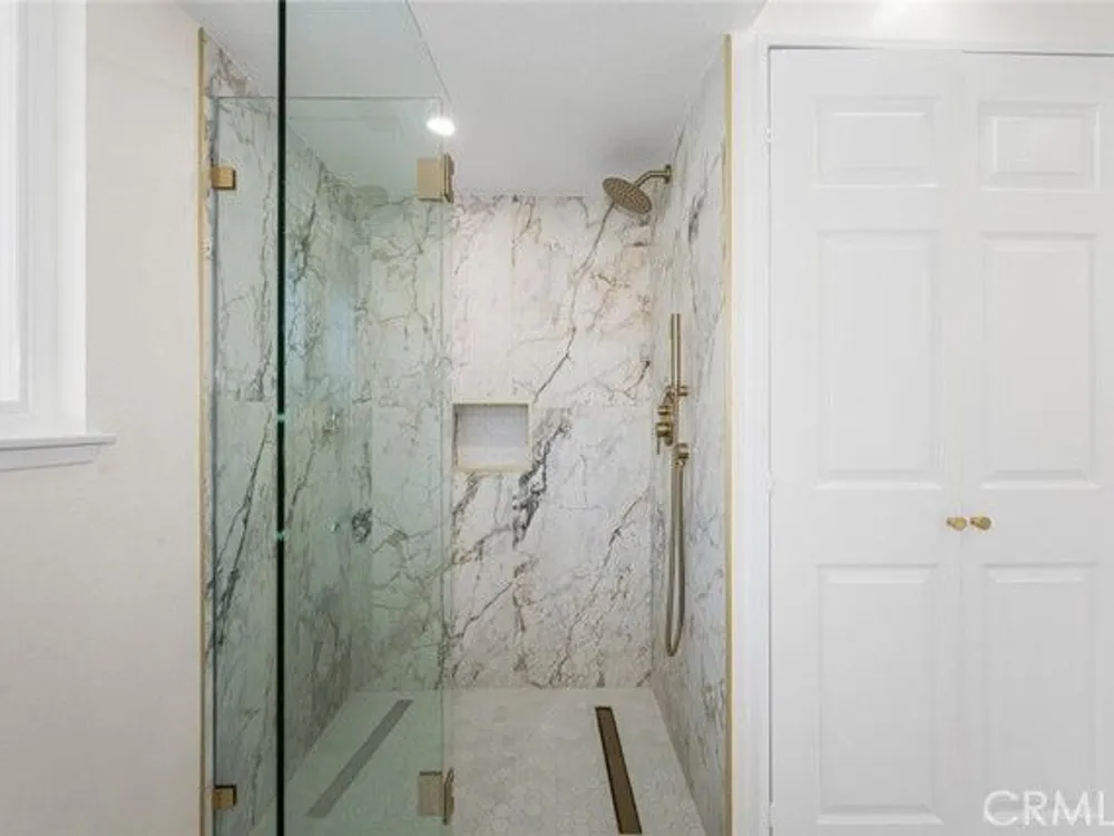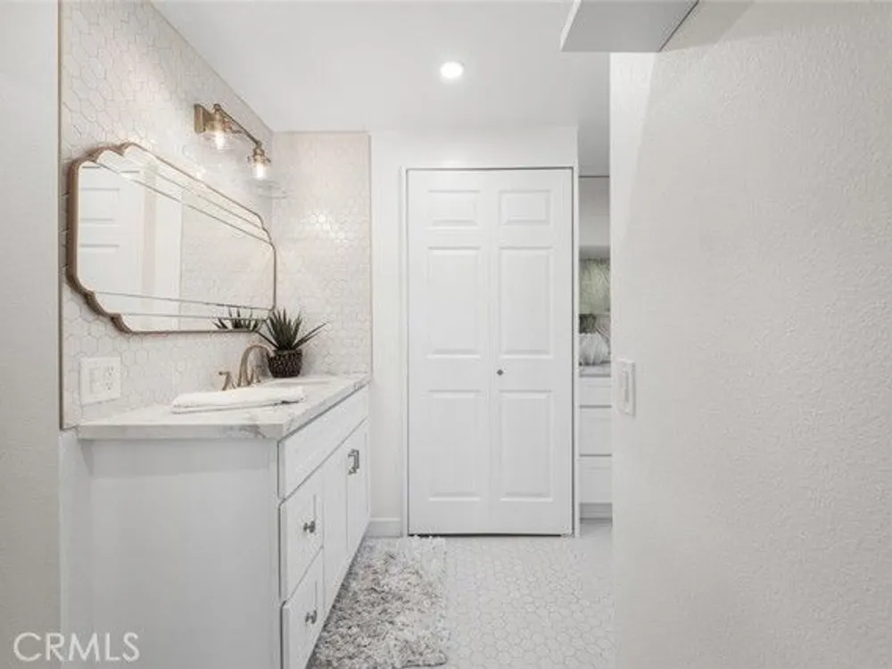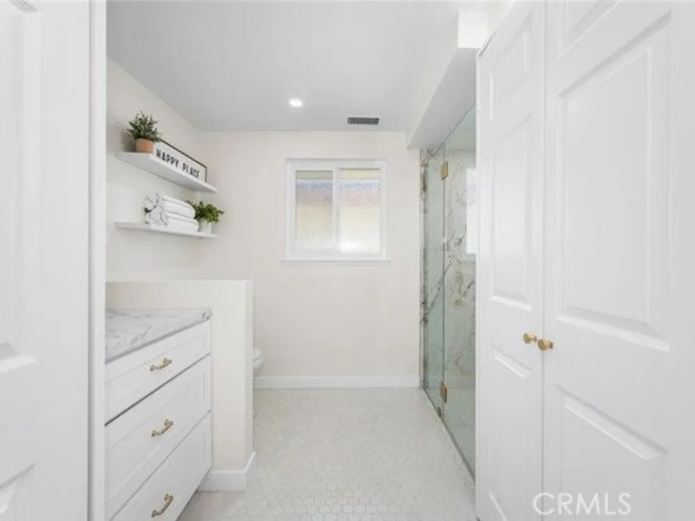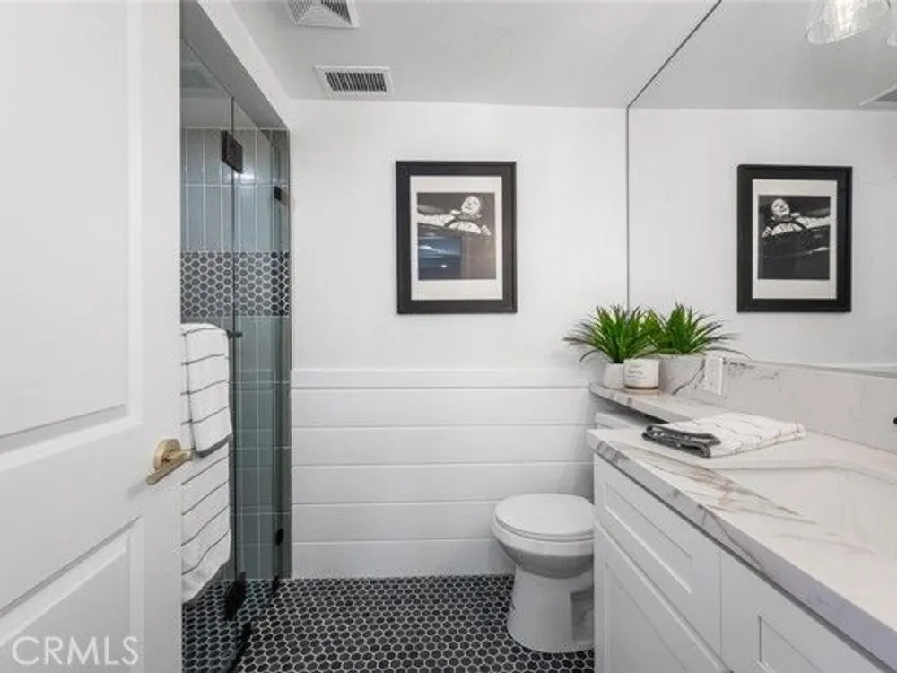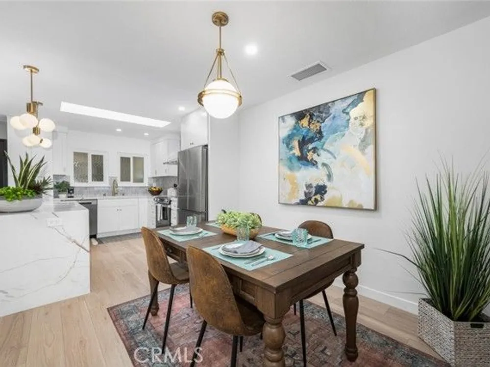 Welcome to this beautifully reimagined top-floor Casa Contenta model home, located in the desirable Third Mutual of Laguna Woods! Step inside to discover a stunning open-concept living space featuring recessed lighting and a custom floor-to-ceiling stone electric fireplace that serves as a striking focal point. Expansive dual-pane sliding doors bring the outdoors in, creating a serene, treehouse-like ambiance with an exceptional sense of privacy—no neighbors in sight. Natural light floods the home through a dramatic skylight that spans the width of the kitchen. The kitchen itself is a true showstopper, thoughtfully updated with sleek quartz countertops, stainless steel appliances, Shaker-style cabinetry, pendant lighting, and an oversized island with a breakfast bar—perfect for entertaining. Adjacent to the kitchen is a dedicated dining area accented by stylish custom lighting fixtures, ideal for hosting dinner parties or casual meals. Down the hallway, you'll find a beautifully updated guest bathroom featuring a new vanity, a fully tiled roll-in shower, and a glass enclosure. The unique floor plan includes a private primary suite, complete with a luminous white bathroom boasting quartz counters, a tiled floor, and a low-threshold glass-enclosed shower. Additional highlights include high-quality laminate flooring throughout, central air conditioning, and an in-unit washer and dryer for your convenience.This home is ideally situated within Laguna Woods, allowing residents to take full advantage of its amenities. Laguna Woods Village residents are privileged to enjoy a 27-hole championship golf course, a 9-hole executive par 3 course, pickleball and tennis courts, lawn bowling, gyms, clubhouses, swimming pools, horse stables, gardening centers, an art studio, a world-class wood shop, computer workrooms and classes + over 200 clubs and organizations!