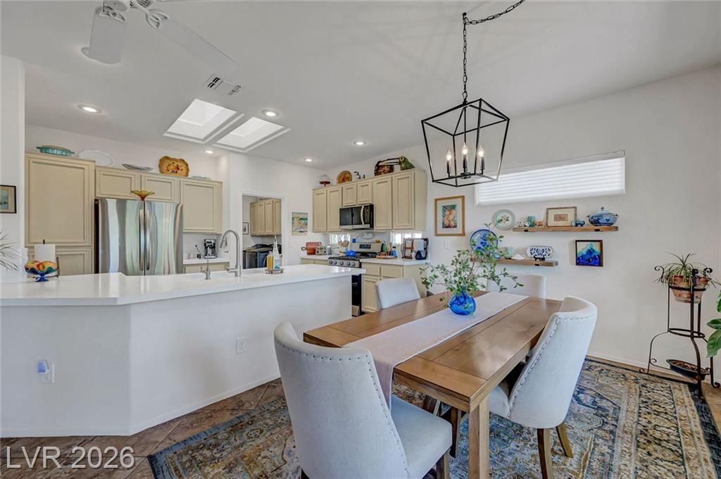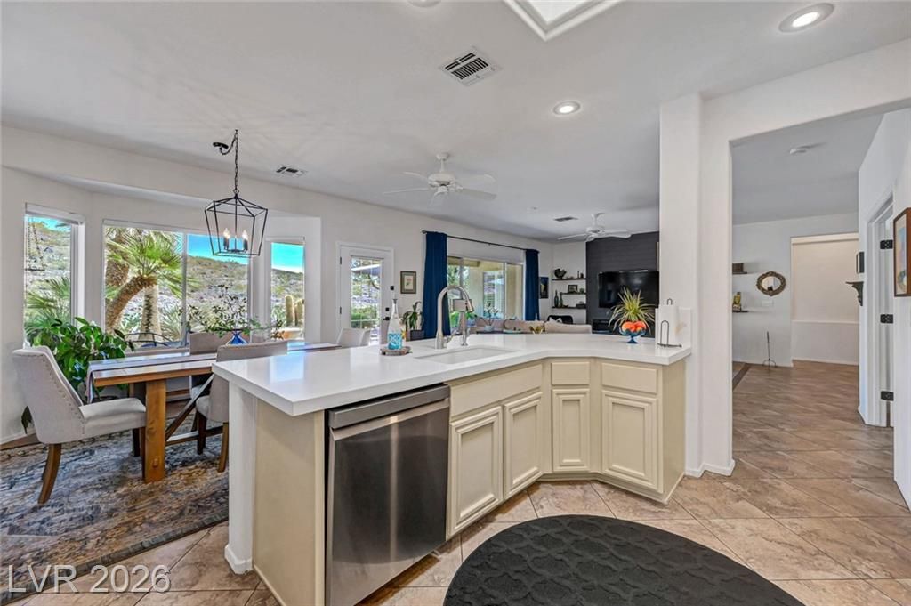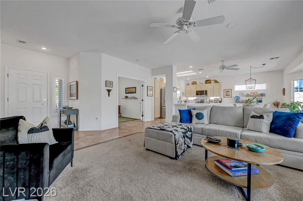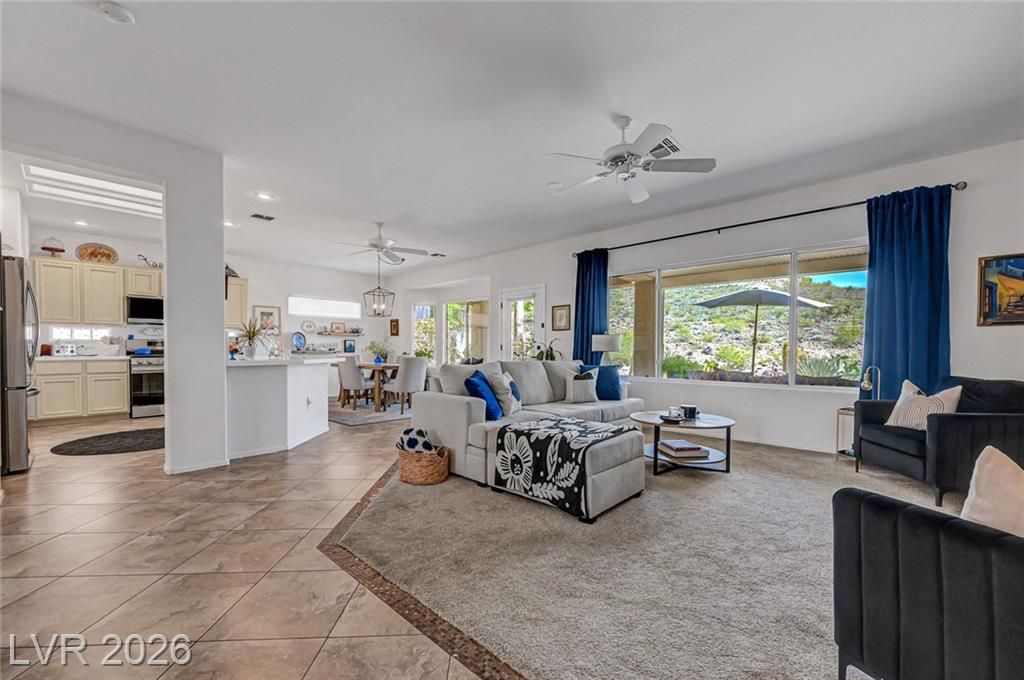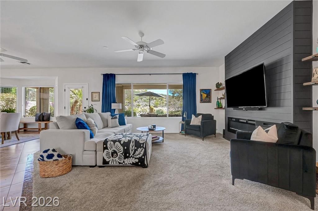 Welcome to this stunning Monroe model nestled in the 55+ community of Sun City Anthem! Thoughtfully designed, this property offers a bright and open floor plan with spacious living area perfect for both relaxing and entertaining. Living room has a custom fireplace and newer carpet. The kitchen features sleek, quartz countertops, ample cabinetry, pantry, and a newer sink, stove, microwave, and dishwasher. Den can be used as an office or a 3rd bedroom. Garage is 2 car with epoxy floor, newer water heater, and cabinets for storage. Step outside to a beautifully maintained backyard, with a covered paver patio, water fountain, and an amazing view of the open desert terrain. Sun City Anthem is a 55+ age-restricted community and lifestyle where residents enjoy 3 Clubhouses, 2 restaurants, 2 golf courses, swimming pools/spas, tennis, pickleball, club activities, and an active social calendar Don’t miss your opportunity to make it yours!