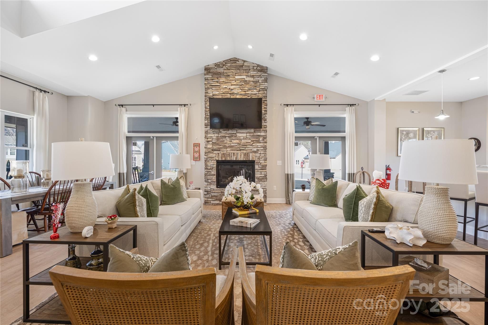 Discover easy living in this beautiful 2-bedroom plus flex room, 2.5-bath home in a boutique 55+ community! Tucked on a private lot with only one neighboring home and fountain pond view with a wooded view in back. The open layout feels bright and welcoming, featuring luxury vinyl plank floors and a gorgeous kitchen with a large island, upgraded white cabinets, granite counters, gas range, and built-in buffet. Relax by the cozy gas fireplace or unwind in the spacious primary suite with a spa-style bath and walk-in closet. Guests will love their own ensuite bedroom! Ceiling fans in both bedrooms, updated lighting, laundry with cabinets (washer/dryer convey), irrigation, and 2-car garage with utility sink. Located across from the clubhouse with a fitness room, bocce court, fire pit, and dog park. HOA covers lawn care—so you can spend more time enjoying life! Refrigerator and washer/dryer included!