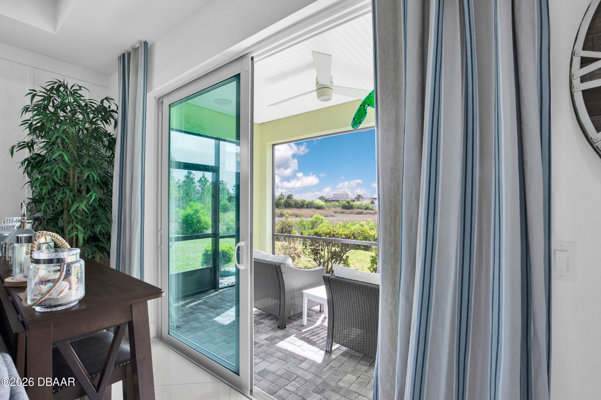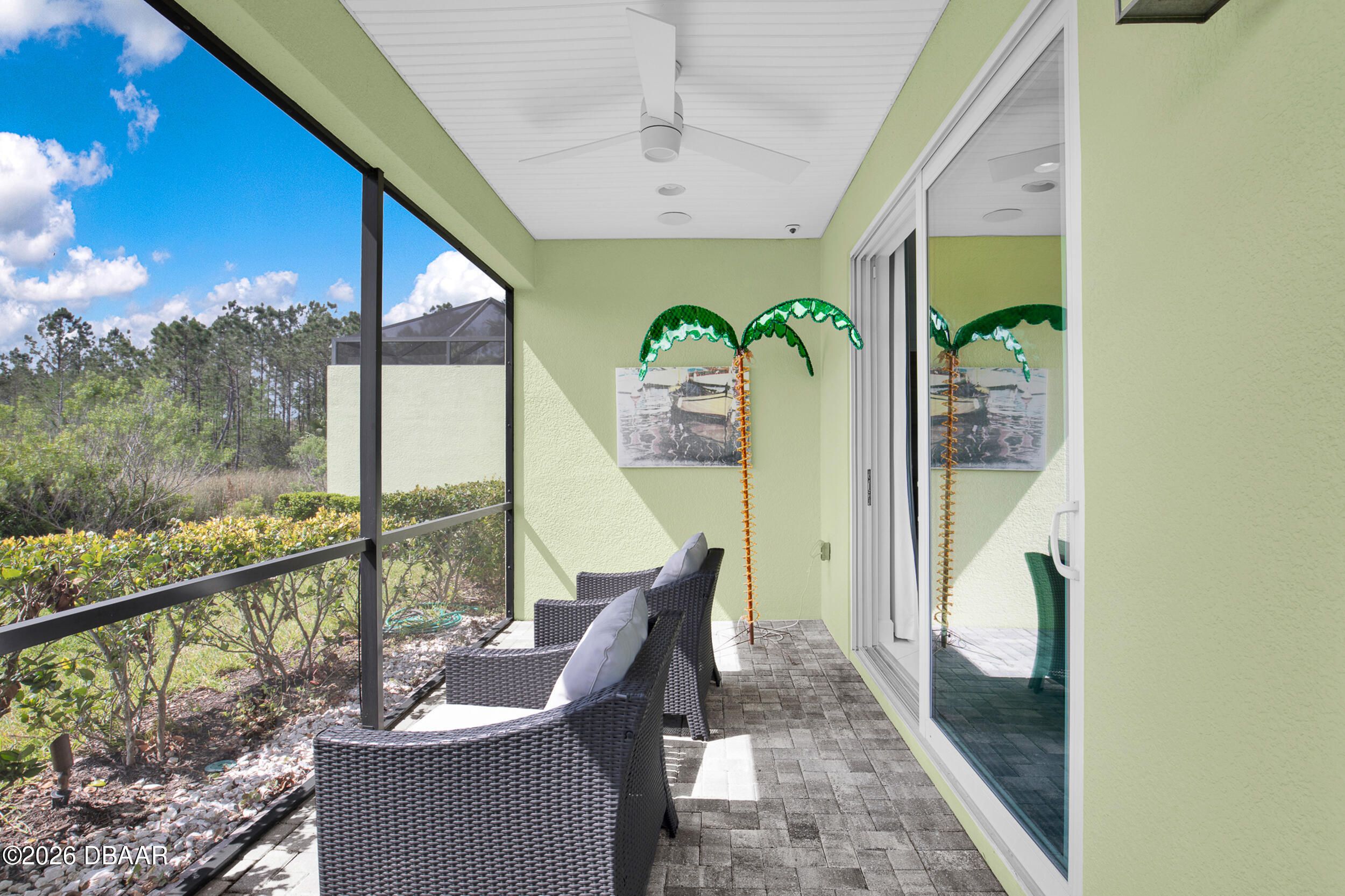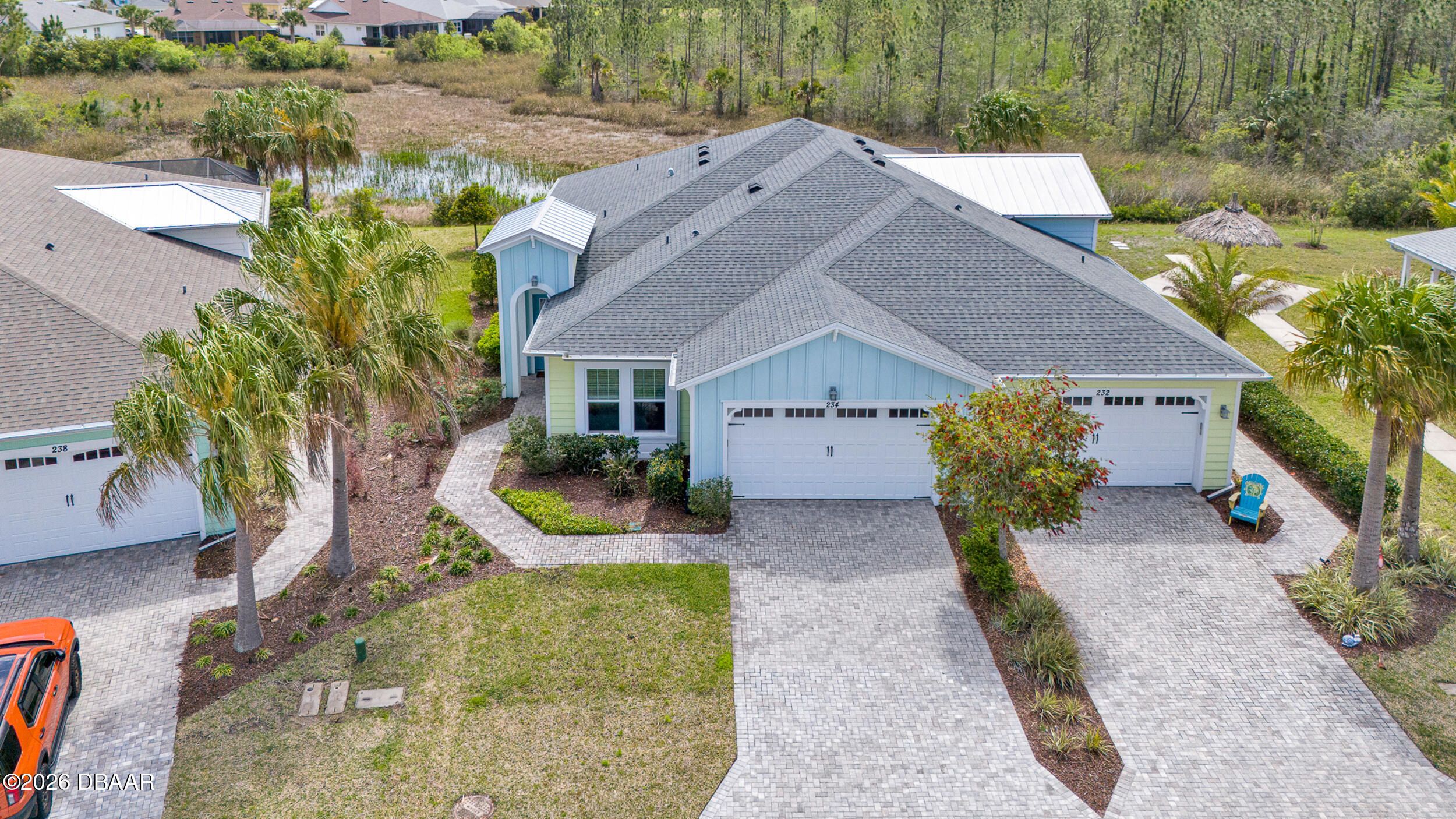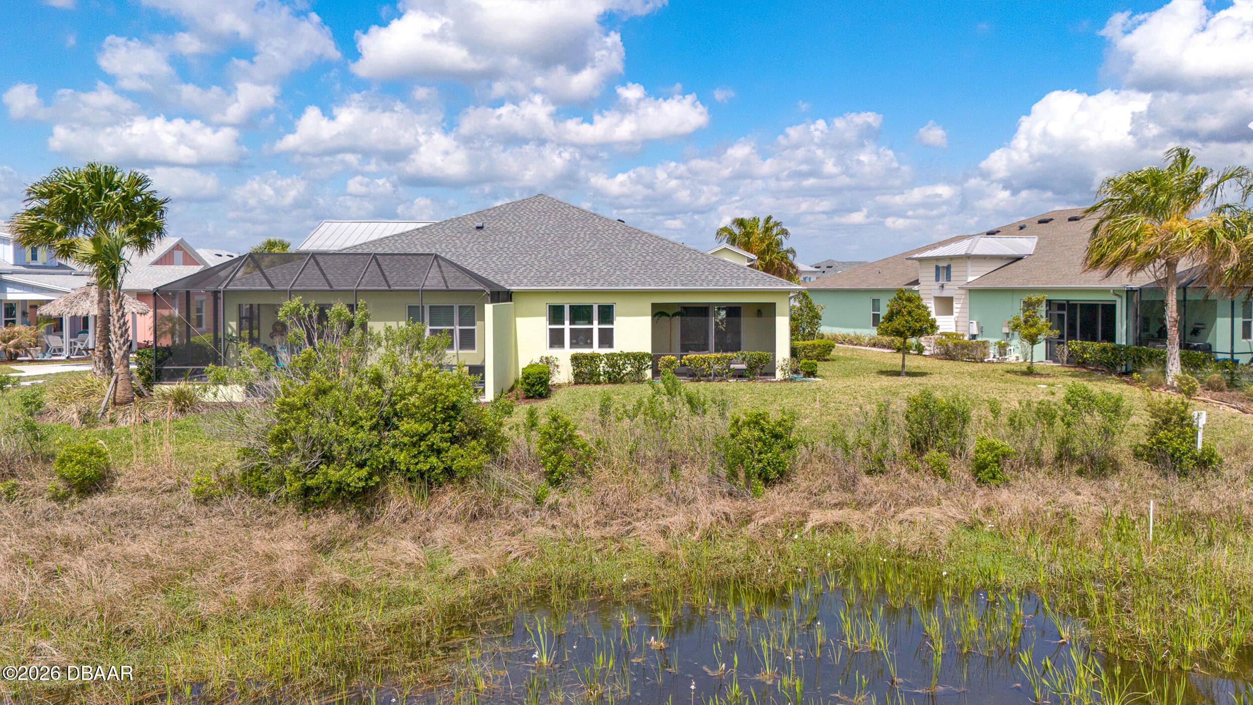 Enjoy coastal living in the highly coveted & gated Latitude Margaritaville, Daytona Beach, FL. This delightful Barbuda Villa comes with custom designer details throughout & impact glass windows & front door. A previous model home on premium lot that overlooks a natural pond & conservation area. SO CLOSE to Town Square & amenities.Relax in the mornings with a cup of coffee & watch the flocks of birds & wildlife gather on the tranquil natural preserve. Sunrise fills the house with daylight throughout the day. This light & bright 2-bed, 2-bath home offers 1778 sqft of beautifully designed living space, featuring a front facing main entrance & guest room windows, alarm system, whole home audio with stereo speakers in primary suite, living room, den/study & guest room, high end 24'' square floor tile set on diagonal throughout. Custom window treatments, Spacious living room accented with custom designer wall treatments & paint. The large kitchen impresses with 42 in high crown-molded With quartz counter tops and matching backsplash & high end range, dishwasher, microwave. The serene primary suite captures peaceful water views of the preserve. The ensuite bathroom and shower boast upgraded tile and seamless glass enclosure, dual sinks, granite counter top and large primary closet. The Executive den/study comes complete with wet bar, space for beverage cooler, custom paint and lighting package, and beautiful ceiling fan. The laundry room has front-loading matching washer and dryer plus built-in wall and base cabinets. Ability to Expand the screened in lanai to take in even more of the nature preserve. Storage rack in garage . Within walking distance to Latitude Margaritaville Town Center that features, Pickleball and Tennis courts, Gym, Latitude Bar & Chill Restaurant, and last Mango Theater, which are just some of the amazing amenities in this unique community.