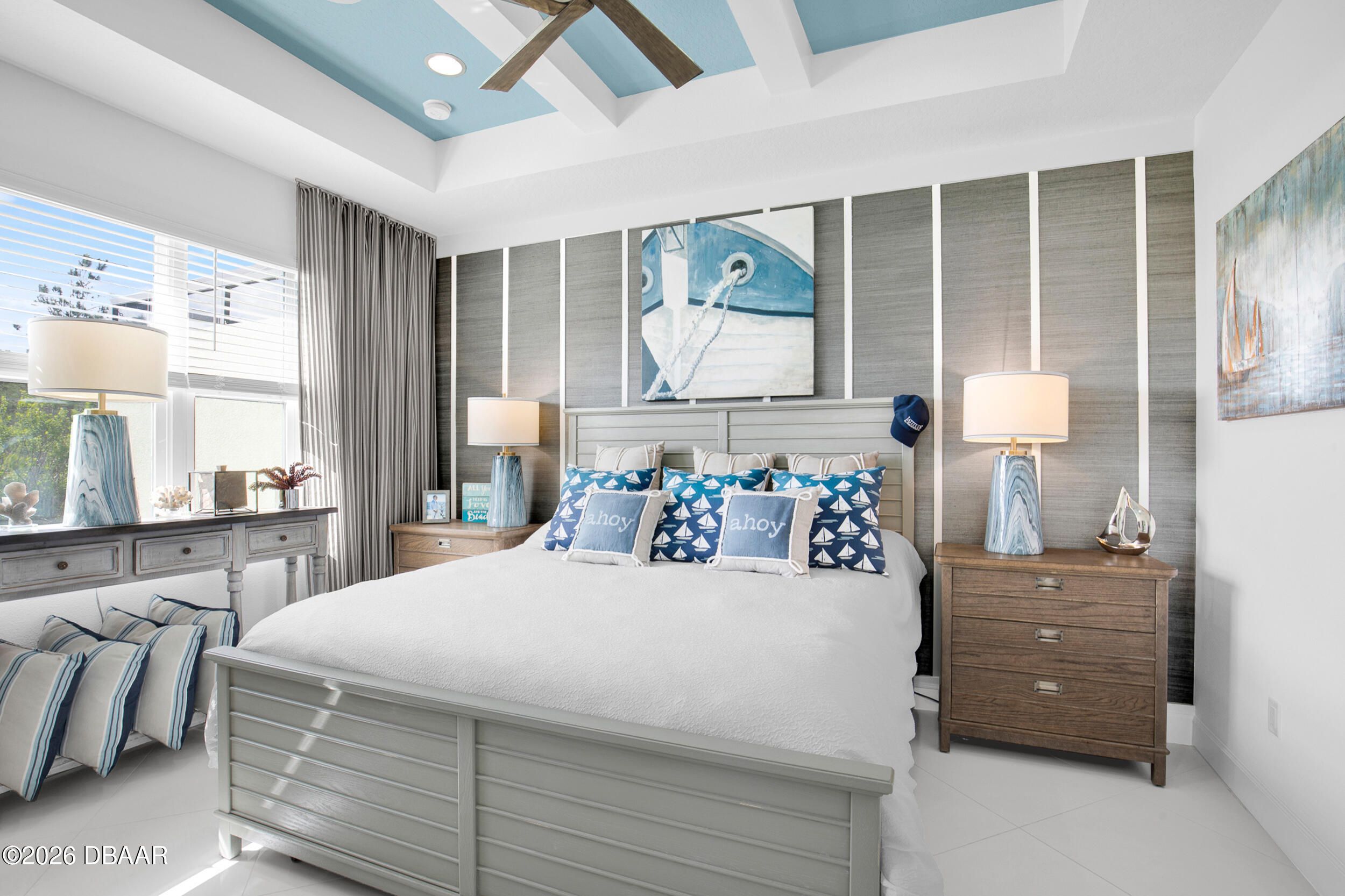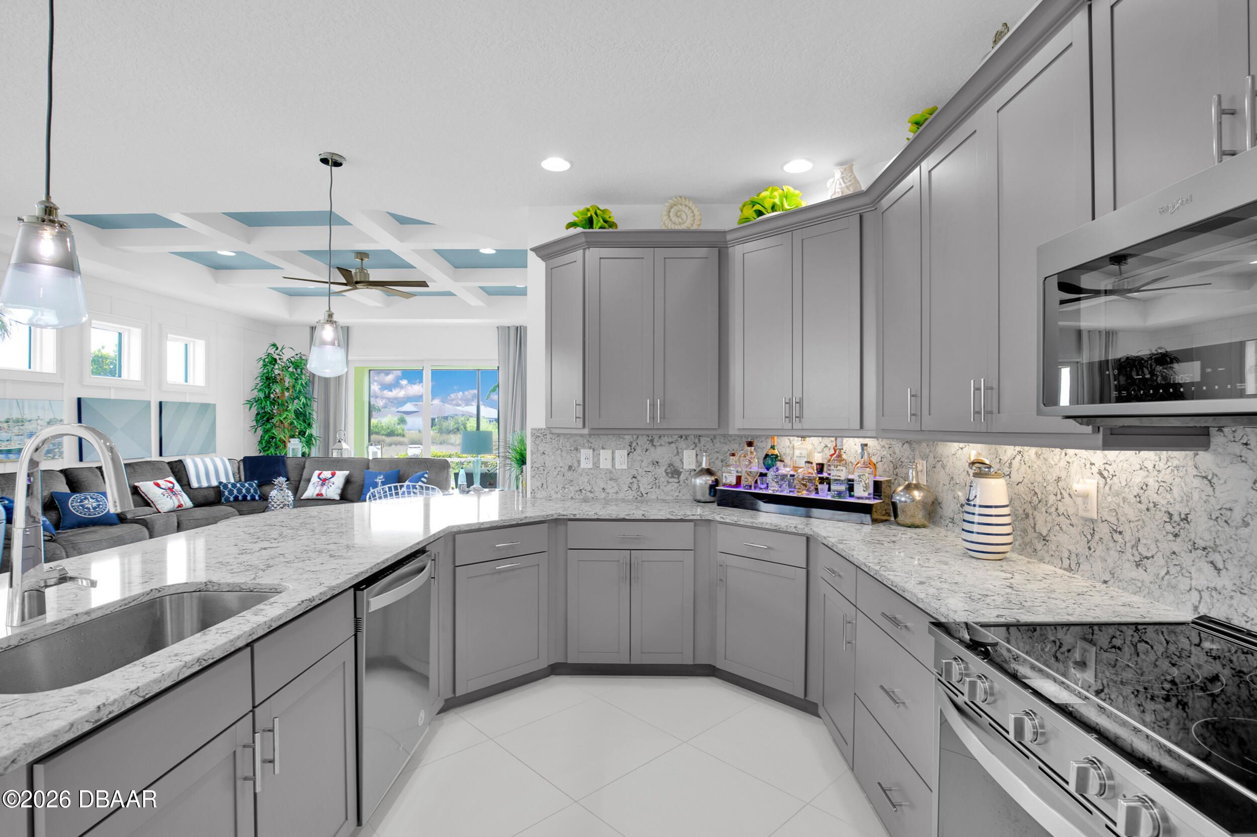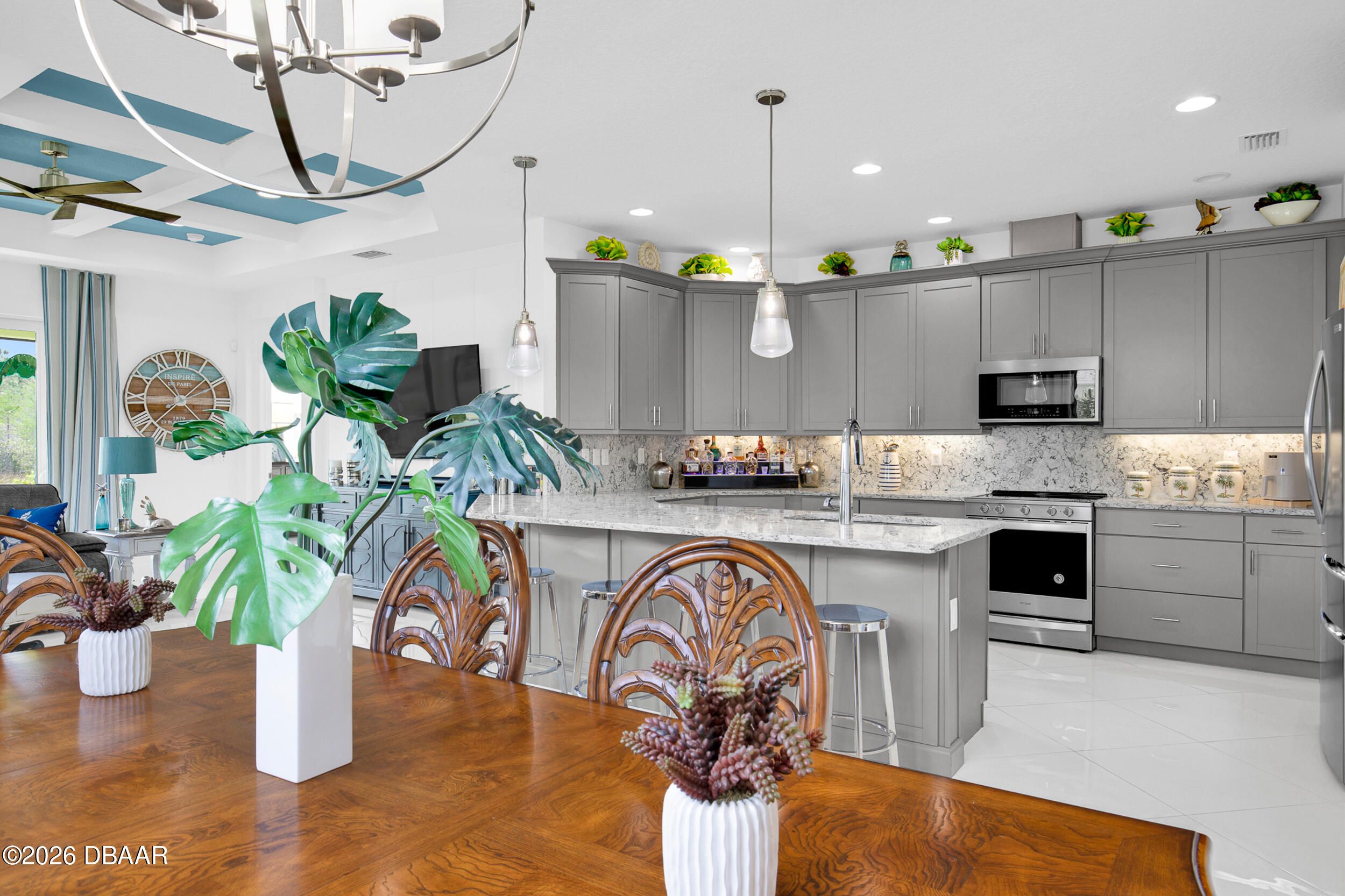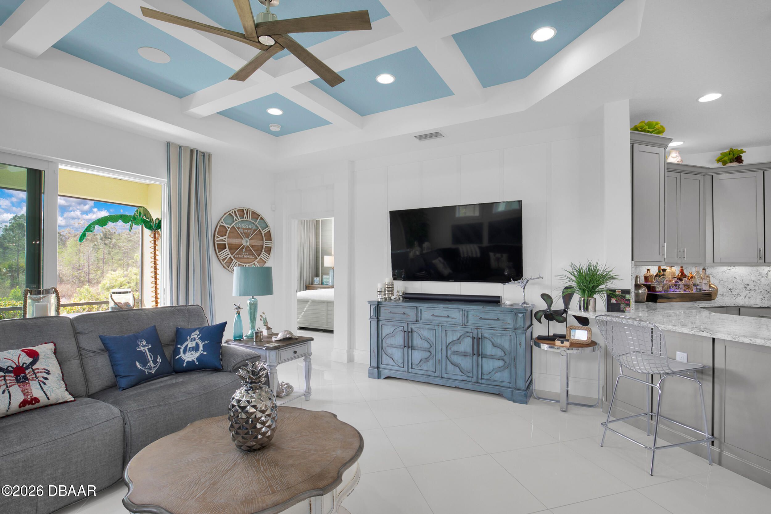 Enjoy coastal living in the highly coveted & gated Latitude Margaritaville, Daytona Beach, FL. This delightful Barbuda Villa comes with custom designer details throughout & impact glass windows & front door. A previous model home on premium lot that overlooks a natural pond & conservation area. SO CLOSE to Town Square & amenities.Relax in the mornings with a cup of coffee & watch the flocks of birds & wildlife gather on the tranquil natural preserve. Sunrise fills the house with daylight throughout the day. This light & bright 2-bed, 2-bath home offers 1778 sqft of beautifully designed living space, featuring a front facing main entrance & guest room windows, alarm system, whole home audio with stereo speakers in primary suite, living room, den/study & guest room, high end 24'' square floor tile set on diagonal throughout. Custom window treatments, Spacious living room accented with custom designer wall treatments & paint. The large kitchen impresses with 42 in high crown-molded With quartz counter tops and matching backsplash & high end range, dishwasher, microwave. The serene primary suite captures peaceful water views of the preserve. The ensuite bathroom and shower boast upgraded tile and seamless glass enclosure, dual sinks, granite counter top and large primary closet. The Executive den/study comes complete with wet bar, space for beverage cooler, custom paint and lighting package, and beautiful ceiling fan. The laundry room has front-loading matching washer and dryer plus built-in wall and base cabinets. Ability to Expand the screened in lanai to take in even more of the nature preserve. Storage rack in garage . Within walking distance to Latitude Margaritaville Town Center that features, Pickleball and Tennis courts, Gym, Latitude Bar & Chill Restaurant, and last Mango Theater, which are just some of the amazing amenities in this unique community.