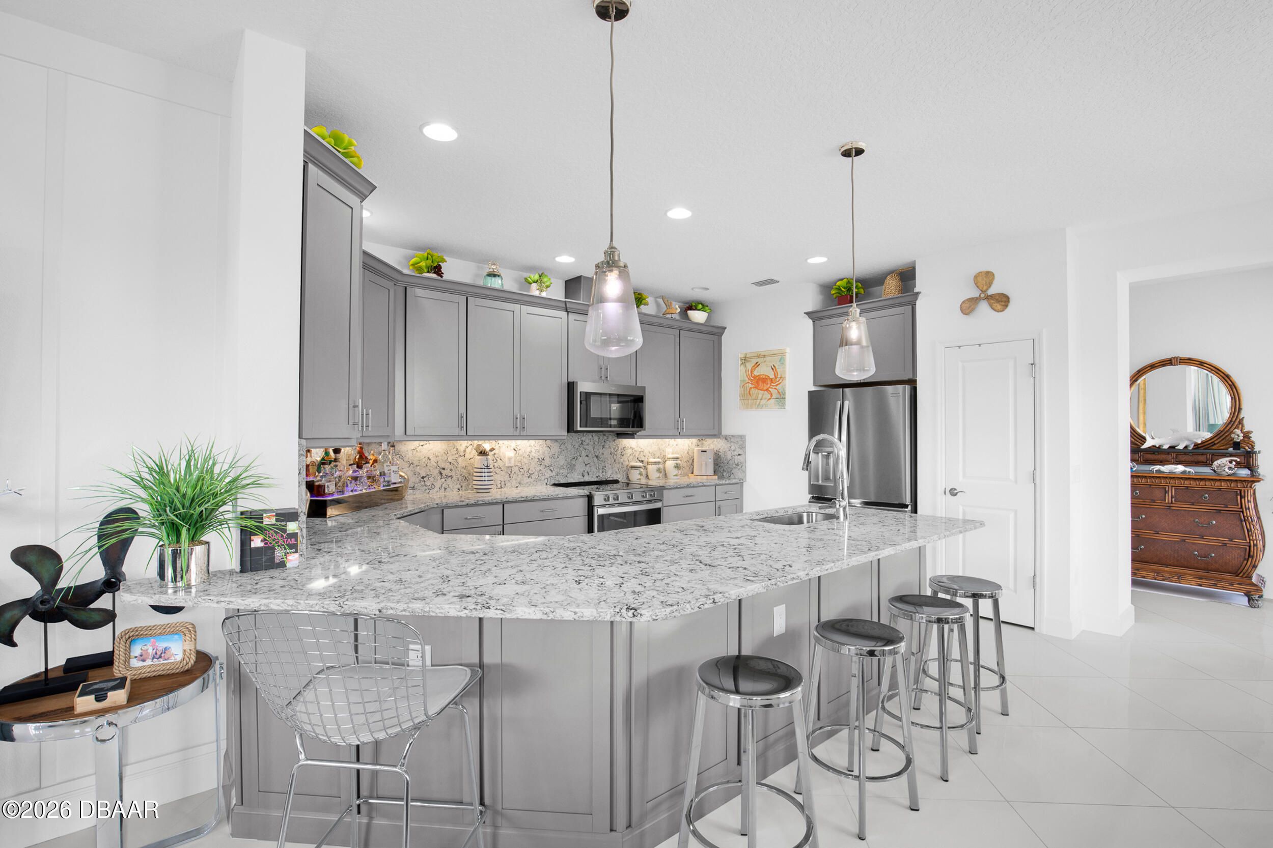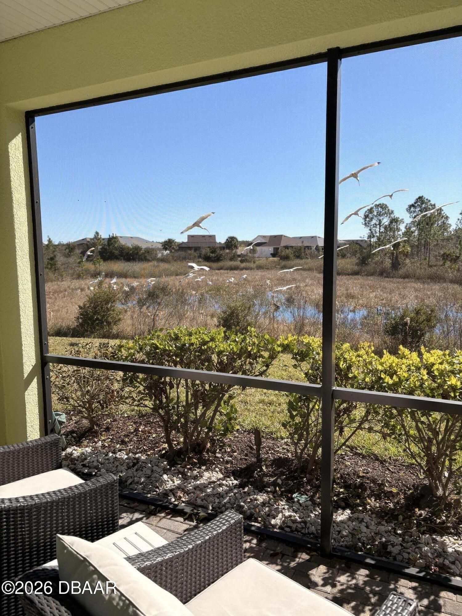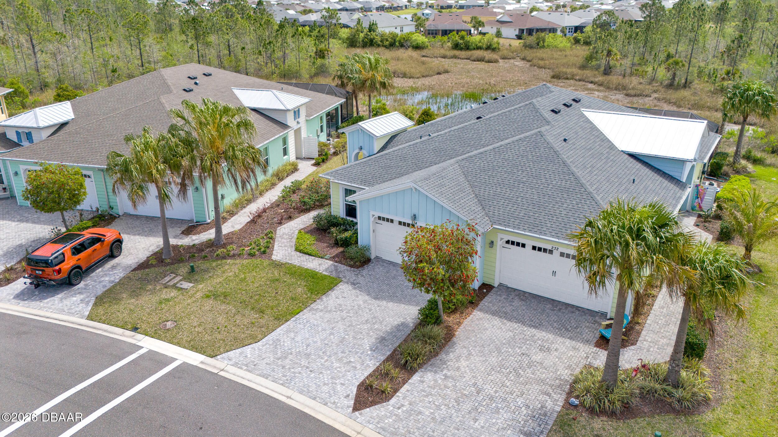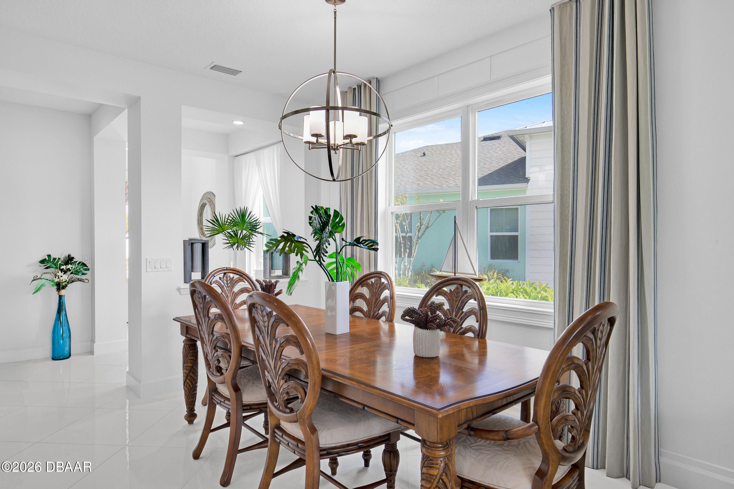 Enjoy coastal living in the highly coveted & gated Latitude Margaritaville, Daytona Beach, FL. This delightful Barbuda Villa comes with custom designer details throughout & impact glass windows & front door. A previous model home on premium lot that overlooks a natural pond & conservation area. SO CLOSE to Town Square & amenities.Relax in the mornings with a cup of coffee & watch the flocks of birds & wildlife gather on the tranquil natural preserve. Sunrise fills the house with daylight throughout the day. This light & bright 2-bed, 2-bath home offers 1778 sqft of beautifully designed living space, featuring a front facing main entrance & guest room windows, alarm system, whole home audio with stereo speakers in primary suite, living room, den/study & guest room, high end 24'' square floor tile set on diagonal throughout. Custom window treatments, Spacious living room accented with custom designer wall treatments & paint. The large kitchen impresses with 42 in high crown-molded With quartz counter tops and matching backsplash & high end range, dishwasher, microwave. The serene primary suite captures peaceful water views of the preserve. The ensuite bathroom and shower boast upgraded tile and seamless glass enclosure, dual sinks, granite counter top and large primary closet. The Executive den/study comes complete with wet bar, space for beverage cooler, custom paint and lighting package, and beautiful ceiling fan. The laundry room has front-loading matching washer and dryer plus built-in wall and base cabinets. Ability to Expand the screened in lanai to take in even more of the nature preserve. Storage rack in garage . Within walking distance to Latitude Margaritaville Town Center that features, Pickleball and Tennis courts, Gym, Latitude Bar & Chill Restaurant, and last Mango Theater, which are just some of the amazing amenities in this unique community.