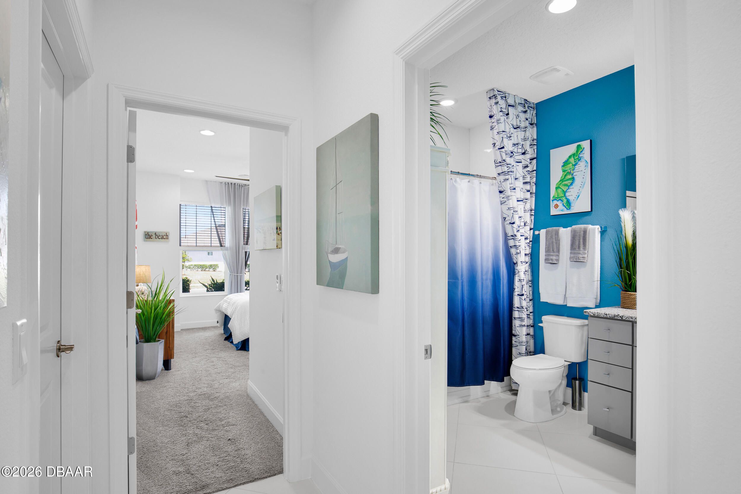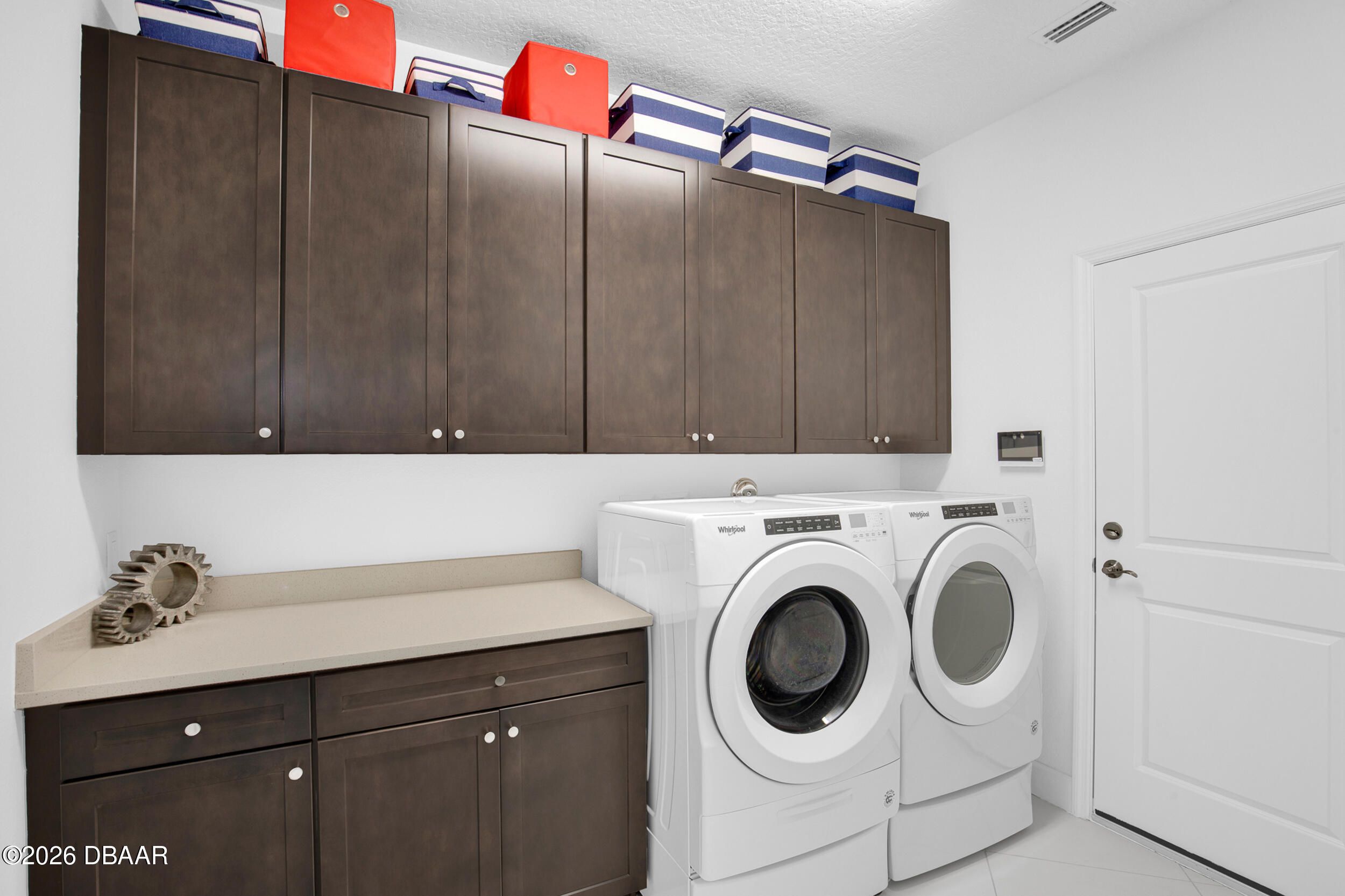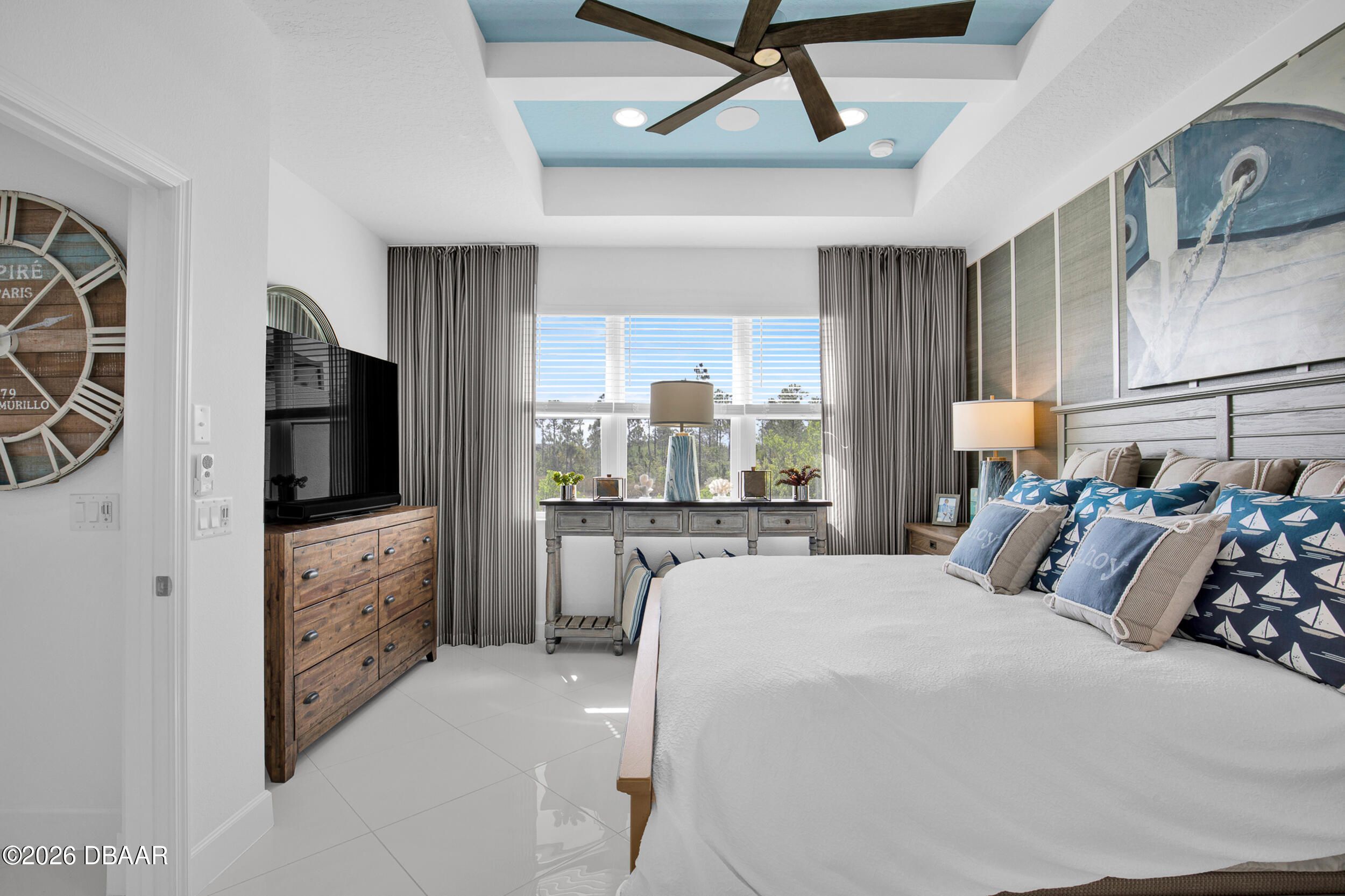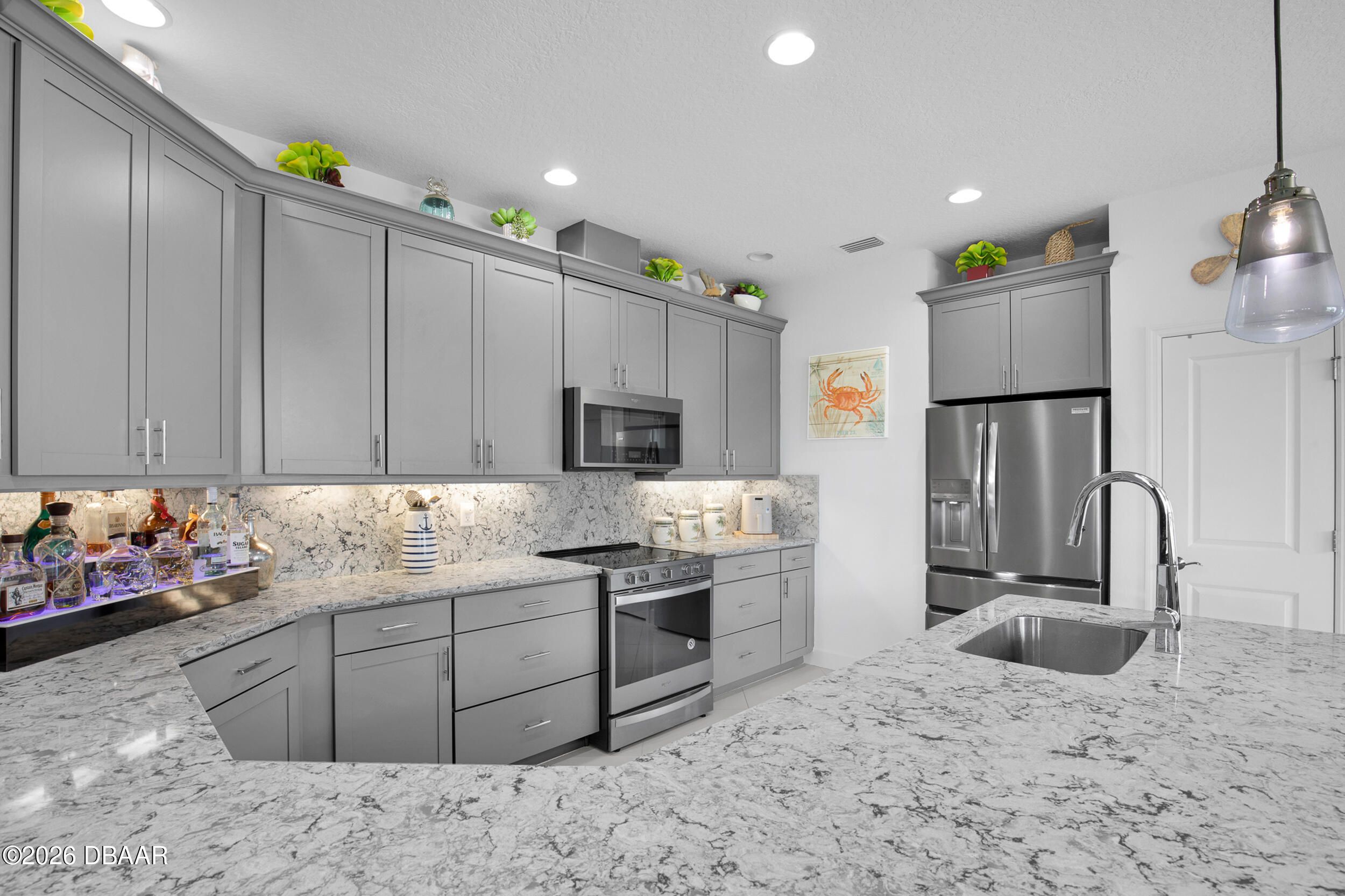 Enjoy coastal living in the highly coveted & gated Latitude Margaritaville, Daytona Beach, FL. This delightful Barbuda Villa comes with custom designer details throughout & impact glass windows & front door. A previous model home on premium lot that overlooks a natural pond & conservation area. SO CLOSE to Town Square & amenities.Relax in the mornings with a cup of coffee & watch the flocks of birds & wildlife gather on the tranquil natural preserve. Sunrise fills the house with daylight throughout the day. This light & bright 2-bed, 2-bath home offers 1778 sqft of beautifully designed living space, featuring a front facing main entrance & guest room windows, alarm system, whole home audio with stereo speakers in primary suite, living room, den/study & guest room, high end 24'' square floor tile set on diagonal throughout. Custom window treatments, Spacious living room accented with custom designer wall treatments & paint. The large kitchen impresses with 42 in high crown-molded With quartz counter tops and matching backsplash & high end range, dishwasher, microwave. The serene primary suite captures peaceful water views of the preserve. The ensuite bathroom and shower boast upgraded tile and seamless glass enclosure, dual sinks, granite counter top and large primary closet. The Executive den/study comes complete with wet bar, space for beverage cooler, custom paint and lighting package, and beautiful ceiling fan. The laundry room has front-loading matching washer and dryer plus built-in wall and base cabinets. Ability to Expand the screened in lanai to take in even more of the nature preserve. Storage rack in garage . Within walking distance to Latitude Margaritaville Town Center that features, Pickleball and Tennis courts, Gym, Latitude Bar & Chill Restaurant, and last Mango Theater, which are just some of the amazing amenities in this unique community.