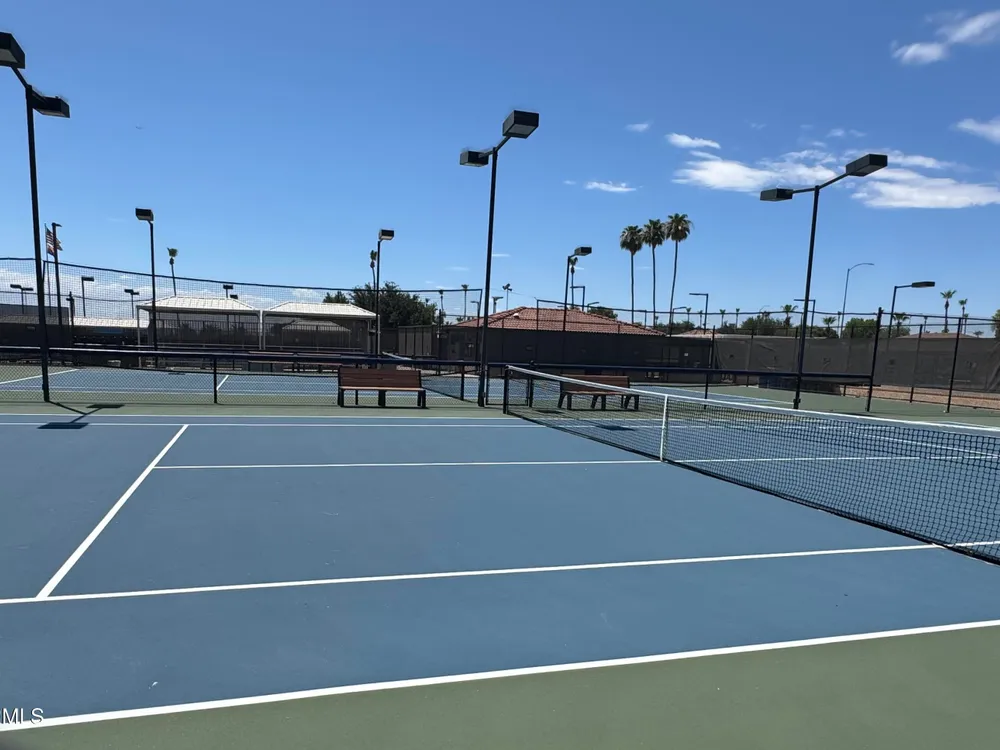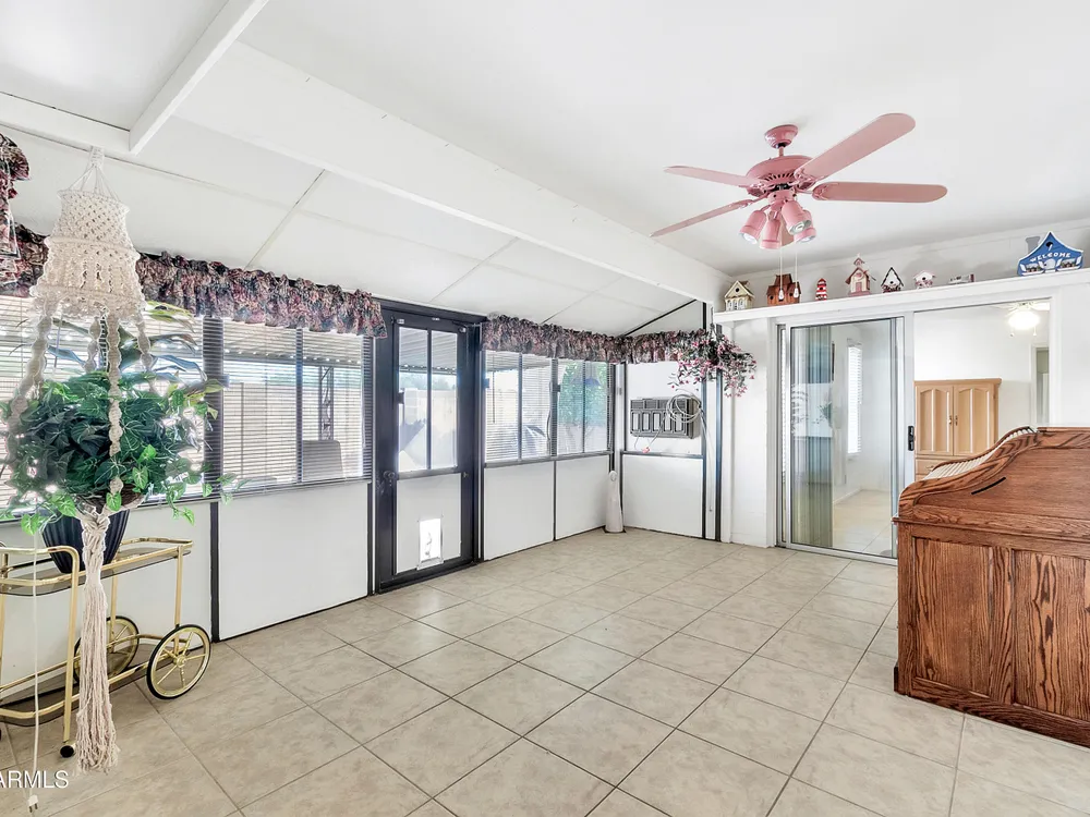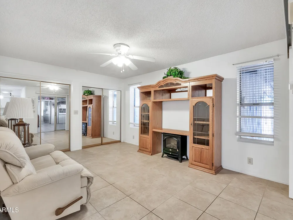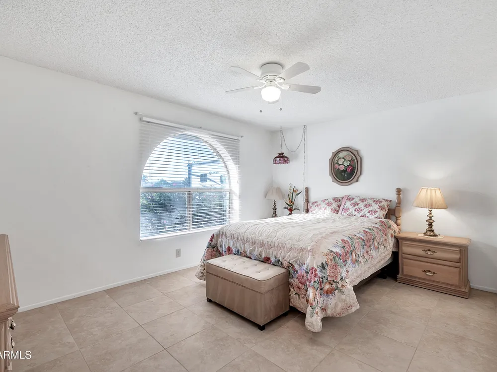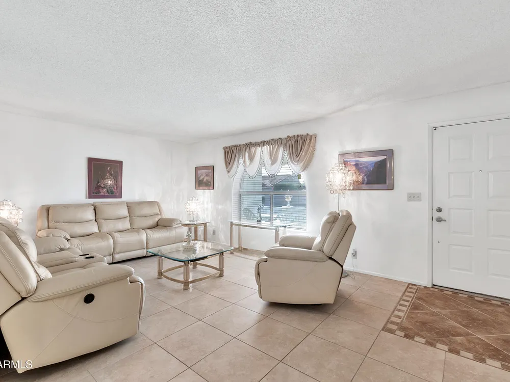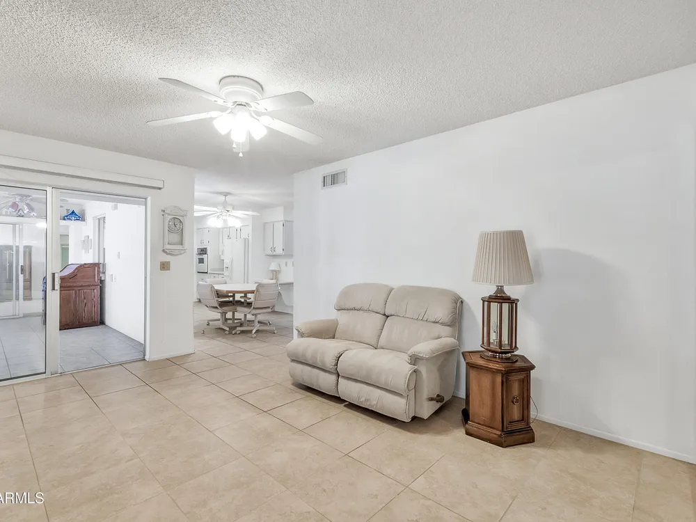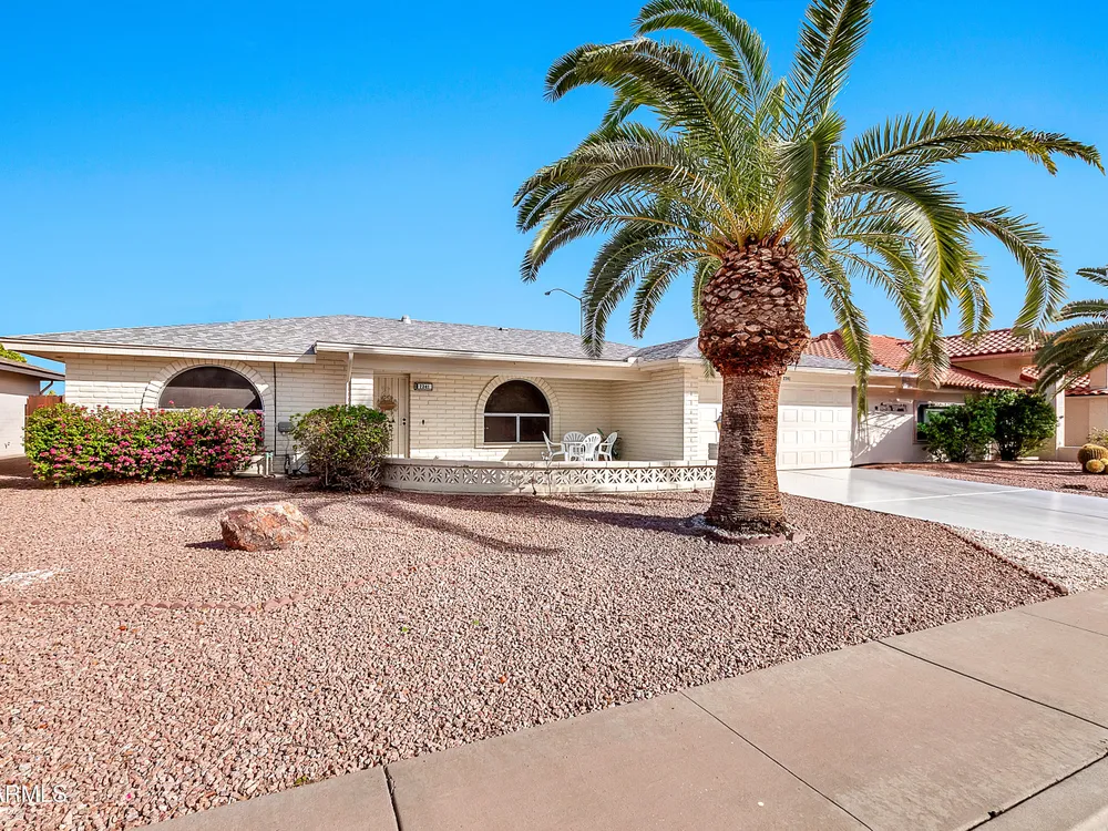 Welcome to this charming and well maintained 2 bed, 2 bath home nestled in a vibrant, highly sought-after 55+ active adult community. While the home retains its original charm, it has been thoughtfully maintained and features an upgraded tile floor throughout for easy care and comfort. Enjoy Arizona's beautiful weather year-round from the bright and airy Arizona room, or step outside to your private backyard oasis, complete with an oversized covered patio and mature citrus trees - perfect for relaxing or entertaining guests. This community is packed with amenities to support an active lifestyle, including multiple pools, a golf course, pickleball and tennis courts, shuffleboard, a fitness center, on-site restaurant, & countless clubs, social activities & more! Whether you're looking for recreation or relaxation, there's always something to enjoy. A fantastic opportunity to personalize a solid home in a vibrant, friendly neighborhood! New AC 2020 / New Water Heater 2019 / Approx 19 years on a 30 year roof.